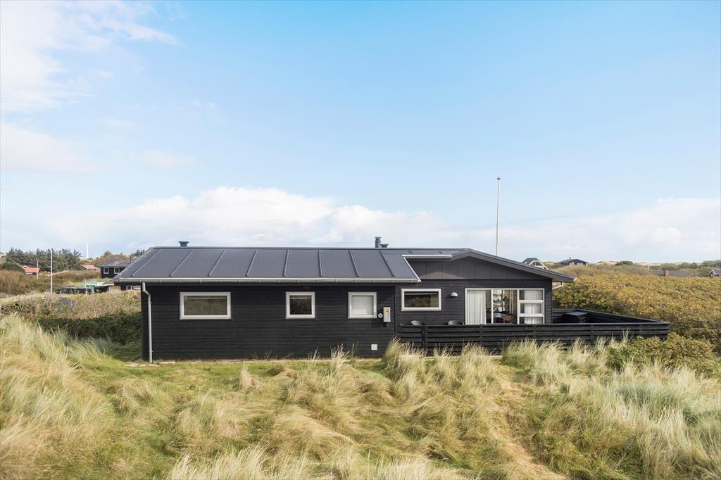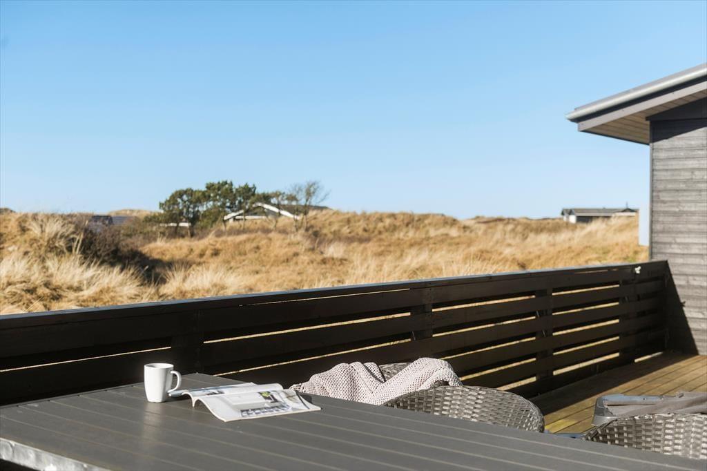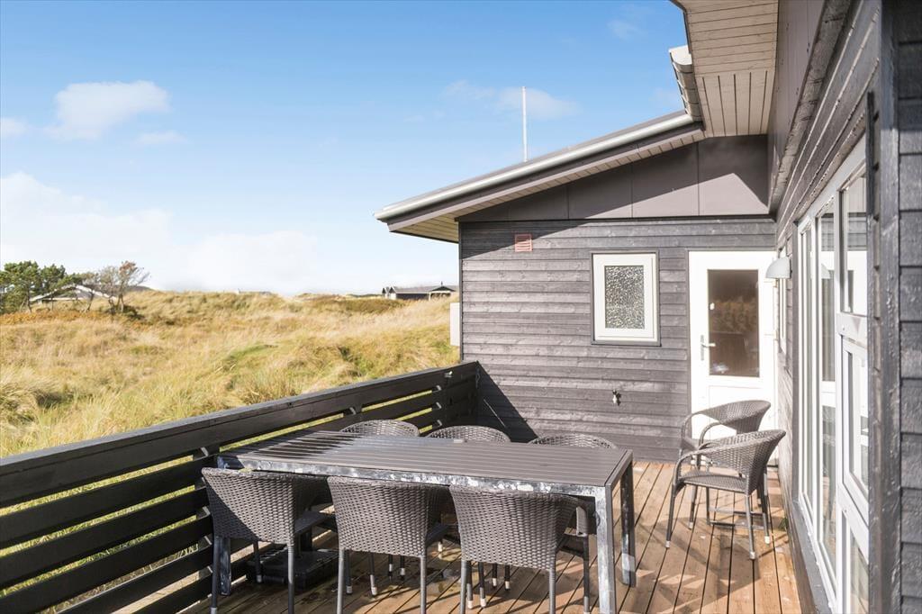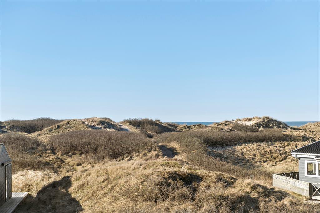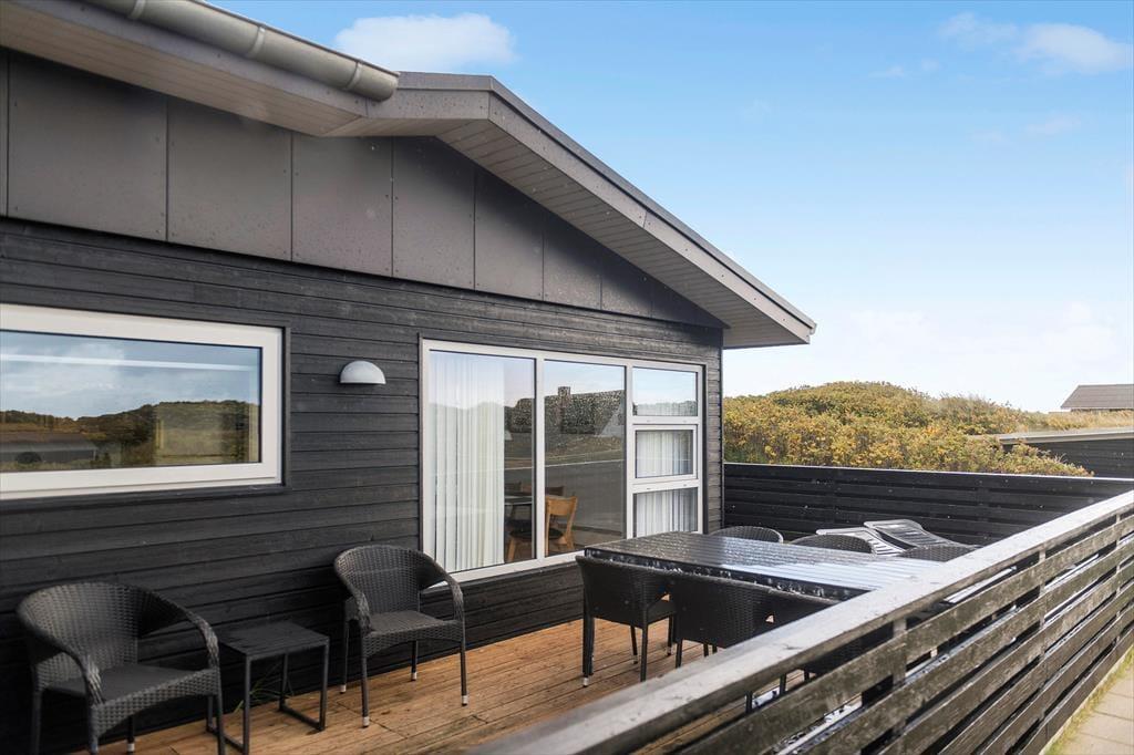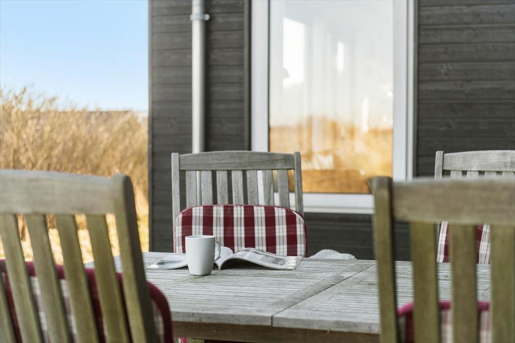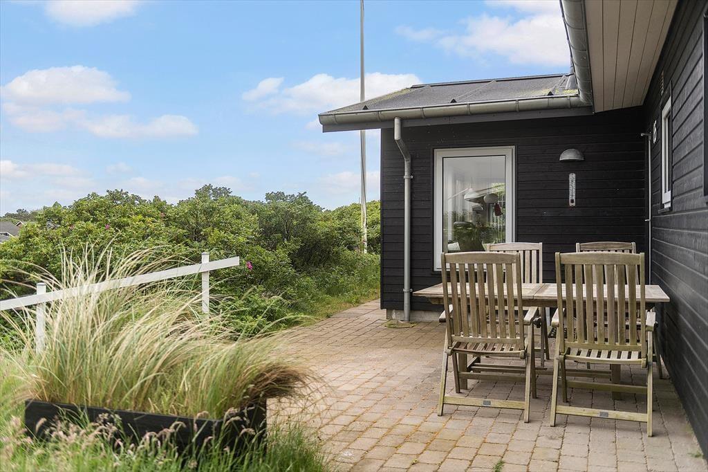 Vom Parkplatz auf dem Naturgrundstück kannst du einem Pfad zum Ferienhaus und zur offenen gefliesten Terrasse folgen, die nach Nordosten ausgerichtet ist. Hier ist es herrlich, aber wahrscheinlich wird dein bevorzugter Aufenthaltsort die große, völlig abgeschlossene Holzterrasse sein, die nach Südwesten liegt und einen schönen Blick auf die Dünen und den beeindruckenden Abendhimmel bietet. Wenn die Sonne sich darauf vorbereitet unterzugehen und die Landschaft in eine goldene Farbpalette taucht, ist es herrlich, hier über einem leckeren Essen oder mit etwas Gutem im Glas zu sitzen, es sei denn, du ziehst es vor, einen Picknickkorb zu packen und den Abendkaffee mit zum Rindby Strand zu nehmen.