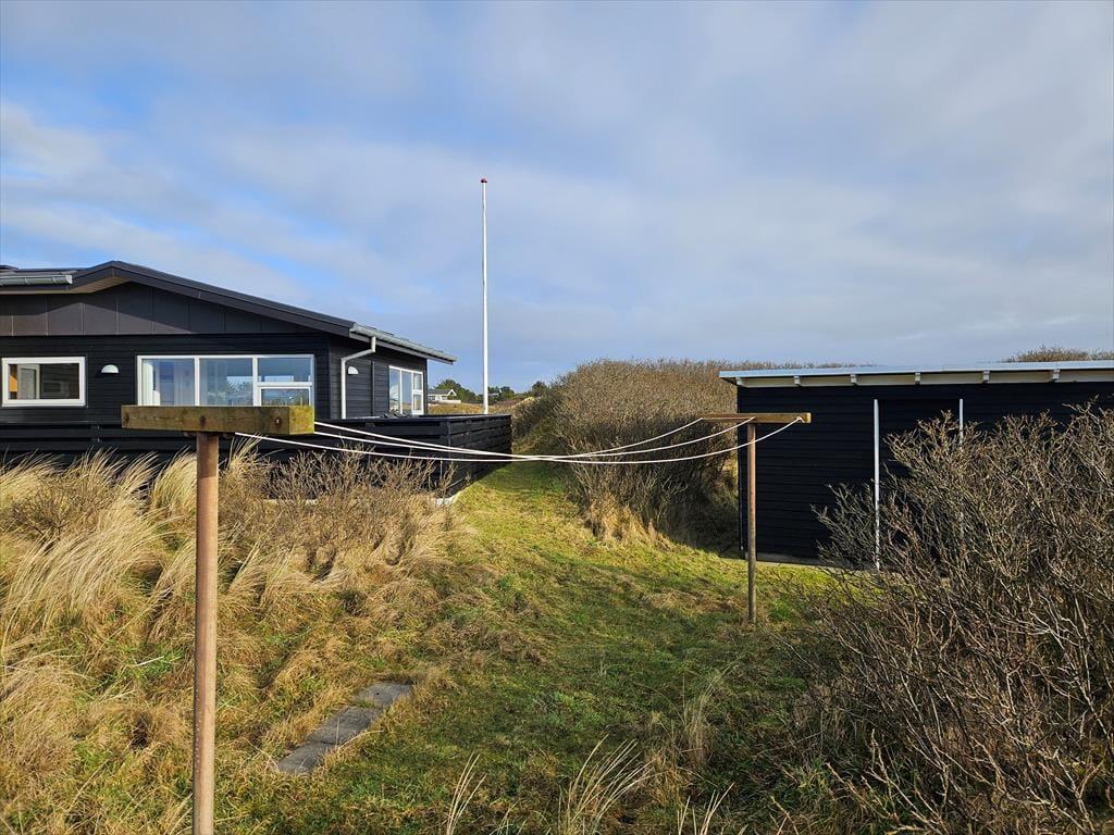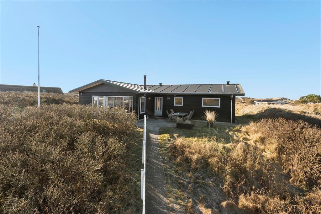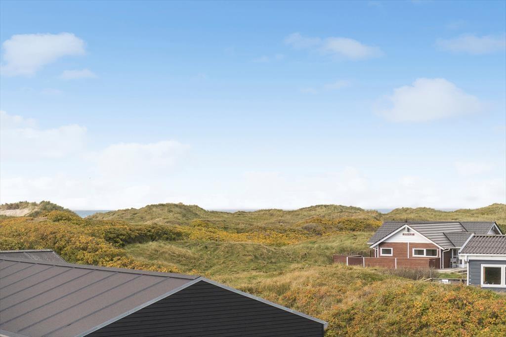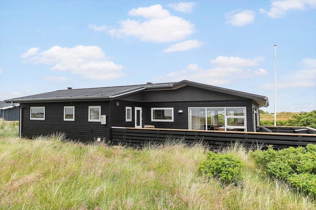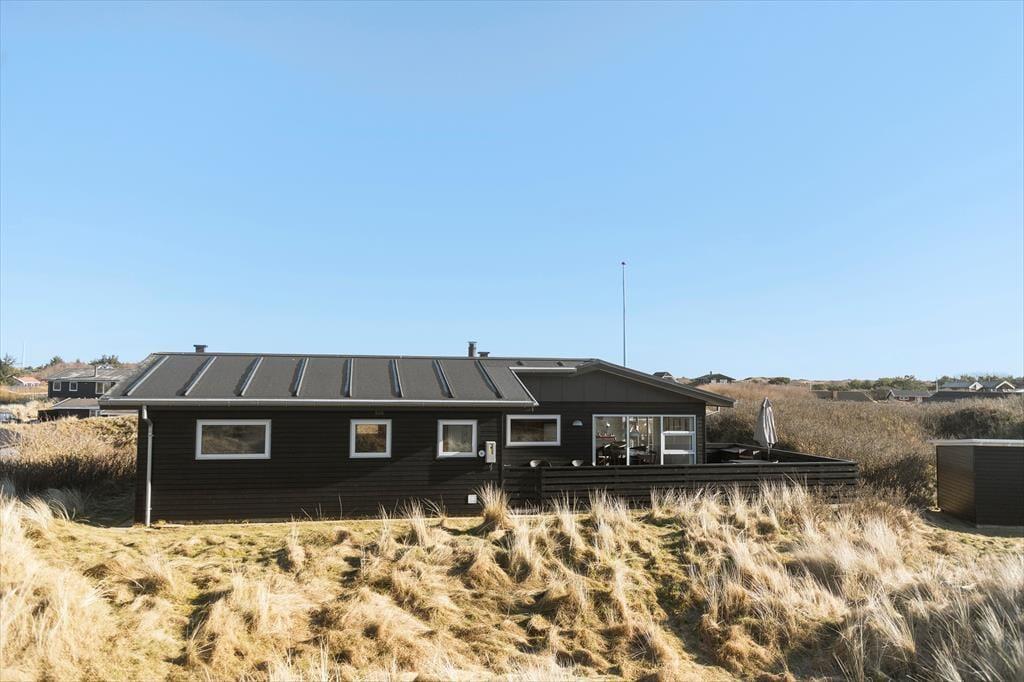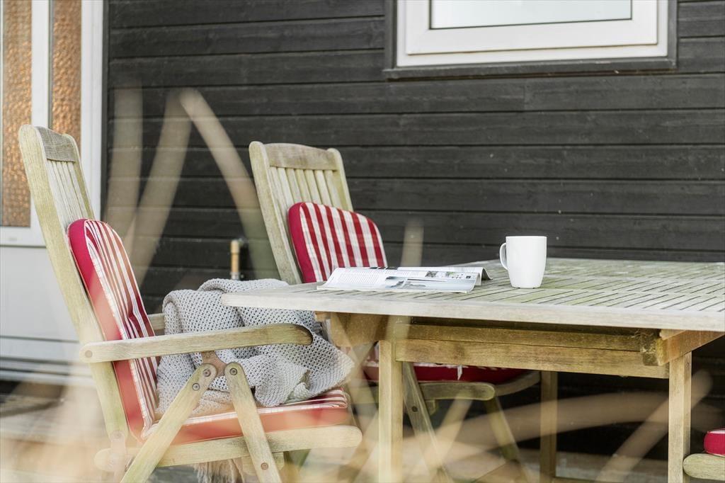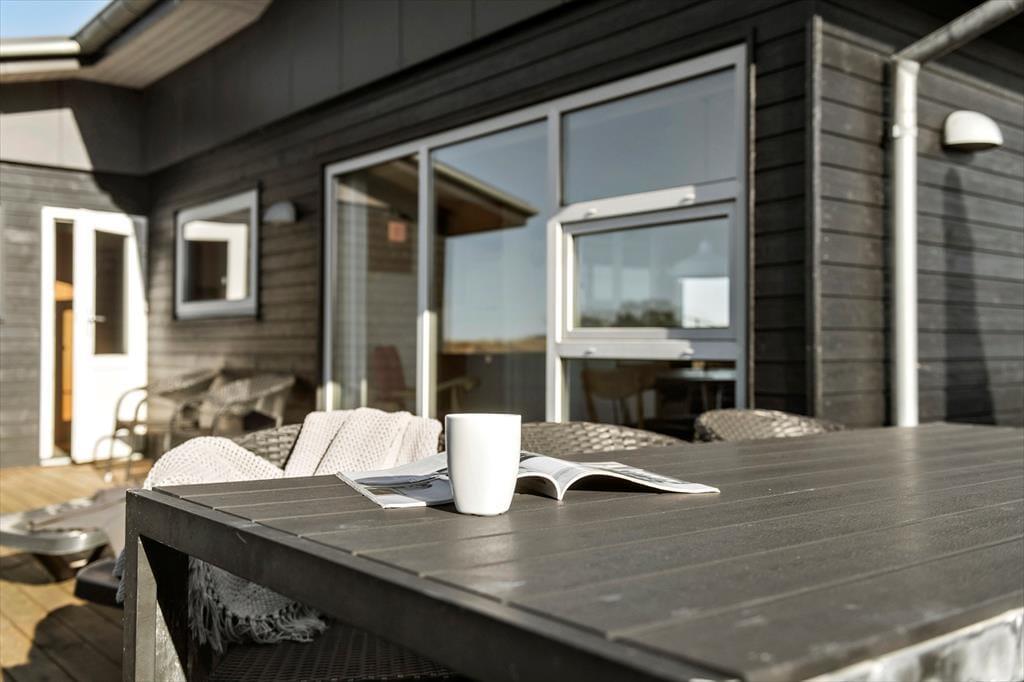 Vom Parkplatz auf dem Naturgrundstück kannst du einem Pfad zum Ferienhaus und zur offenen gefliesten Terrasse folgen, die nach Nordosten ausgerichtet ist. Hier ist es herrlich, aber wahrscheinlich wird dein bevorzugter Aufenthaltsort die große, völlig abgeschlossene Holzterrasse sein, die nach Südwesten liegt und einen schönen Blick auf die Dünen und den beeindruckenden Abendhimmel bietet. Wenn die Sonne sich darauf vorbereitet unterzugehen und die Landschaft in eine goldene Farbpalette taucht, ist es herrlich, hier über einem leckeren Essen oder mit etwas Gutem im Glas zu sitzen, es sei denn, du ziehst es vor, einen Picknickkorb zu packen und den Abendkaffee mit zum Rindby Strand zu nehmen.
