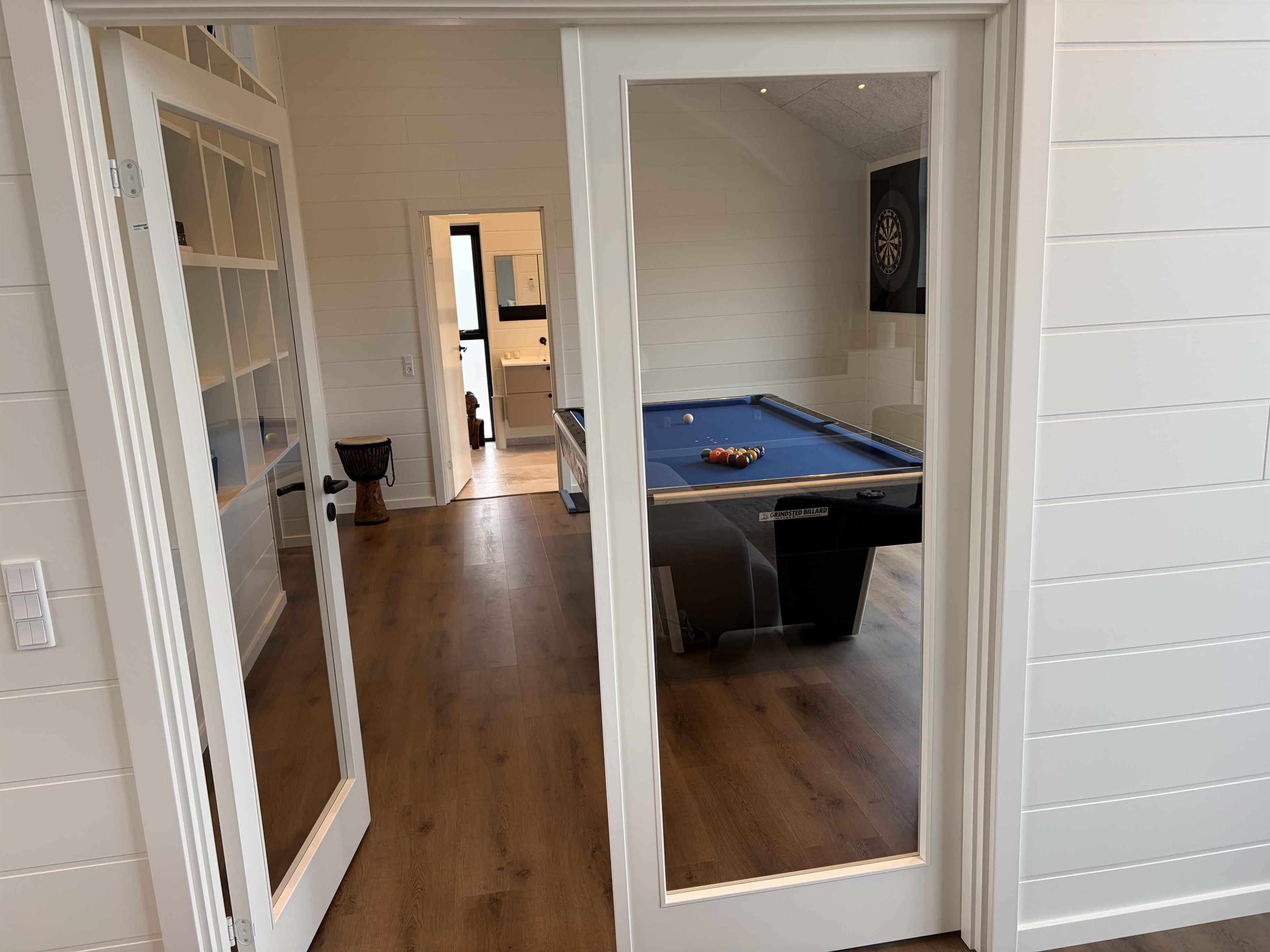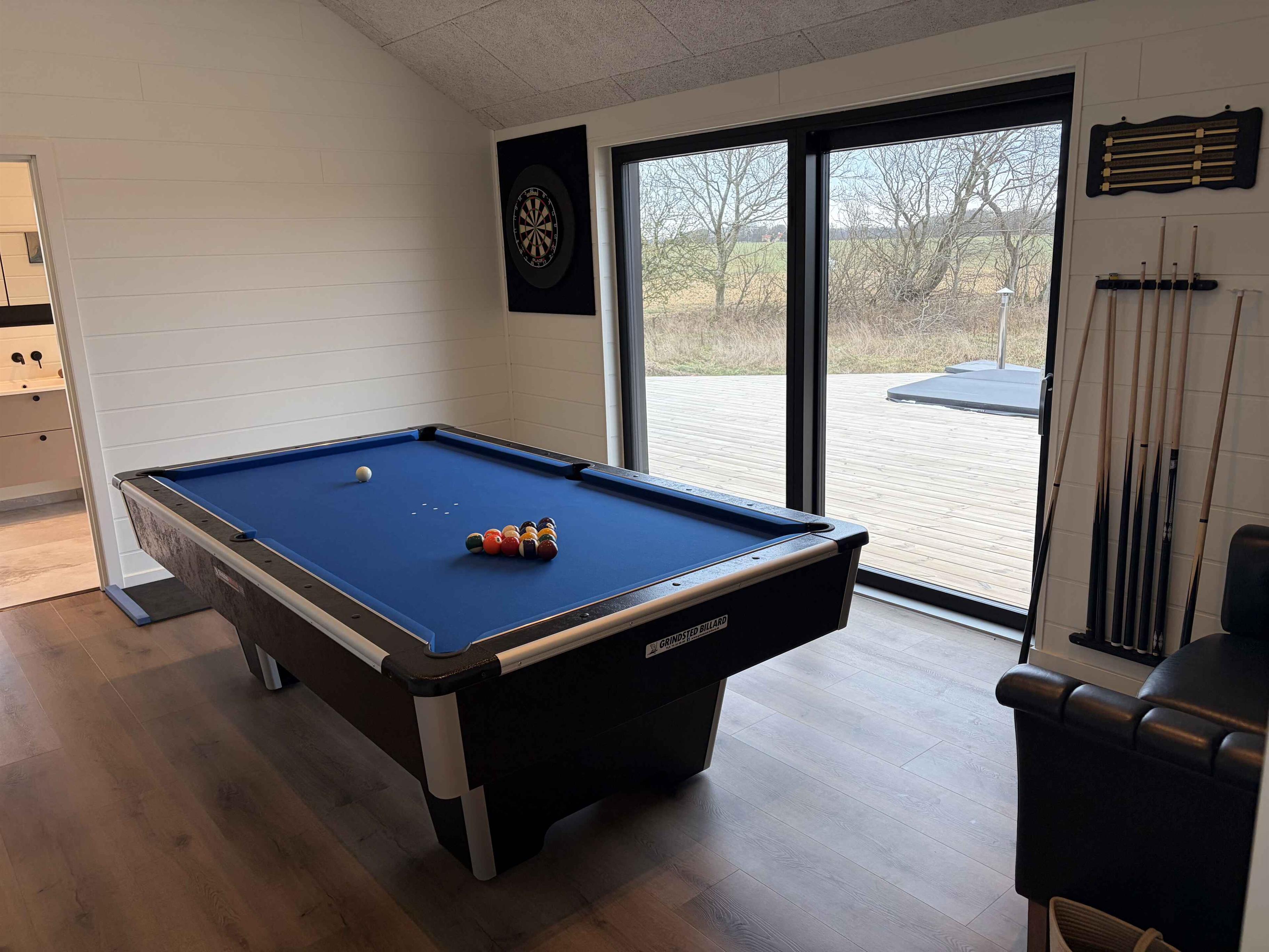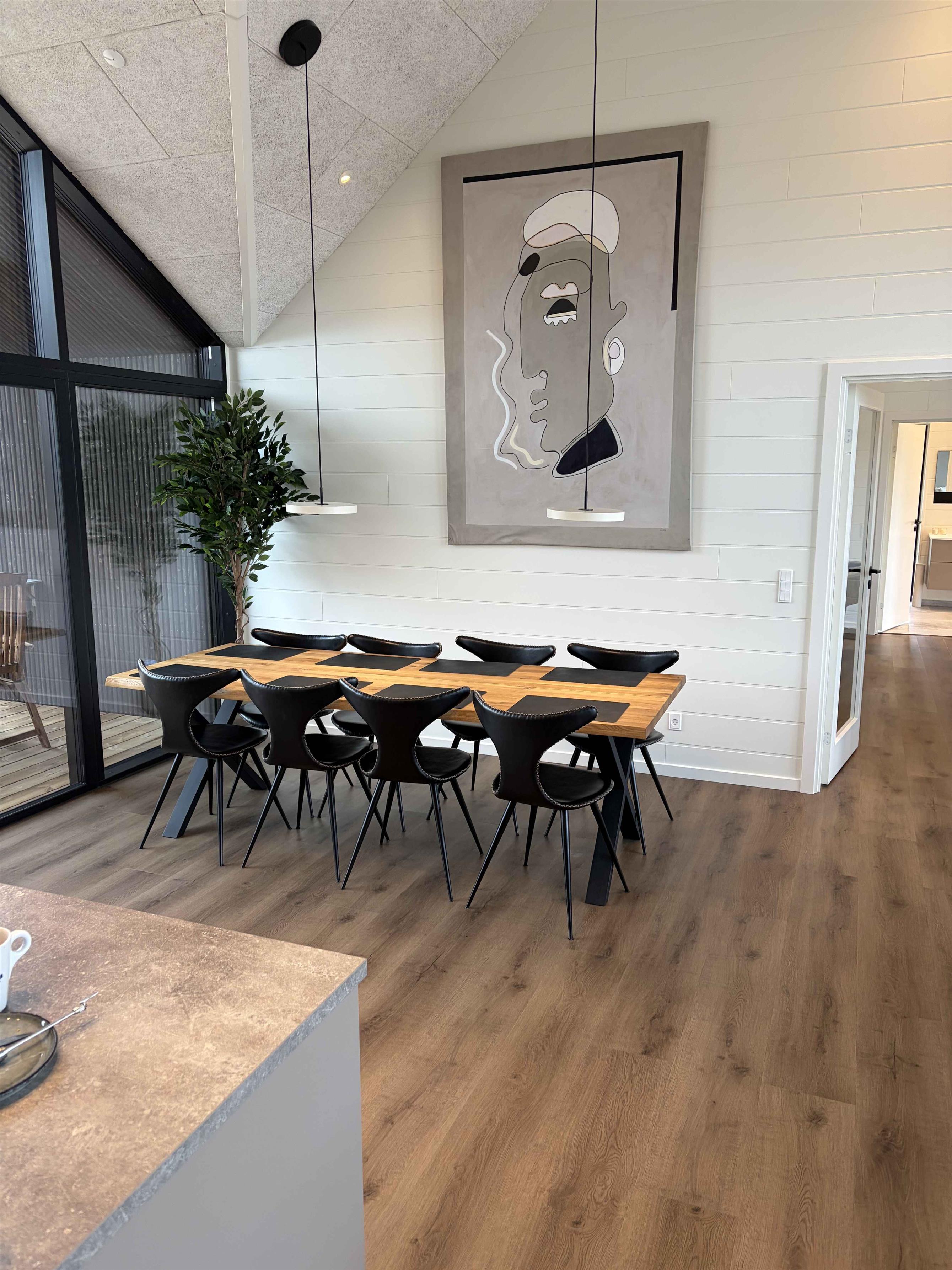 Das Ferienhaus liegt in ruhiger Umgebung, wo Rehe und anderes Wild direkt vor den Fenstern vorbeiziehen. Es befindet sich nahe Sallings bestem Badestrand mit Restaurant und Eiskiosk. In der Umgebung gibt es viele Wanderwege durch Wald und entlang des Limfjords sowie einen Badesteg. Das Haus liegt in der Nähe von Jeppe Aakjærs Künstlerhaus und Museum, das als nächster Nachbar sichtbar ist. Das Haus hat 165 m² und verfügt über einen Eingangsbereich, zwei Schlafzimmer mit Doppelbetten und ein Bad mit Einbauarmaturen und großer Dusche. Großes Wohnküchenbereich mit moderner Ausstattung und Essplatz für 8 Personen. Draußen gibt es eine überdachte Terrasse mit großem Dachfenster, einen Morsø-Holzpizzaofen und einen Weber-Holzkohlegrill. Wohnzimmer mit großer Couch und eingebautem Kaminofen. Aktivitätsraum mit Spielen, neuem Billard-/Tischtennistisch und Dart. Zwei weitere Schlafzimmer mit Doppelbetten und Galerie sowie zweites Bad mit Waschmaschine und Trockner. 300 m² Holzterrasse mit Außendusche (warm/kalt), eingelassenem Whirlpool für 8 Personen und elektrisch beheizter Sauna mit Blick auf den Limfjord.