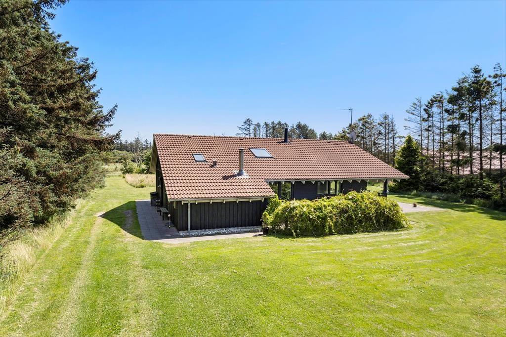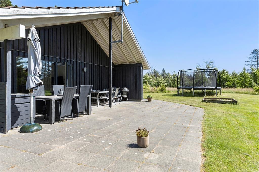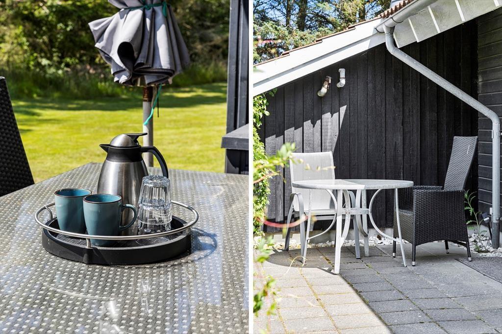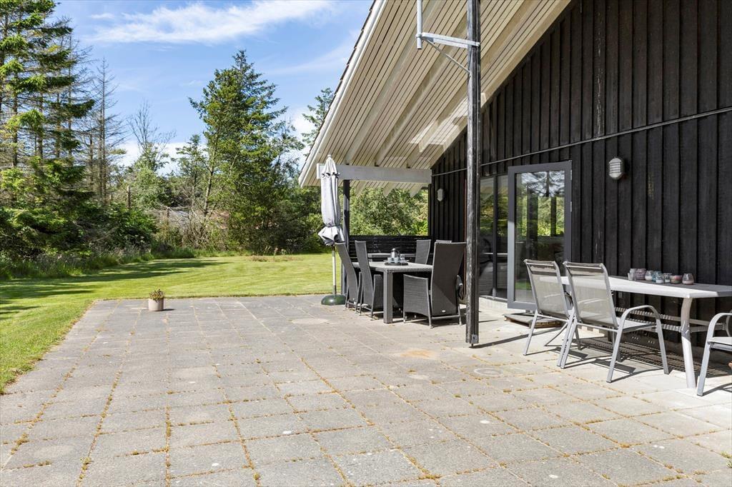 Das Ferienhaus liegt auf einem 5.524 m2 großen Rasengrundstück, umgeben von Bäumen. Eine Steinterrasse ist um das ganze Haus herum verlegt, sodass Sie jederzeit ein Plätzchen an der Sonne oder im Schatten finden. Der überdachte Teil der Terrasse in Richtung Süden lädt zum Grillen ein, während die Kinder auf der großen Wiese nach Herzenslust spielen und toben können. Terrassenmöbel, Liegestühle sowie ein Grill stehen Ihnen selbstverständlich zur freien Verfügung.
