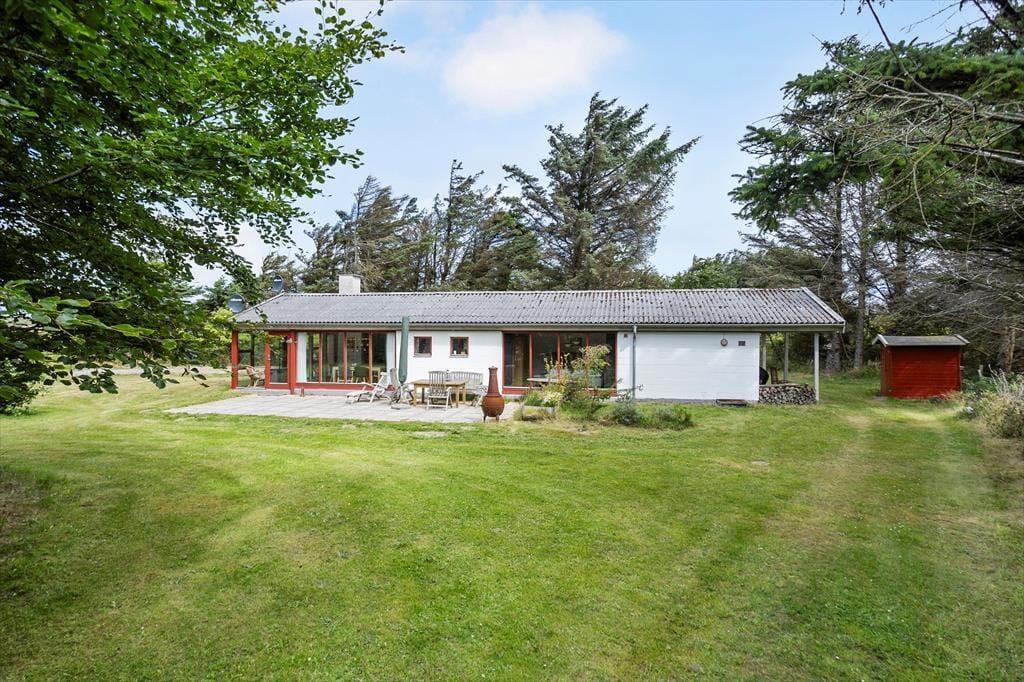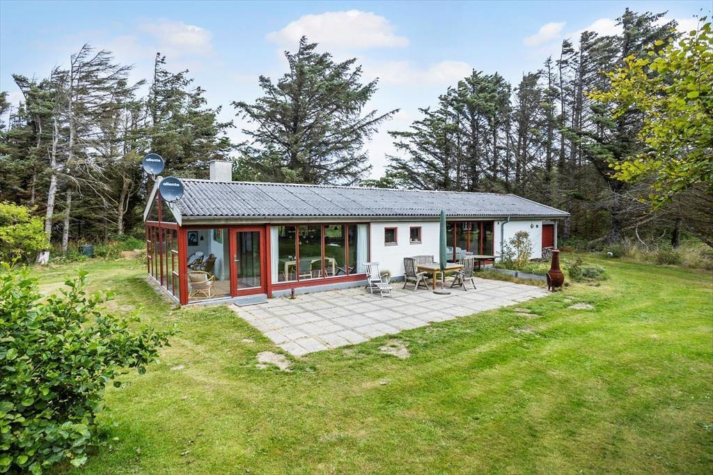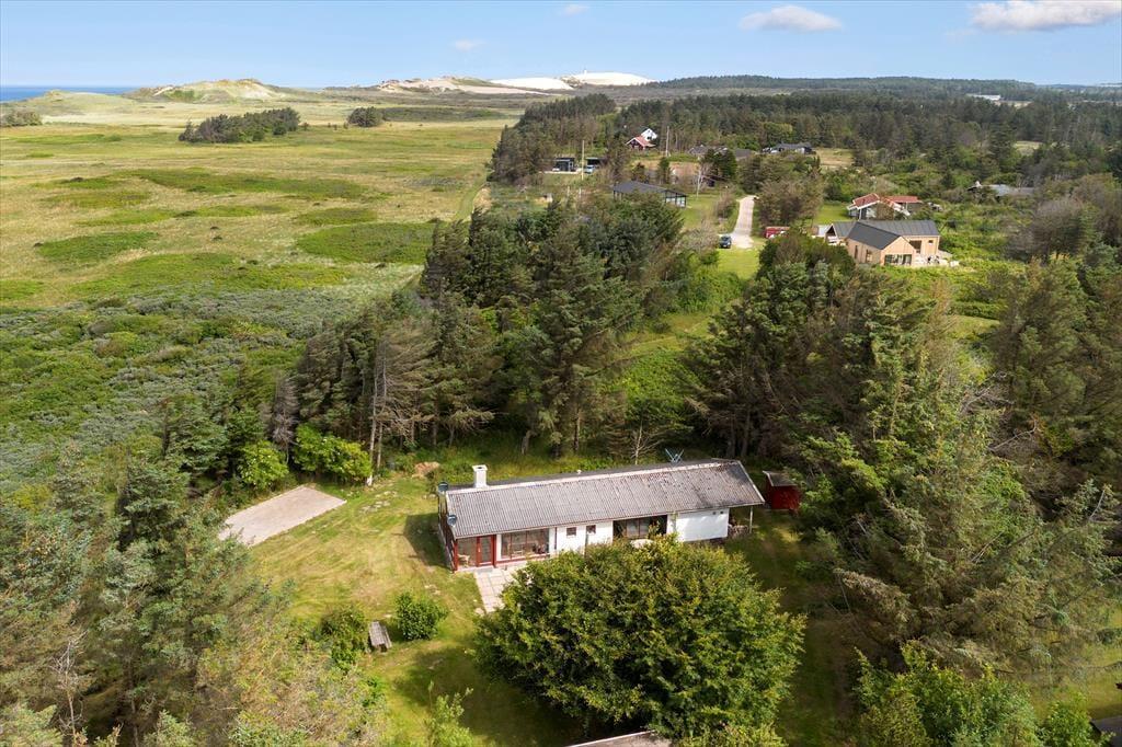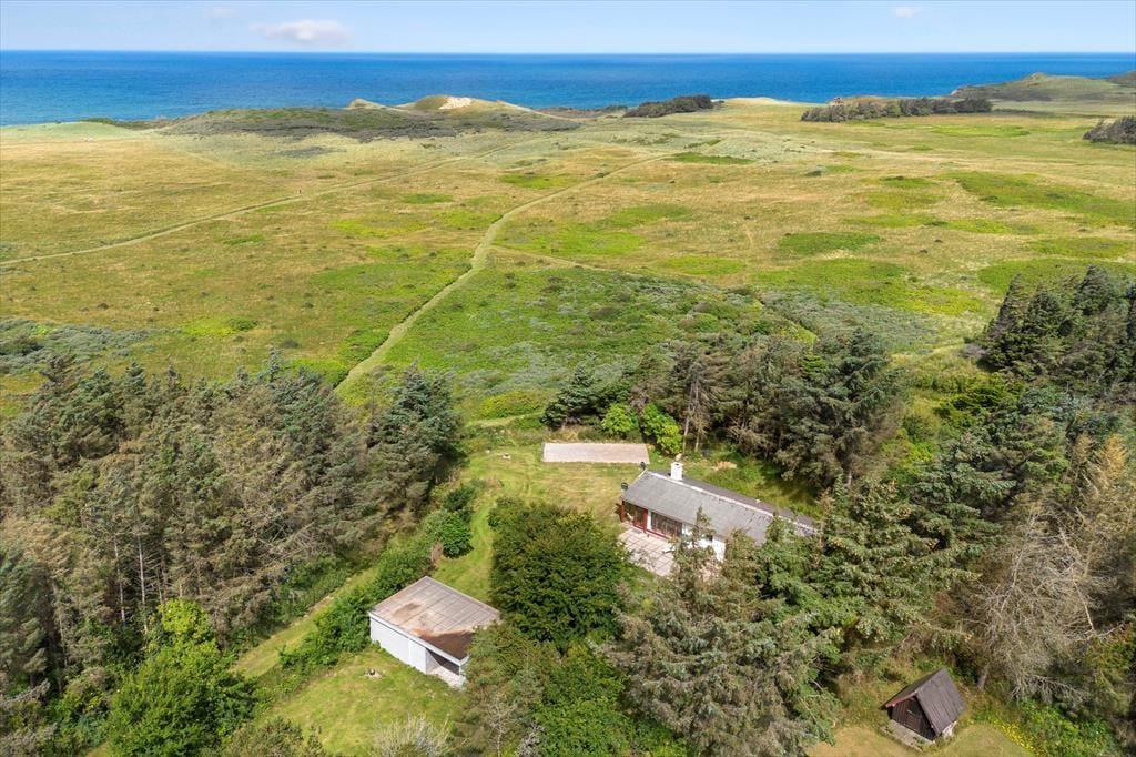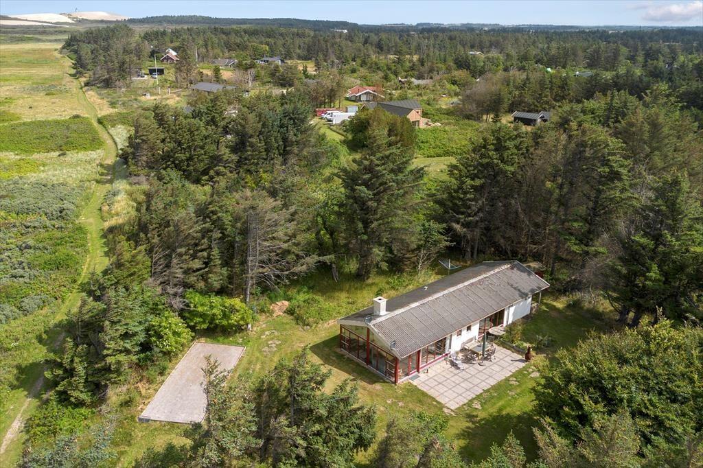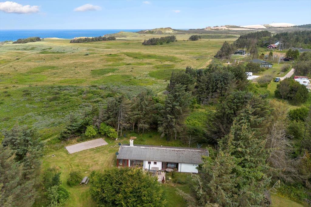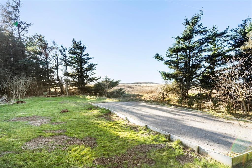 Das 2102 m² große Grundstück liegt am westlichen Ende des Ferienhausgebiets. Hohe Kiefern und andere Bepflanzungen sorgen für Privatsphäre zu den Nachbarn, während es nach Westen hin offener wird, mit Blick auf das hügelige Land, das sich bis zur Lønstrup Klint erstreckt. Südlich des Ferienhauses befindet sich eine nach Süden ausgerichtete Terrasse. Mit einer Boulebahn und einer großen Rasenfläche haben Sie viele Möglichkeiten, Gartenspiele zu genießen.
