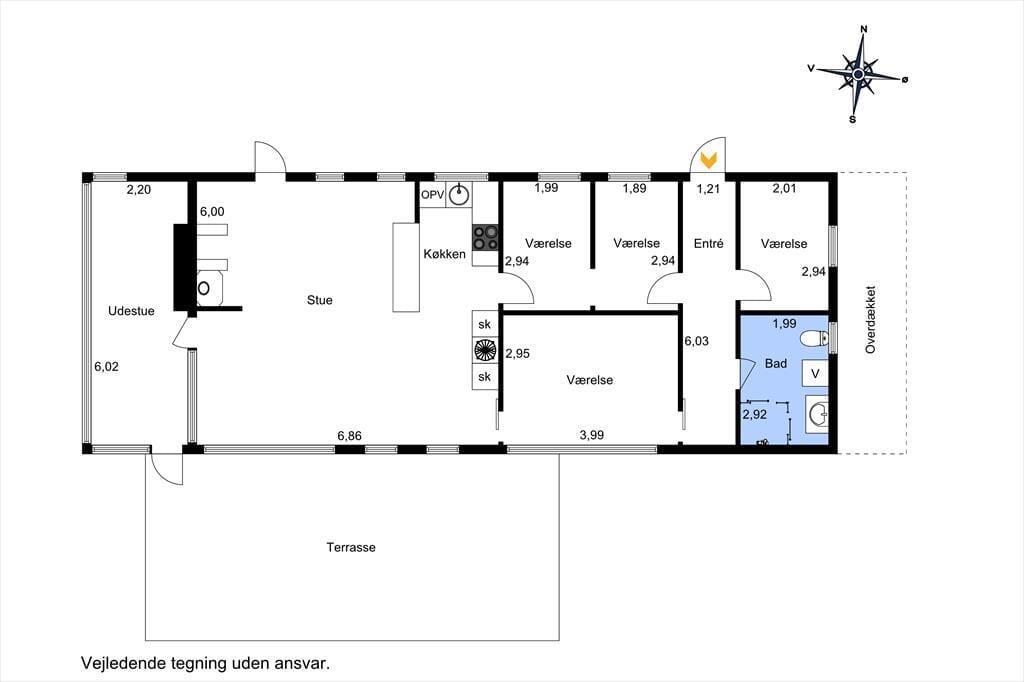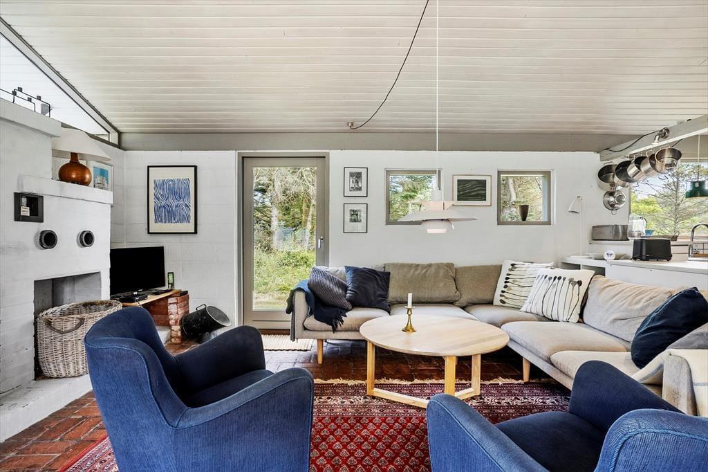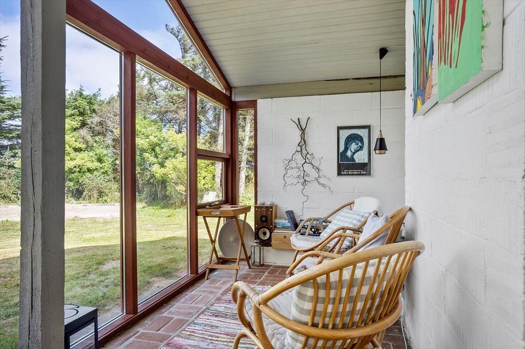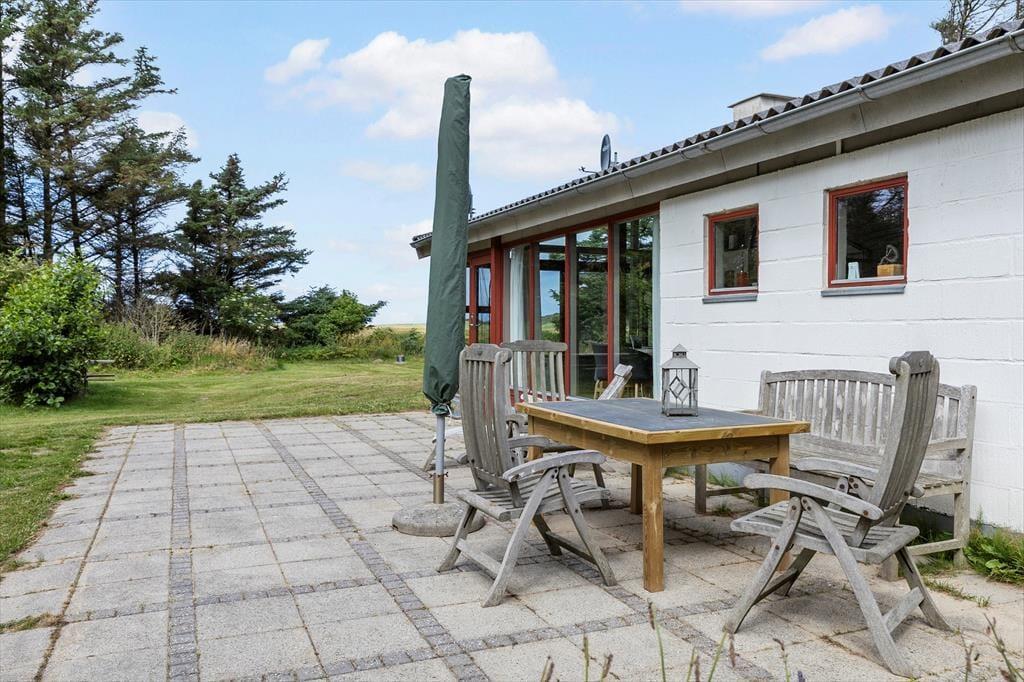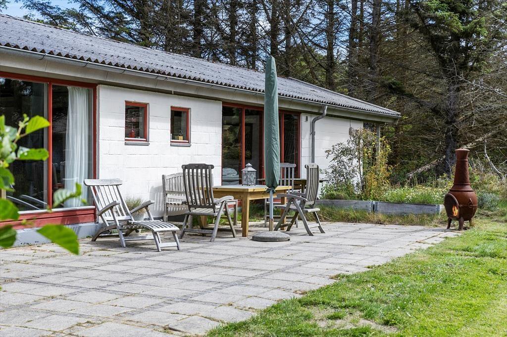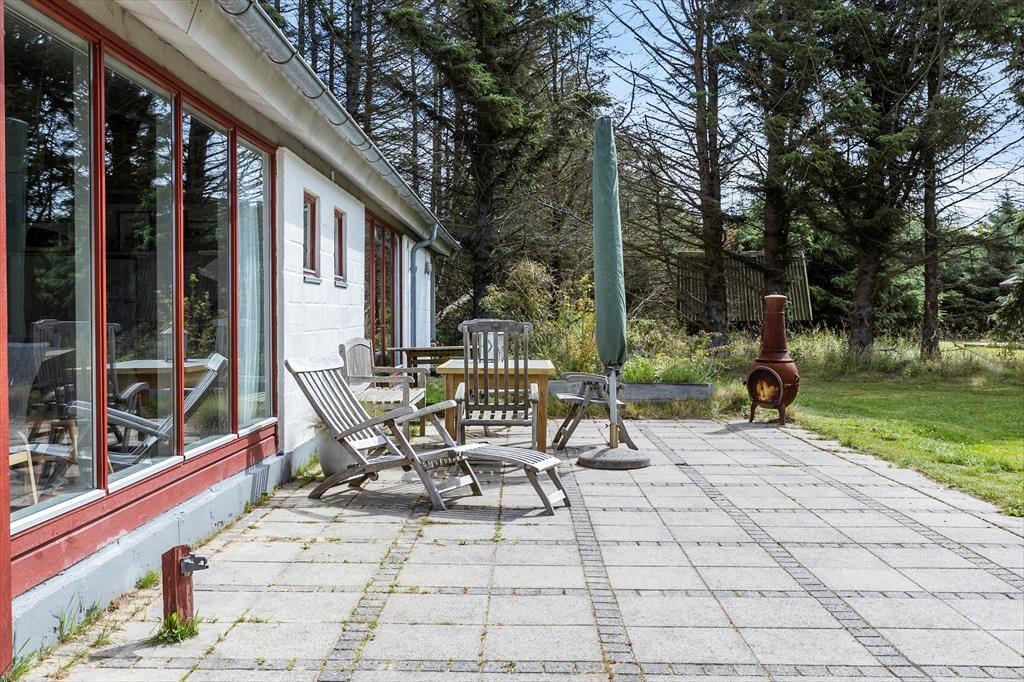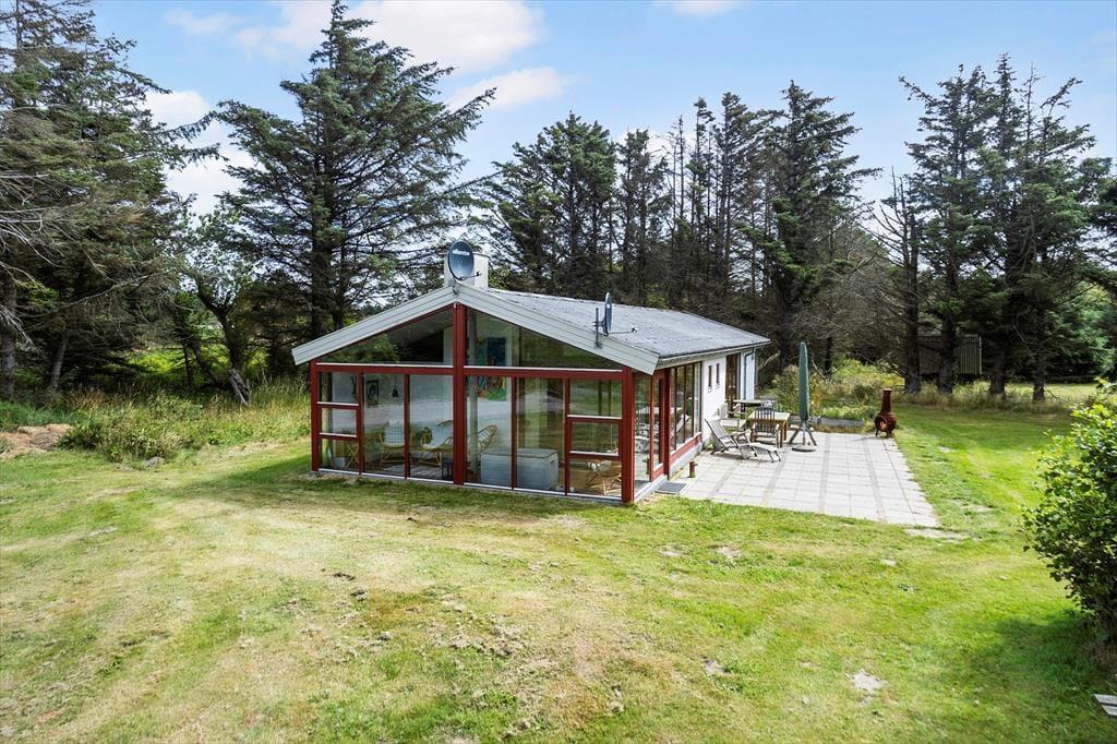 Das 2102 m² große Grundstück liegt am westlichen Ende des Ferienhausgebiets. Hohe Kiefern und andere Bepflanzungen sorgen für Privatsphäre zu den Nachbarn, während es nach Westen hin offener wird, mit Blick auf das hügelige Land, das sich bis zur Lønstrup Klint erstreckt. Südlich des Ferienhauses befindet sich eine nach Süden ausgerichtete Terrasse. Mit einer Boulebahn und einer großen Rasenfläche haben Sie viele Möglichkeiten, Gartenspiele zu genießen.