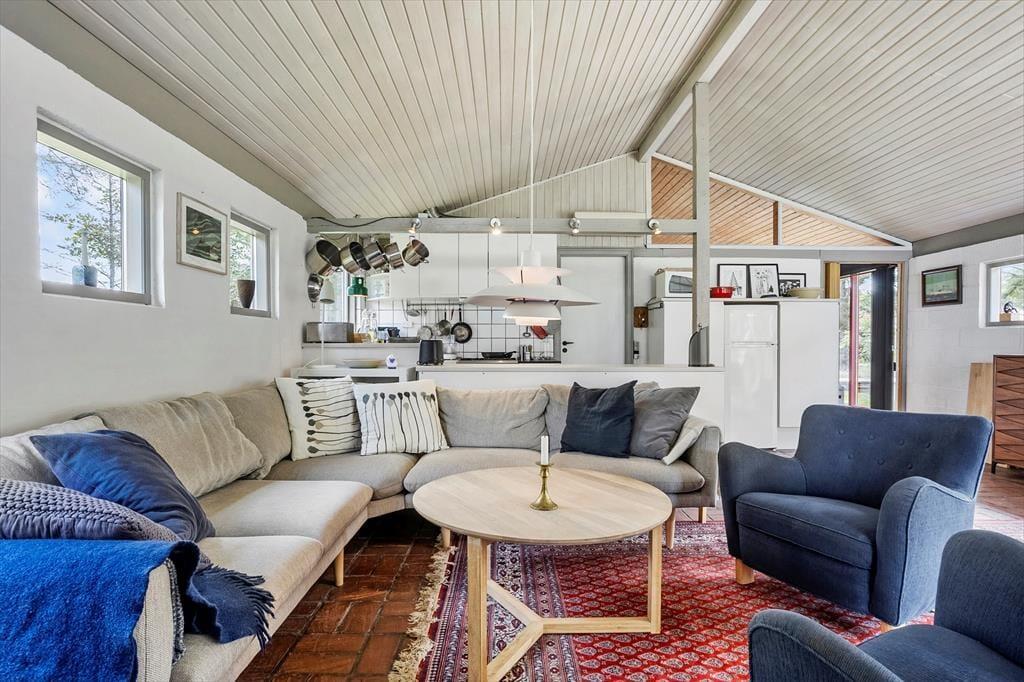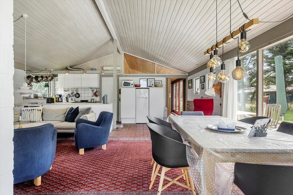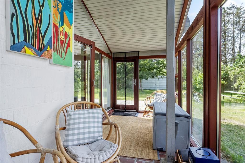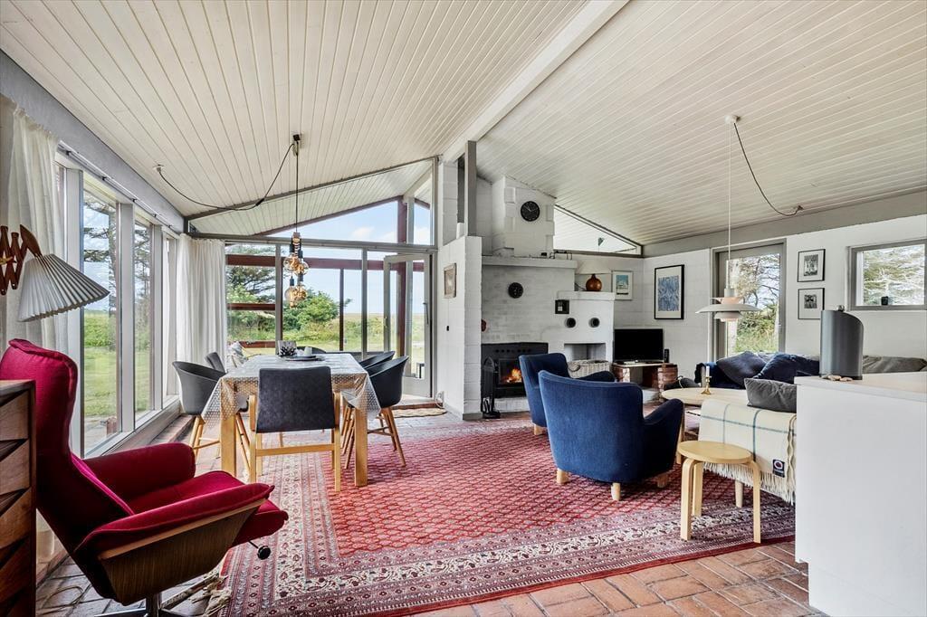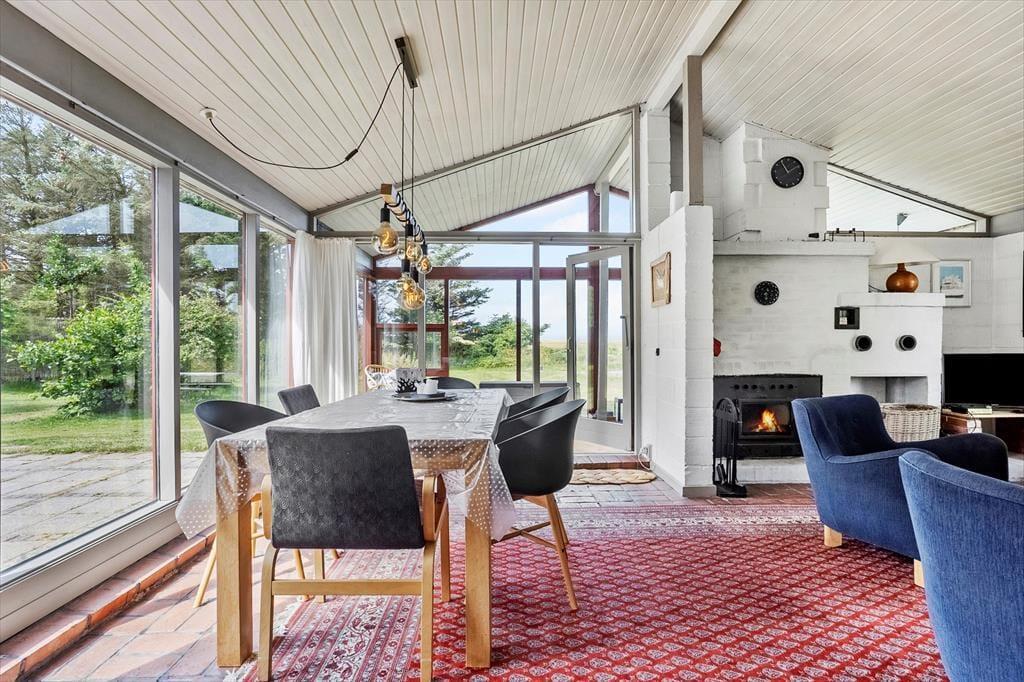 Das 110 m² große Ferienhaus bietet mit drei Schlafzimmern und einem Badezimmer eine durchdachte Raumaufteilung für bis zu sechs Personen. Es ist eine ideale Basis für eine Familie mit Kindern oder eine Gruppe von Freunden, die zusammen Urlaub machen und viel Zeit für Gemütlichkeit und soziale Aktivitäten haben möchten. Wenn Sie kochen, müssen Sie nicht auf die gute Gesellschaft verzichten, denn die Küche ist offen mit dem Wohnzimmer verbunden. Neben der Sofaecke befindet sich ein Kamin, und der Esstisch ist so platziert, dass Sie einen schönen Blick auf die westliche Landschaft haben. Die grünen Umgebung können Sie auch vom Wintergarten aus genießen, der mit seiner hohen Decke und dem hellen Ambiente genauso einladend ist wie der Rest des Wohnbereichs.
