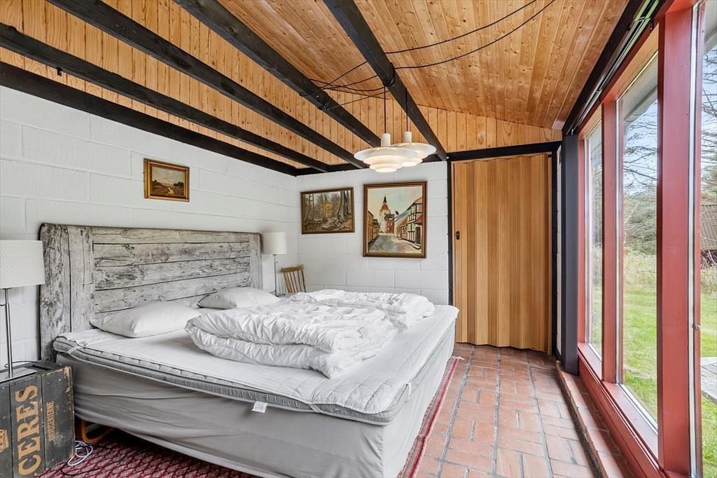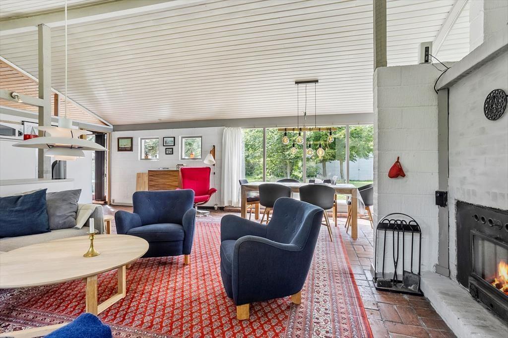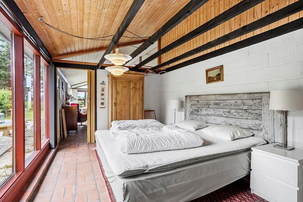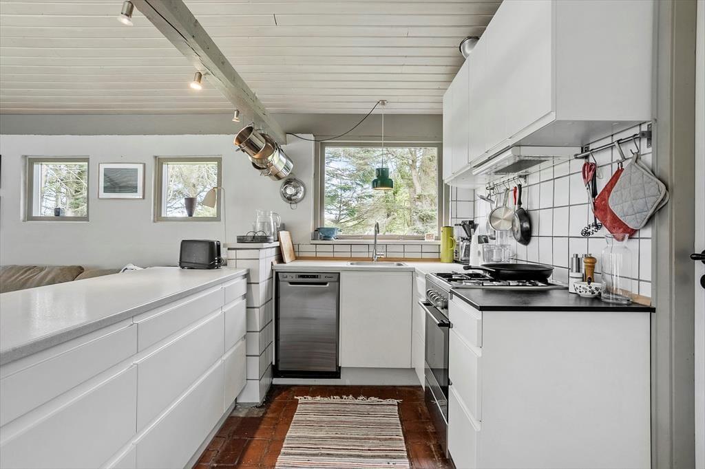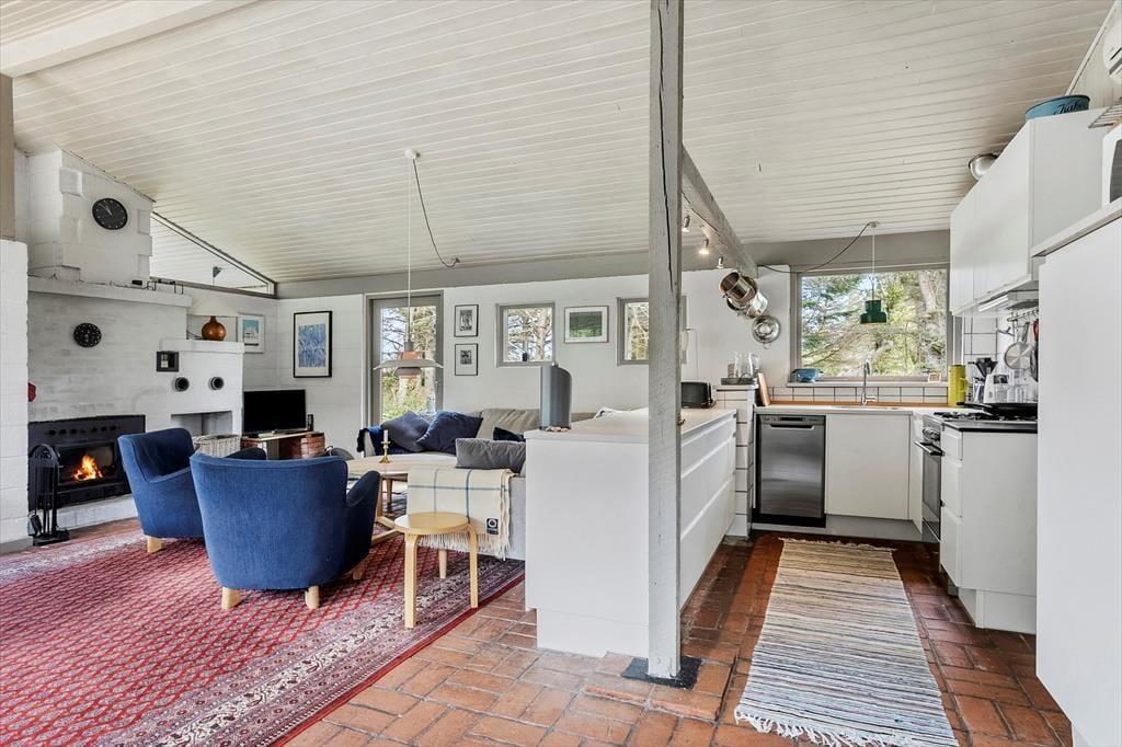 Das 110 m² große Ferienhaus bietet mit drei Schlafzimmern und einem Badezimmer eine durchdachte Raumaufteilung für bis zu sechs Personen. Es ist eine ideale Basis für eine Familie mit Kindern oder eine Gruppe von Freunden, die zusammen Urlaub machen und viel Zeit für Gemütlichkeit und soziale Aktivitäten haben möchten. Wenn Sie kochen, müssen Sie nicht auf die gute Gesellschaft verzichten, denn die Küche ist offen mit dem Wohnzimmer verbunden. Neben der Sofaecke befindet sich ein Kamin, und der Esstisch ist so platziert, dass Sie einen schönen Blick auf die westliche Landschaft haben. Die grünen Umgebung können Sie auch vom Wintergarten aus genießen, der mit seiner hohen Decke und dem hellen Ambiente genauso einladend ist wie der Rest des Wohnbereichs.