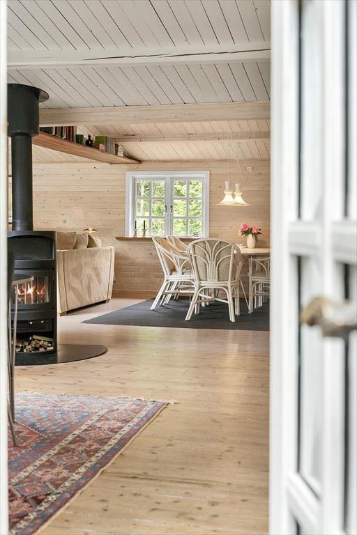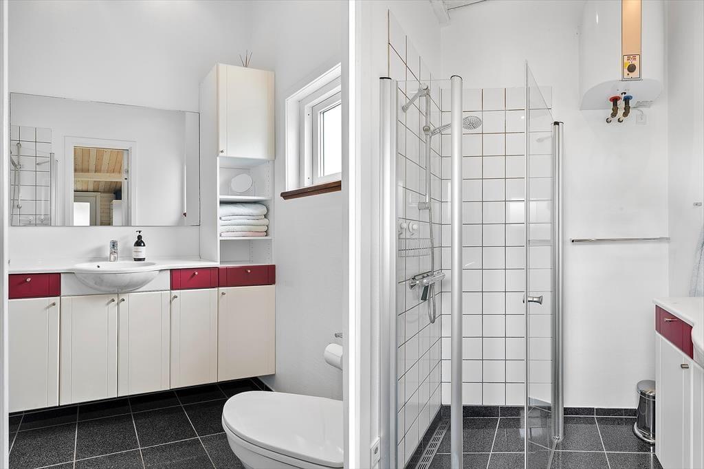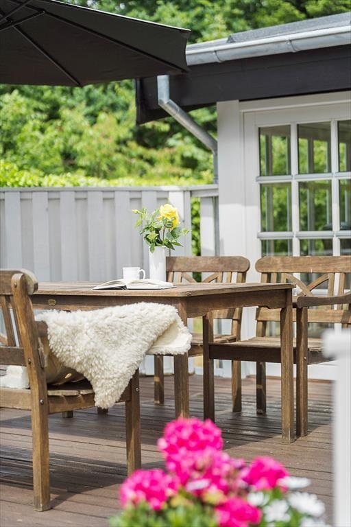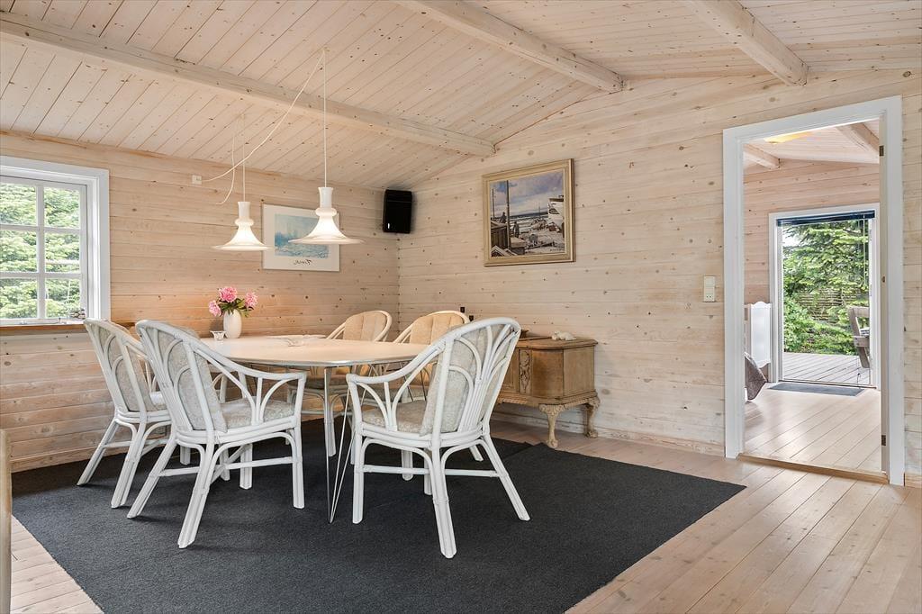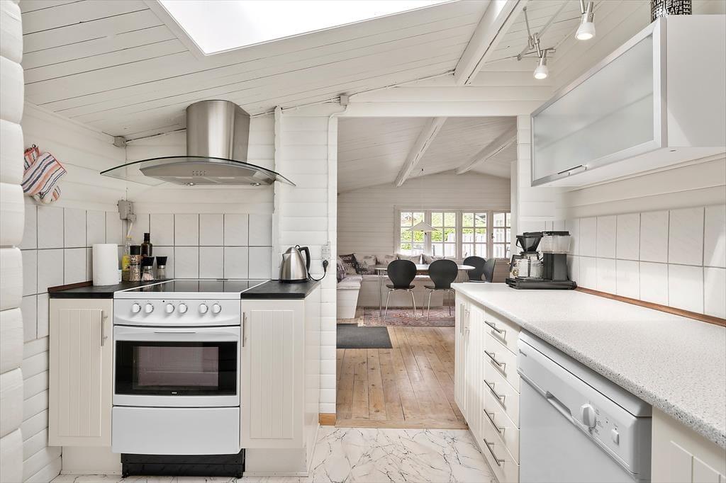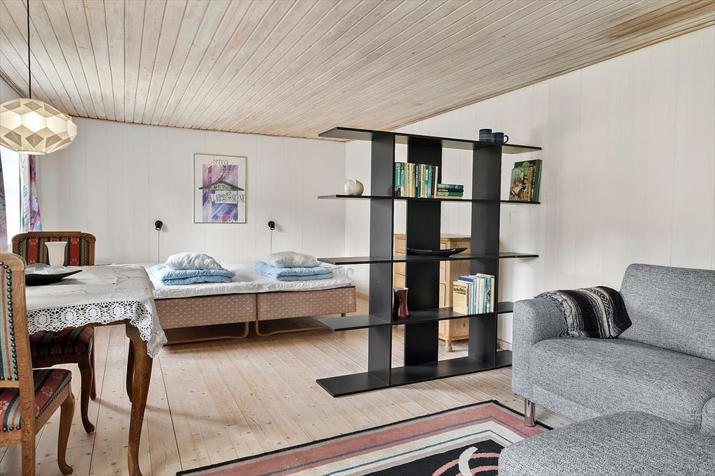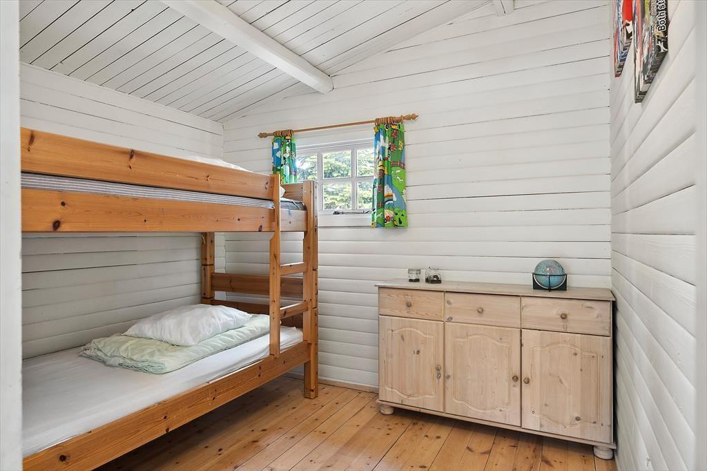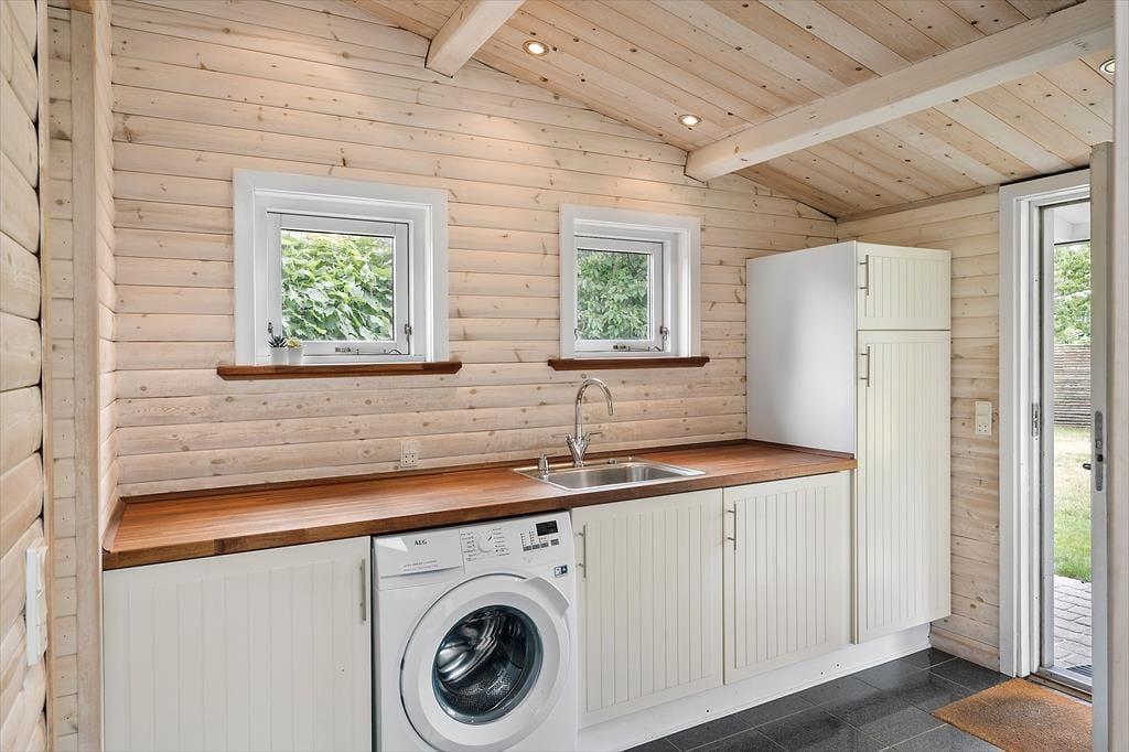 Das Ferienhaus beinhaltet zwei schöne, offen verbundene Wohnräume, die beide geräumig sind und mit einer gemütlichen Atmosphäre überzeugen. Ein Wohnbereich erfreut sich dank großer Fensterpartien eines schönen Tageslichteinfalls, den Sie unter anderem während gemütlicher Momente auf den Polstermöbeln genießen. Unterhaltung und Abwechslung verspricht der Fernseher. Der andere Wohnbereich besticht mit einer offenen Balkenlage, die maßgeblich zum klassischen Ferienhausambiente beiträgt. Die Deckenhöhe beträgt hier 1,90 Meter. In diesem Bereich des Wohnraums ist der Essplatz untergebracht. Die Küche beinhaltet alles, was Sie zum Zubereiten Ihrer Mahlzeiten benötigen. Die Decke ist an einer Seite der Küche niedrig, woraus eine reizvolle, rustikale Atmosphäre resultiert. Der Rest der Wohnfläche ist einem praktischen Hauswirtschaftsbereich, einem hellen Badezimmer und zwei guten Schlafräumen überlassen. Einer der Schlafräume begrüßt Sie mit einem komfortablen Doppelbett. Im zweiten Schlafraum steht ein Etagenbett bereit, das sich sehr gut für Kinder eignet.