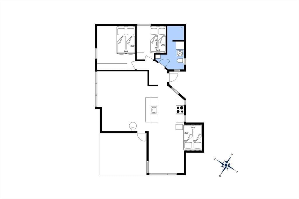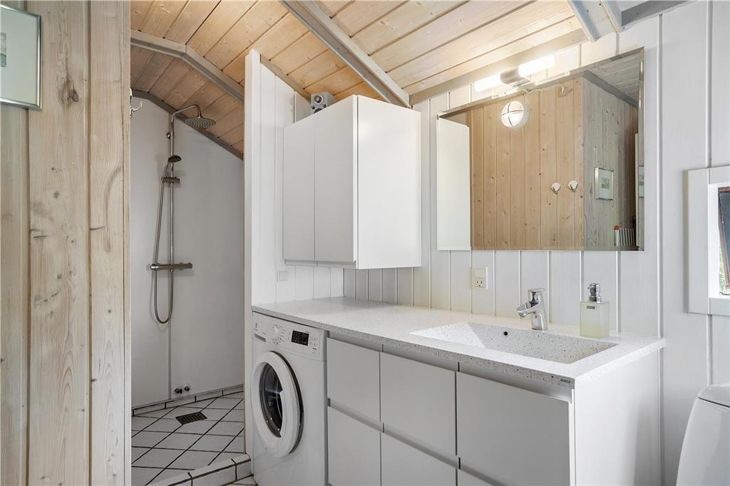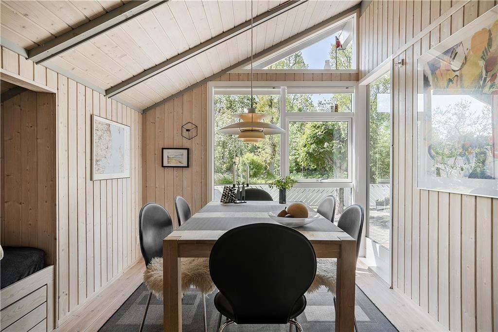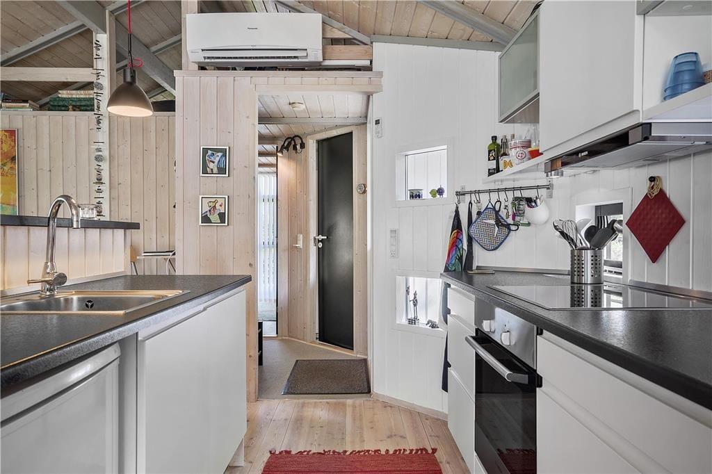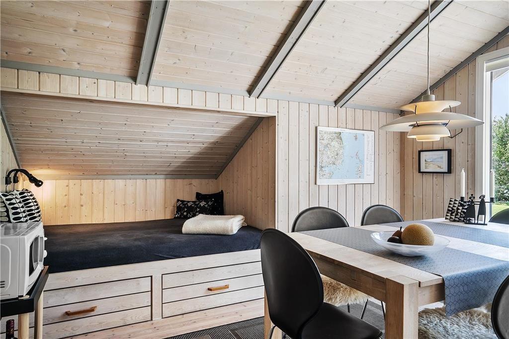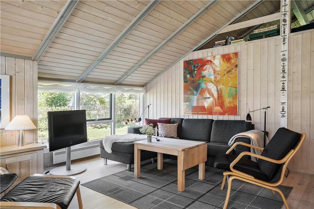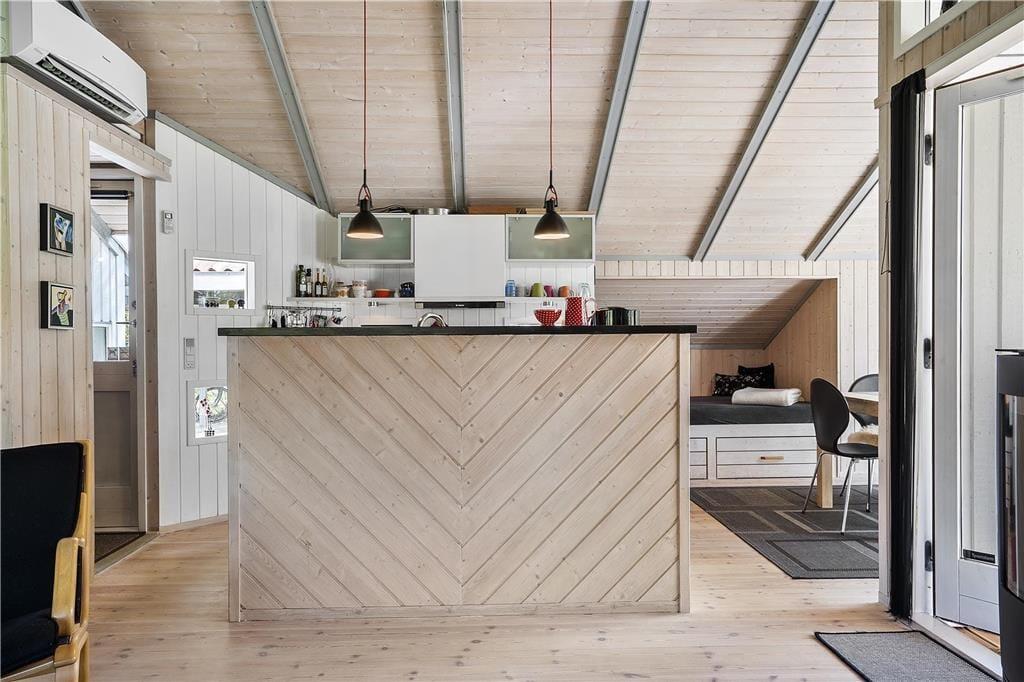 Das Ferienhaus ist sehr gepflegt und modern eingerichtet mit Möbeln, in denen man sich sofort wohl fühlt. Die Küche ist zentral gelegen und sowohl mit dem Wohnzimmer als auch dem Esstisch offen verbunden. Die Küche ist mit allem ausgestattet, was Sie für die Zubereitung Ihrer Urlaubsmahlzeiten benötigen. Unter anderem gibt es einen Backofen, eine Mikrowelle, einen Geschirrspüler, eine Kaffeemaschine und einen Kühlschrank mit Gefrierfach. Die Küche ist durch eine halbe Wand gut abgetrennt, so dass man immer einen guten Überblick hat und mit den anderen Gästen zusammen sein kann, egal wo man sich in der Küche/dem Wohnzimmer befindet. Neben der Küche befindet sich eine gemütliche Nische mit Schlafgelegenheiten und der Möglichkeit, sich mit einem guten Buch zu entspannen. Hier steht auch der Esstisch, der durch die großen Fenster einen schönen Blick in den Garten bietet. Im Wohnzimmer gibt es eine schöne Sofaecke und einen bequemen Sessel, wo man sich entspannen und den Fernseher einschalten kann, der dänische und deutsche Fernsehsender sowie einen Chromecast hat, so dass man seine eigenen Inhalte über Handy/Tablet und das kostenlose WLAN des Hauses streamen kann. Sie können aber auch den Holzofen in der Mitte des Raumes anheizen, der für Wärme und Gemütlichkeit sorgt.