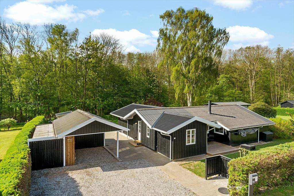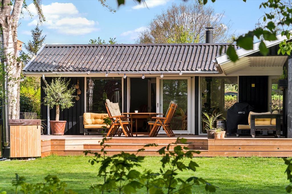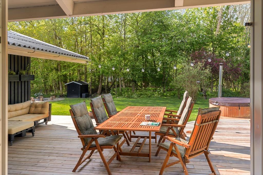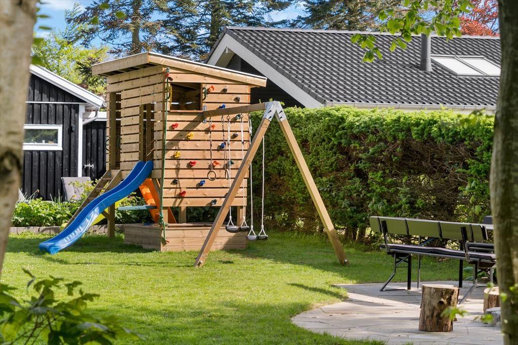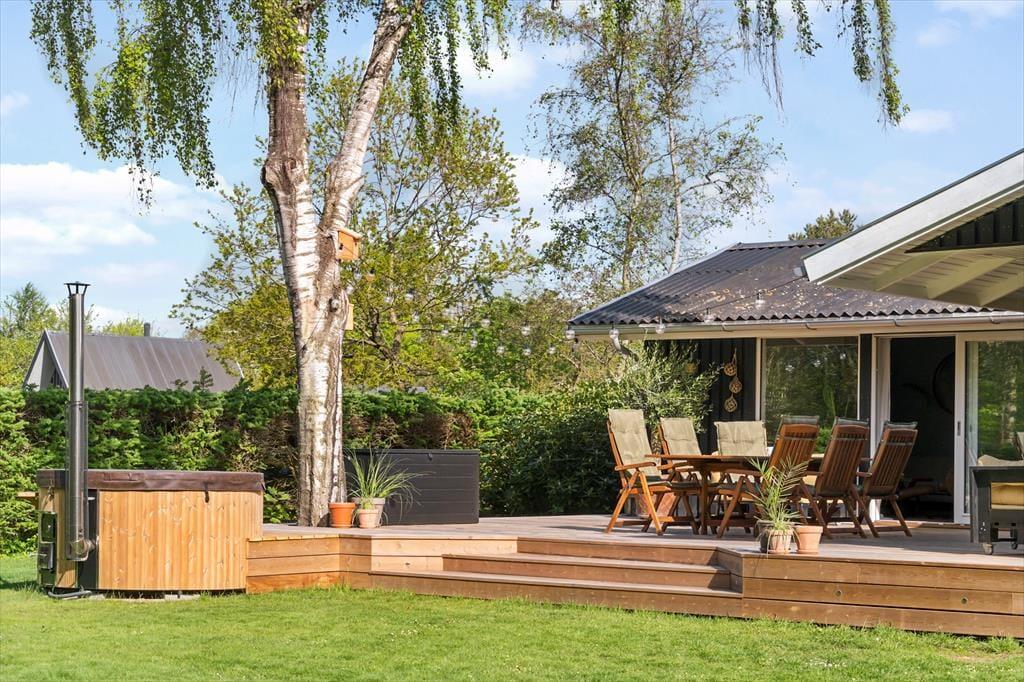 Draußen findest du eine schöne große Holzterrasse, die fast wie ein Innenhof wirkt. Hier kannst du dich im Whirlpool entspannen und die Seele baumeln lassen. Kinder werden das abenteuerliche Spielhaus und den Sandkasten lieben. Die Feuerstelle lädt zu kleinen Mikroabenteuern mit Lagerfeuern, Marshmallows und Geschichten ein. Diese kleinen Abenteuer, sowohl im Alltag als auch besonders in den Ferien, schaffen unvergessliche Erinnerungen, die du für den Rest deines Lebens mit dir tragen kannst. Der Garten ist groß und abgelegen. Es gibt viel Platz zum Spielen und Entfalten. Der untere Teil des Gartens ist ein Waldstück, das dem Garten des Ferienhauses ein großes Gefühl von Ruhe und Atmosphäre verleiht. Die Terrasse ist mit einem Gas- und einem Holzkohlegrill ausgestattet und ist der perfekte Ort für gemeinsame Mahlzeiten - denn gibt es etwas Geselligeres als ein Familiengrillfest? Nur 350 Meter entfernt befindet sich ein schöner Sandstrand, der perfekt für Kinder ist. Nach einem Tag am Strand kannst du dir den Sand und das Salz in der Außendusche abwaschen.