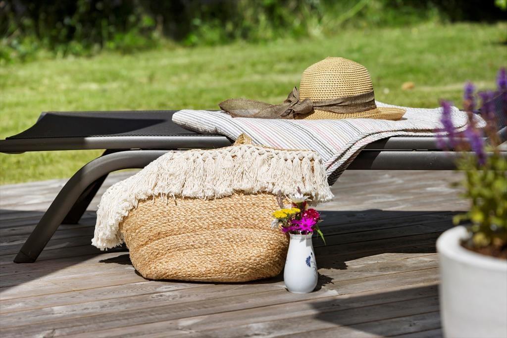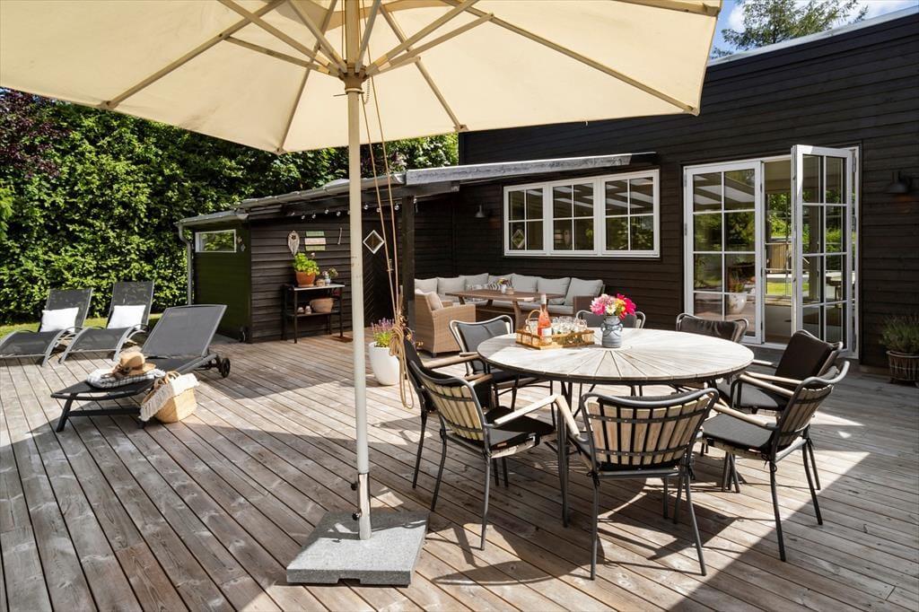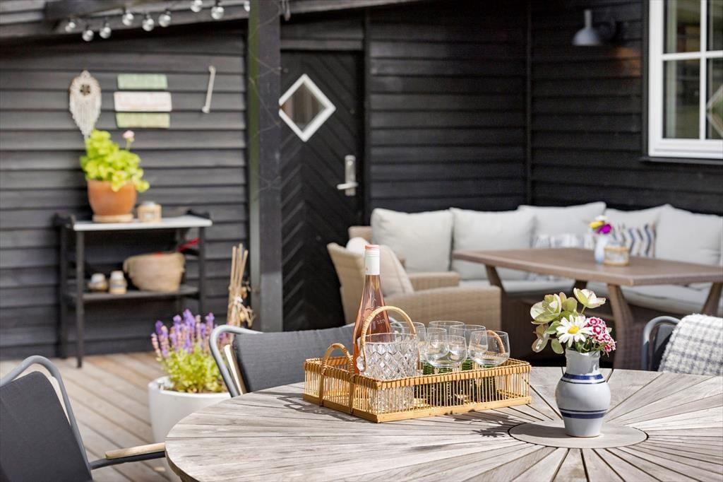 Sie wohnen auf einem großen, schönen Grundstück, das sich in einem ruhigen Ferienhausgebiet am Rude Strand befindet. An das Ferienhaus schließen offene und überdachte Terrassen, auf denen Sie sich einen Großteil des Jahres über gut aufhalten können. Diverse schöne Gartenmöbel, Liegestühle, ein Sonnenschirm und Loungemöbel laden zu gemütlichen Stunden im Kreise Ihrer Lieben ein. Auf diesen Terrassen können Sie wunderbar auf dem Gasgrill grillen und sich in Ruhe entspannen. Alternativ lockt auch stets die große Rasenfläche, die nicht nur Ihre Kinder zum Umhertollen und Spielen animierten wird. Stimmungsvoll geht es am Abend an der hauseigenen Lagerfeuerstelle zu, an der Sie Stockbrote und Würstchen rösten können.