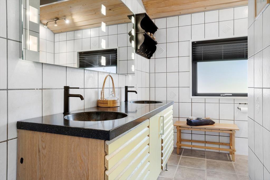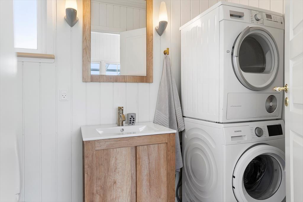 Das Badezimmer ist praktisch mit Fußbodenheizung, Dusche und Toilette. Das Haus hat auch eine Gästetoilette mit Waschmaschine und Trockner, so dass Sie nach einem langen Tag am Strand alle Ihre Strandtücher waschen können.
