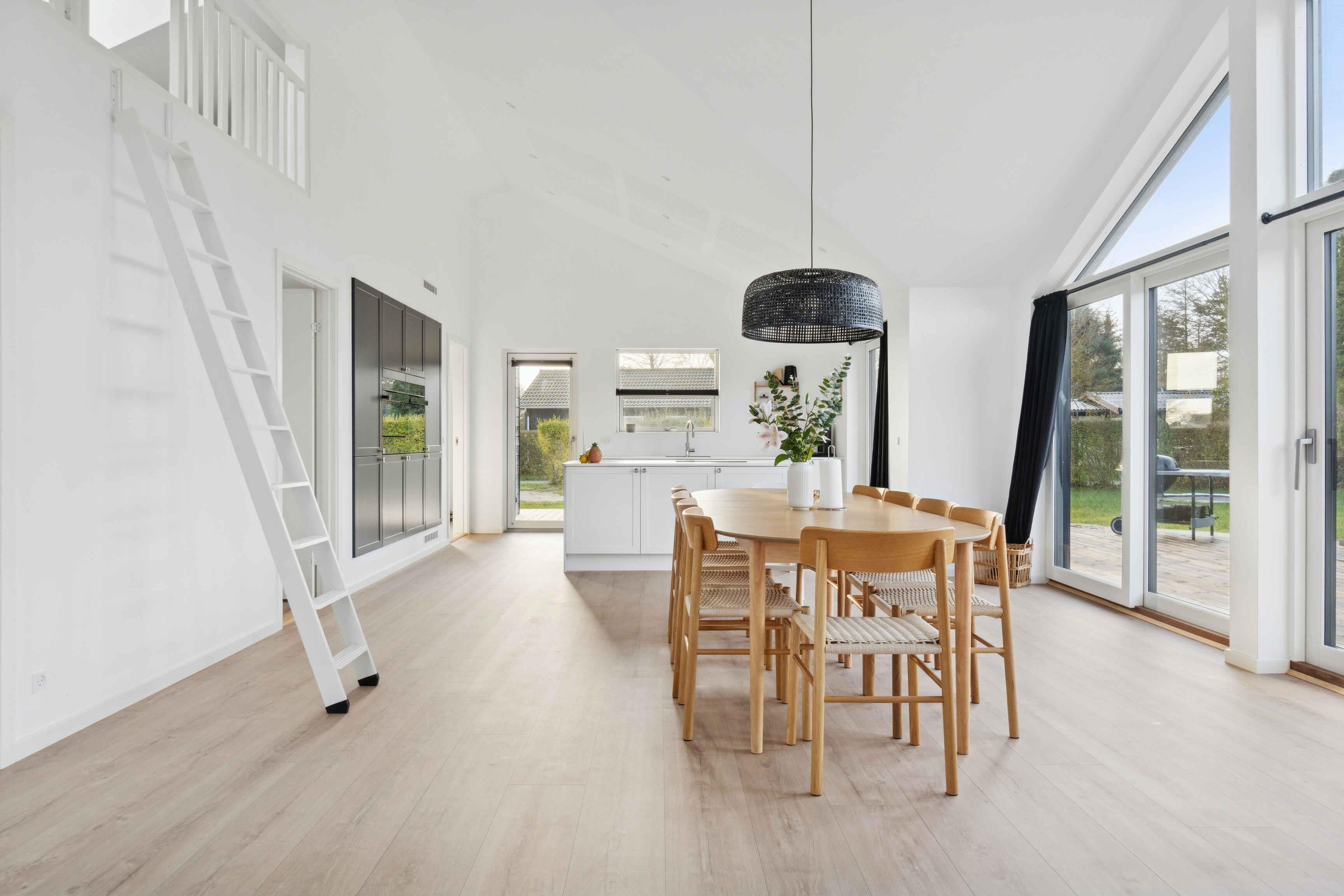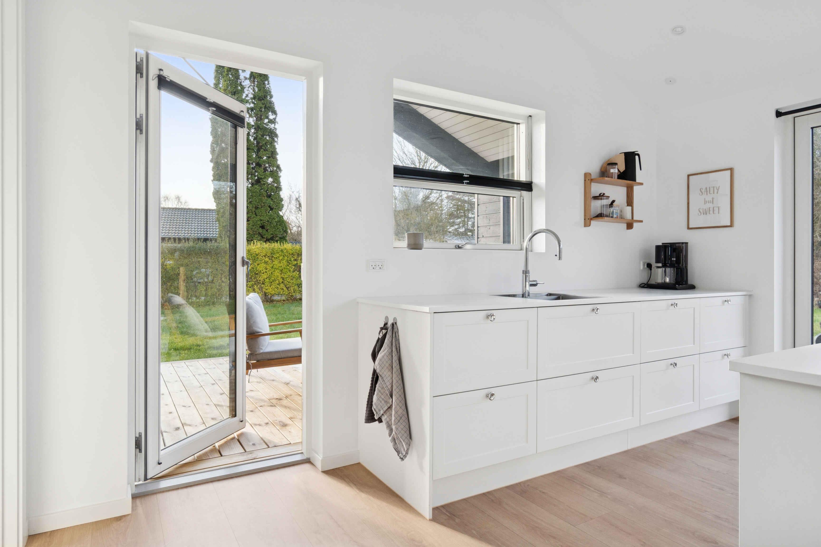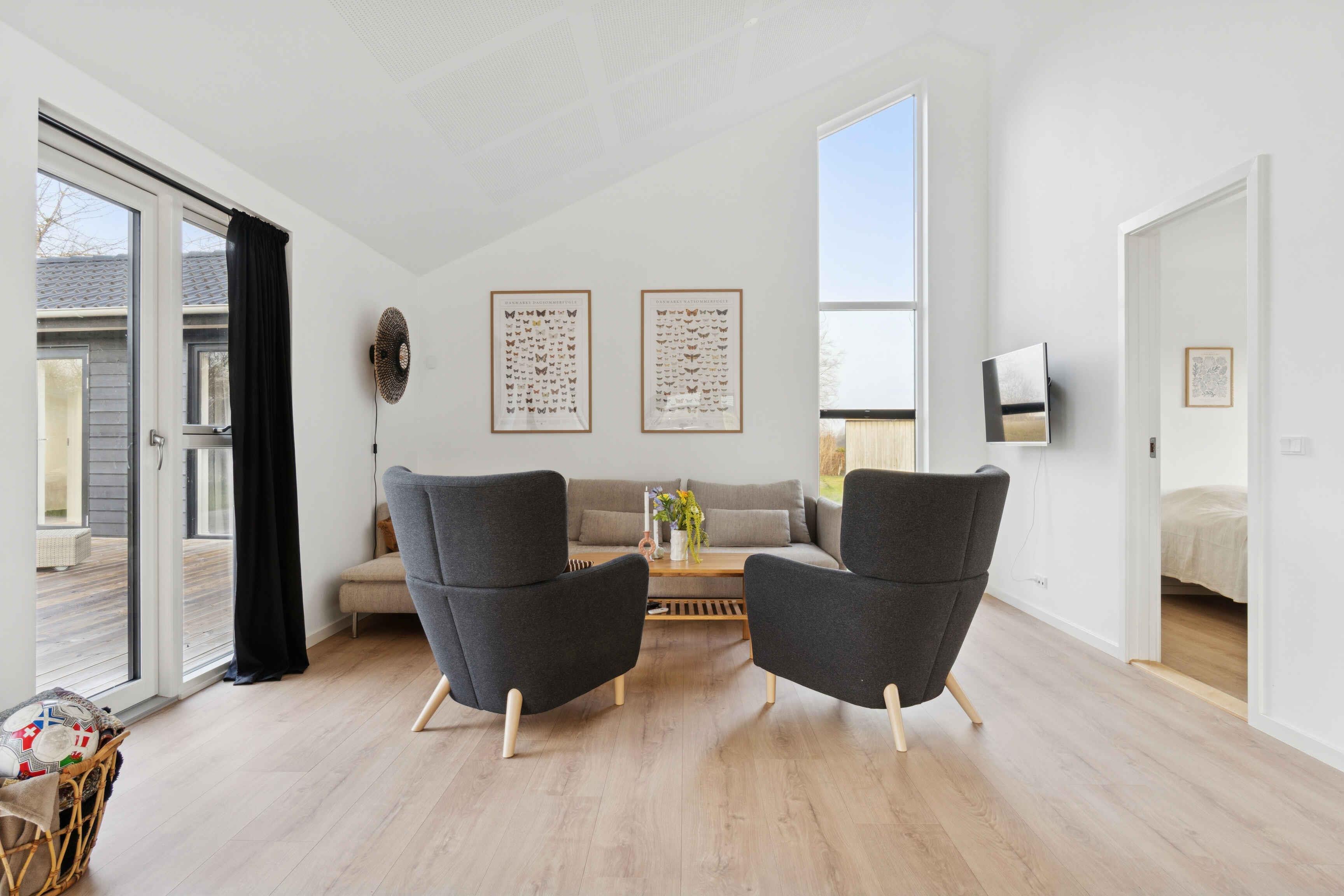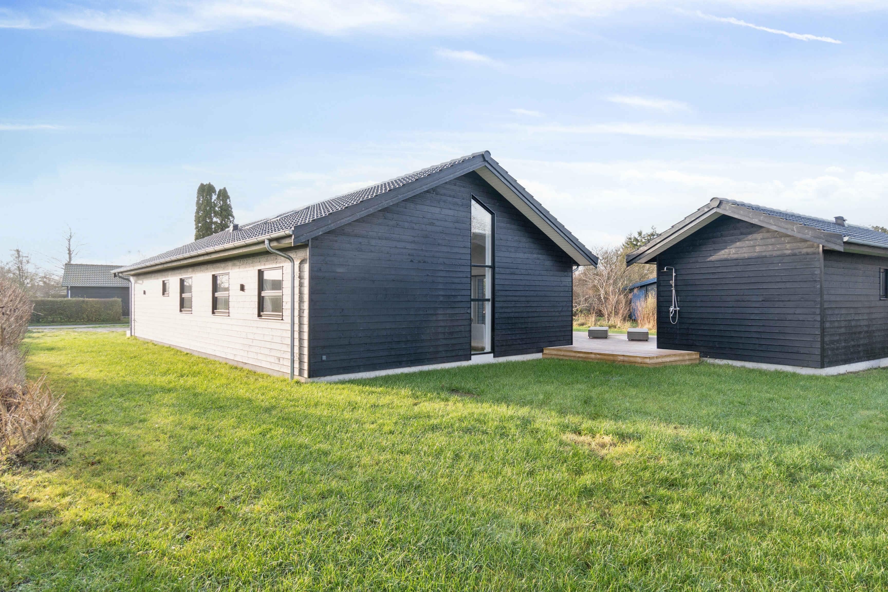 Dieses moderne Luxusferienhaus mit 114 m² verbindet Komfort und Funktionalität in ruhiger Lage. Das Haus verfügt über Fußbodenheizung mit Erdwärme sowie ein 28 m² großes Nebengebäude, das zusätzlichen Platz bietet. Zur Ausstattung gehören 3 Schlafzimmer, eine große abgeschlossene Empore sowie 2 Schlafzimmer im Nebengebäude, jeweils mit eigenem Bad und WC. Ideal für gemeinsames Wohnen und Rückzugsmöglichkeiten. Der Übergang zwischen Innen- und Außenbereich ist fließend. Die 113 m² große Terrasse bietet eine Außendusche und eine kleine Überdachung, perfekt für entspannte Momente bei jedem Wetter. Der Garten ist windgeschützt und ruhig gelegen. Morgens zeigen sich oft Rehe oder Hasen, während Kinder auf dem eingelassenen Trampolin spielen. Die Umgebung ist ideal für Natururlaub. Es sind 250 m bis zum Wasser und 1.000 m bis zum Strand mit Badesteg, Spielplatz, Eisbude, Grill, Restaurant und kleinem Hafen. Ein See in 250 m Entfernung lädt Kinder zum Naturentdecken ein. 750 m entfernt liegt ein Waldgebiet mit Feuerstelle und Schutzhütten sowie eine ruhige Feuerstelle am Fjord. Der Supermarkt ist 1,3 km über einen Feldweg erreichbar. Ein Multisportbereich in 1.000 m Entfernung bietet Fußball, Basketball, Skaten und Tennis. Achtung: Wird nicht für gewerbliche Nutzung vermietet.