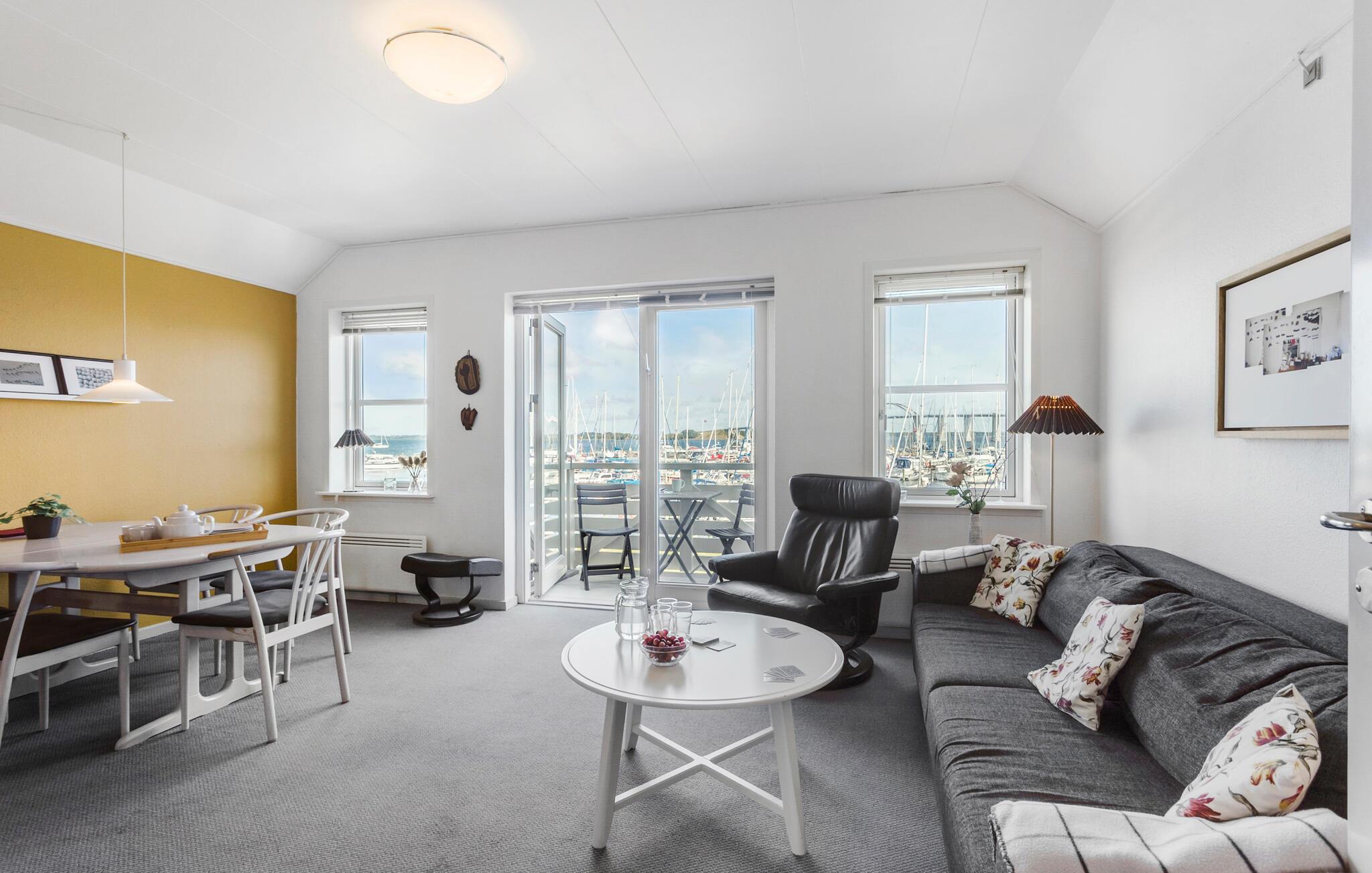 Direkt am Hafen von Rudkøbing auf der Insel Langeland begrüßt Sie diese moderne und komfortable Ferienwohnung. Sie bietet Ihnen einen wunderschönen Blick auf den lebhaften Hafen. Beginnen Sie den Tag mit einer Tasse Kaffee auf Ihrem Balkon, während Sie die Aussicht auf die Segelboote und die idyllische Umgebung genießen. Der schöne Wohnbereich Ihrer Ferienwohnung lädt zum Verweilen ein. Machen Sie es sich auf dem gemütlichen Sofa bequem und genießen Sie die entspannte Atmosphäre. Nutzen Sie den Esstisch für gemeinsame Mahlzeiten mit Blick auf das Hafenpanorama.