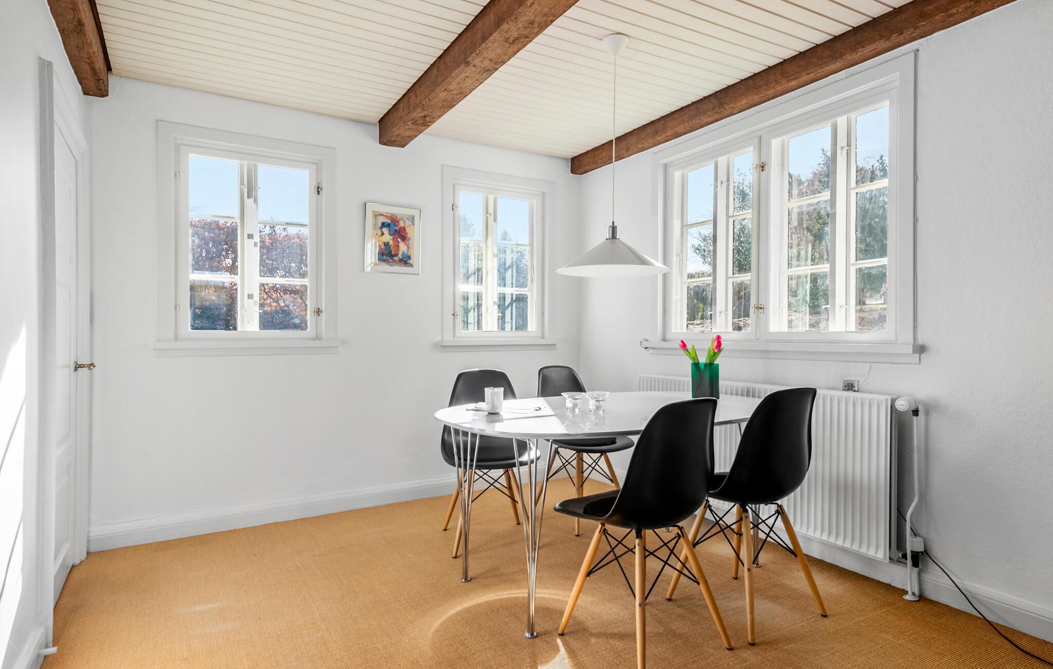 Verbringen Sie erholsame Tage in Ihrem charmanten Fachwerkhaus mit Reetdach, nur wenige Gehminuten vom idyllischen See Rye Mølle Sø entfernt. Das Häuschen ist ideal für Paare oder eine kleine Familie, die Ruhe, Natur und ein besonderes Wohngefühl suchen. Freuen Sie sich auf den hellen Wohnbereich mit sichtbaren Balken und einer geschmackvollen Einrichtung. Machen Sie es sich im Sessel gemütlich oder öffnen Sie die Flügeltüren zur Terrasse und genießen Sie den Blick ins Grüne. Nutzen Sie den Essbereich für gemeinsame Mahlzeiten oder entspannte Spieleabende. In der eleganten Küche bereiten Sie mühelos Frühstück, Mittag oder Abendessen zu.