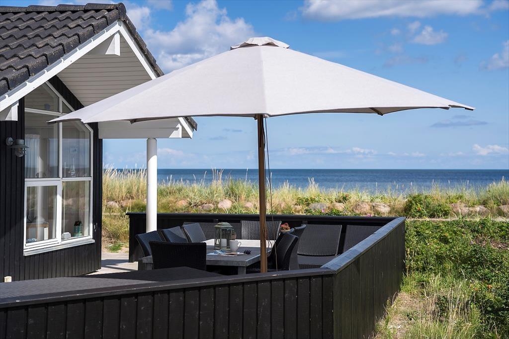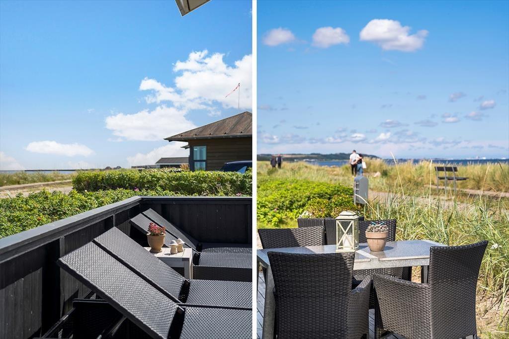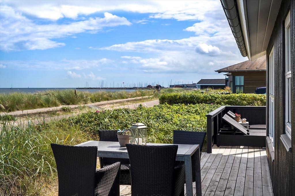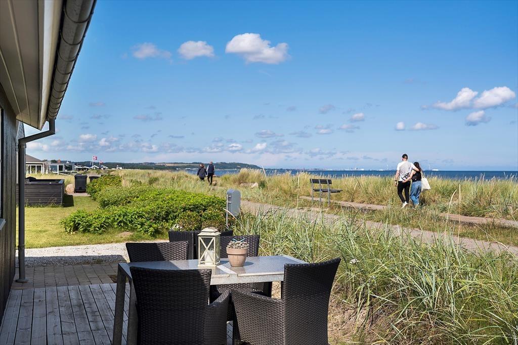 Die große Holzterrasse des Ferienhauses ist ein natürlicher Treffpunkt, wo die Sonne von morgens bis abends genossen werden kann. Hier könnt ihr alle Mahlzeiten des Tages unter freiem Himmel einnehmen, während das Rauschen der Wellen die perfekte Hintergrundmusik liefert. Es dauert nur wenige Sekunden, um schnell hinunter zum Strand zu gehen – ideal für ein erfrischendes Bad im Kattegat oder für Kinder, die Sandburgen bauen, während die Erwachsenen sich in den Gartenstühlen entspannen. Wenn der Abend hereinbricht, könnt ihr den Grill anmachen und ein köstliches Abendessen in der warmen Sommerluft genießen, während ihr den Sonnenuntergang am Horizont beobachtet. Die Kombination aus Terrassenhygge und direktem Strandzugang macht das Leben im Freien hier absolut einzigartig.