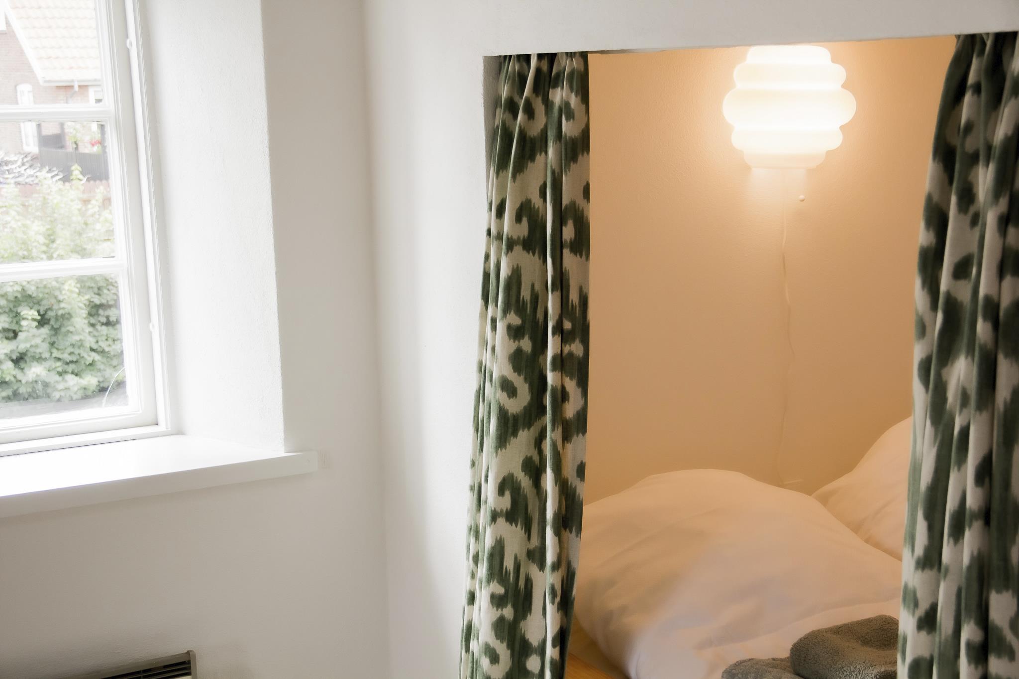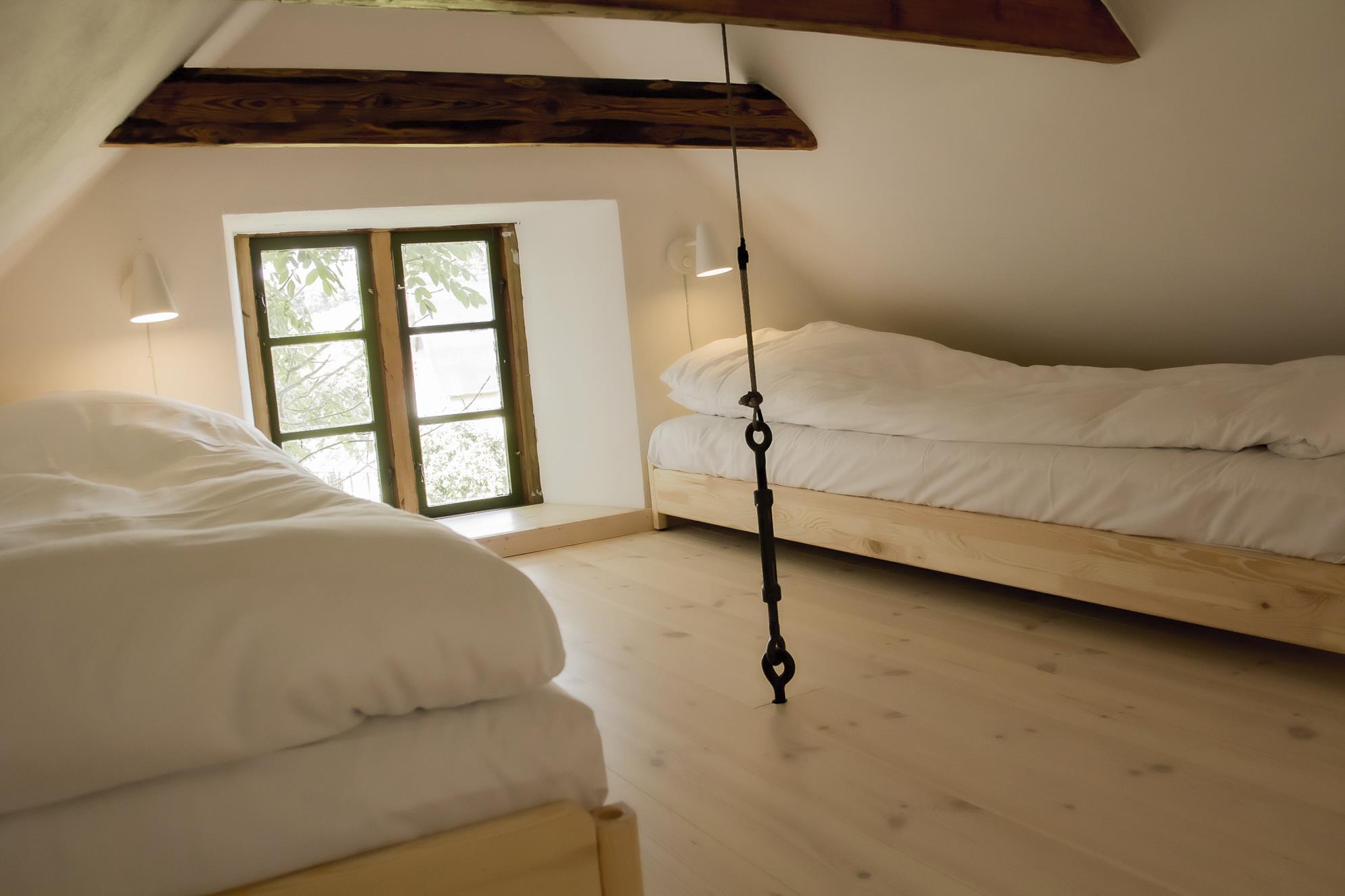 Im ersten Stock befindet sich ein großes und geräumiges Wohnzimmer mit schönen hellen Holzdielen. Es gibt ein Schlafzimmer mit Doppelbett, ein Wohnzimmer mit einem Doppelbett in einer Alkove und ein Schlafboden mit zwei Einzelbetten hinter eleganten Glaswänden zum Wohnzimmer hin. Im ersten Stock gibt es auch ein modernes Badezimmer mit Dusche.
