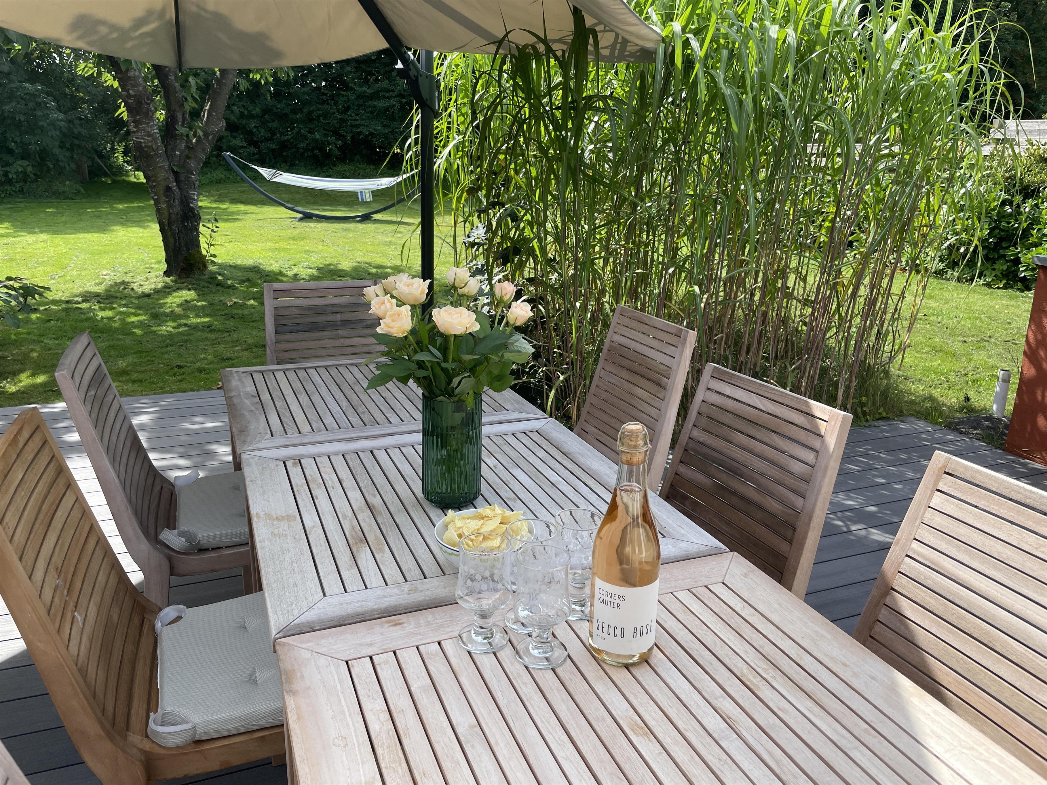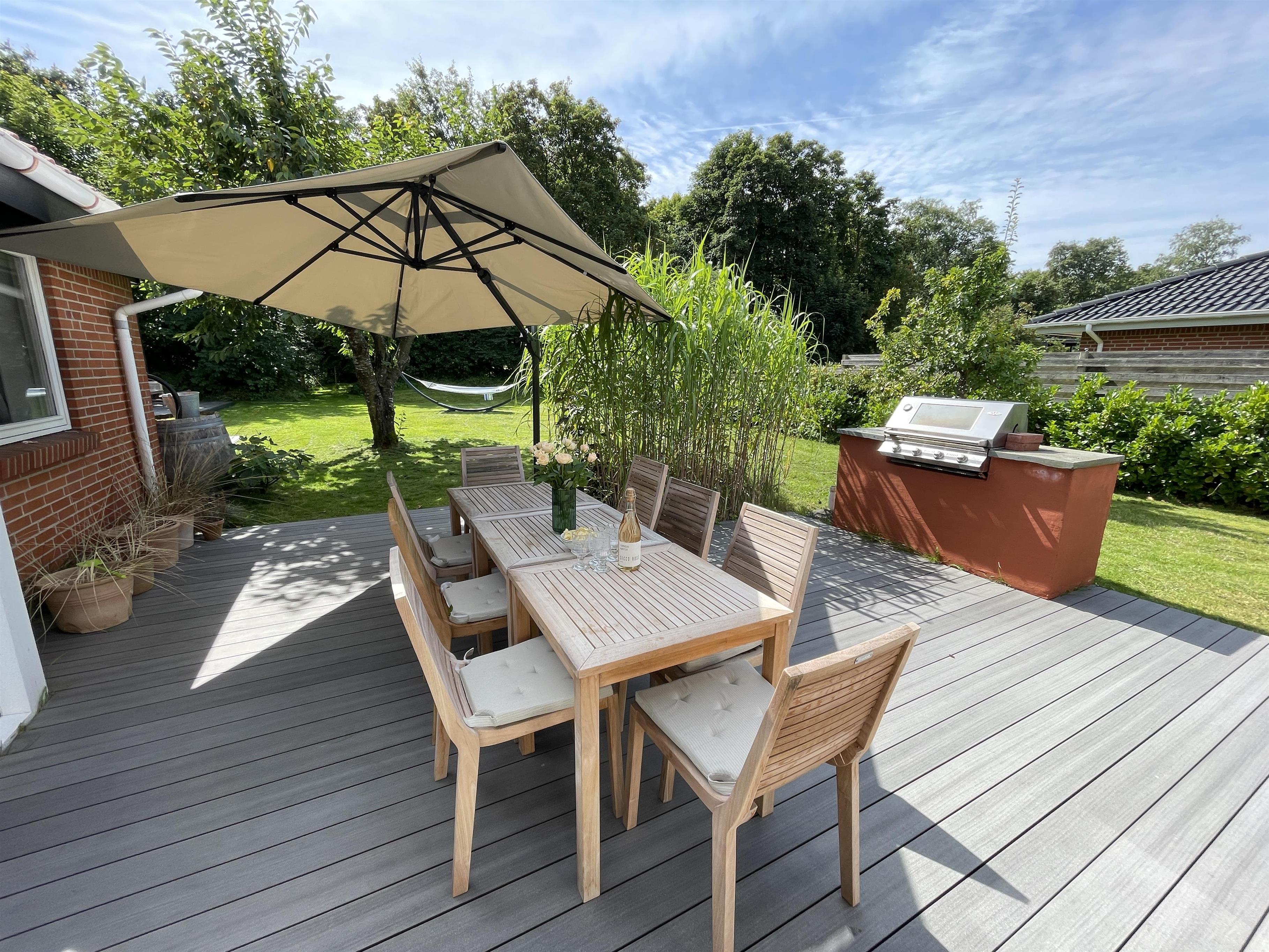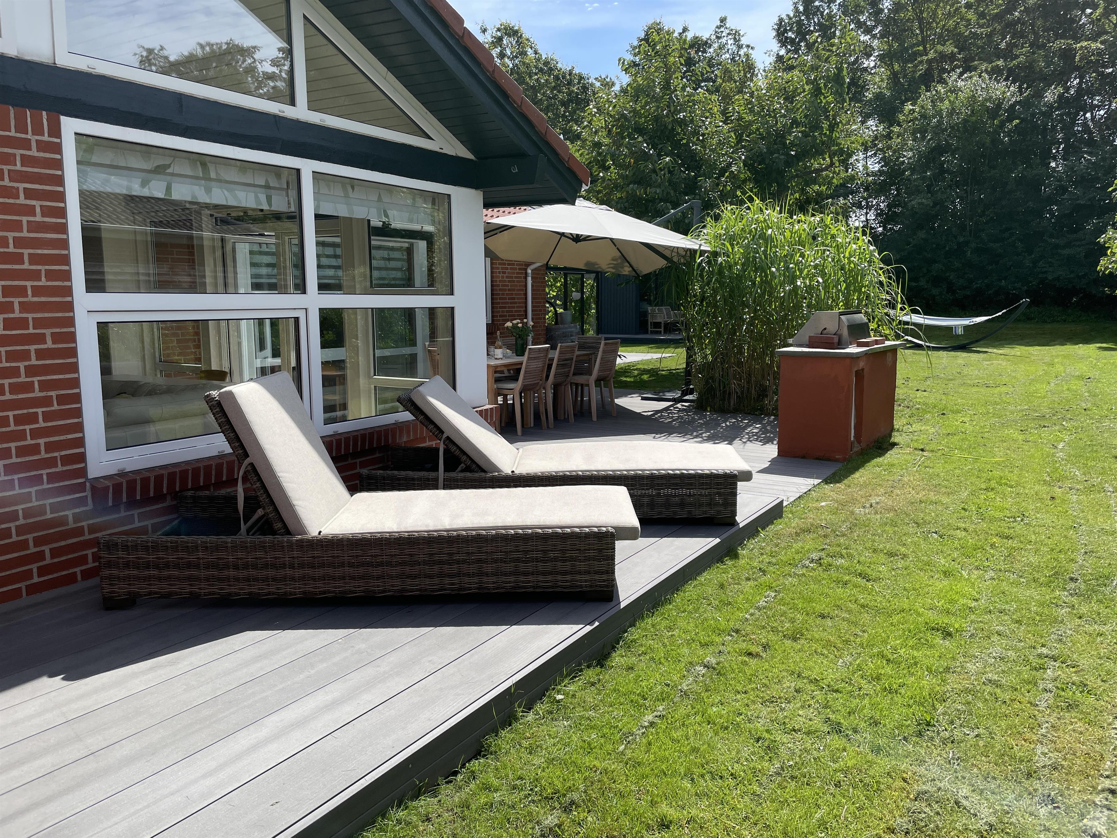 Draußen gibt es eine schöne westlich ausgerichtete und abgeschiedene Holzterrasse im Windschutz des Waldes. Hier gibt es einen gemauerten Gartengrill und eine Außenküche. Auf der Terrasse können Sie das Leben im Freien am Gartentisch oder auf den zwei luxuriösen Sonnenliegen genießen. Es gibt auch einen riesigen Gartenschirm, der über den Esstisch gedreht werden kann. Alle Möbel sind von sehr guter Qualität und es ist ein fantastischer Ort, um die schönen Sommertage und -abende zu genießen.