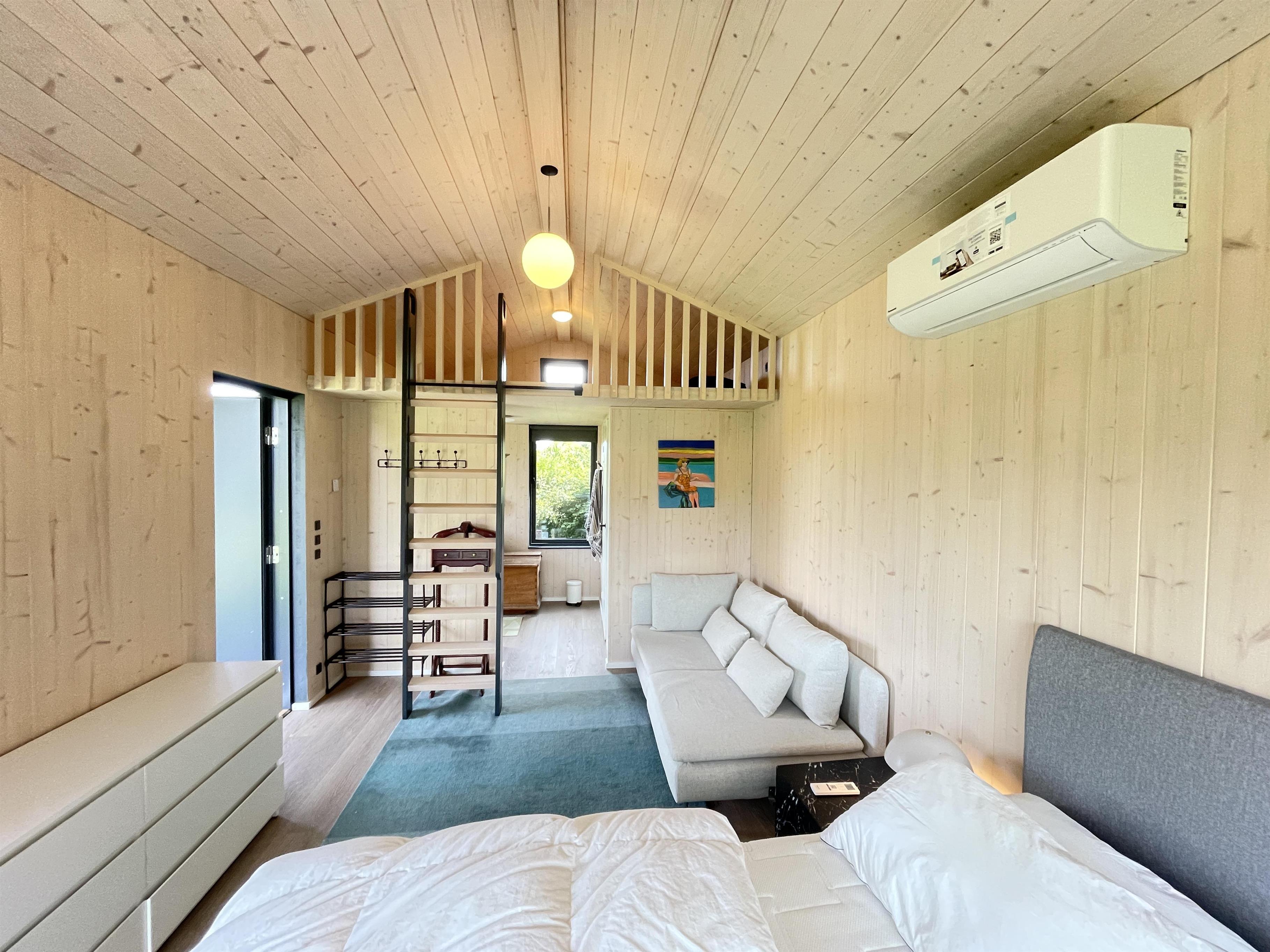 Es gibt insgesamt 3 hochwertige Doppelbetten: 2 in den beiden Schlafzimmern des Hauses und 1 im Tiny House, wo auch Platz für 2 Personen auf dem Schlafboden (+2 Kinder) ist.