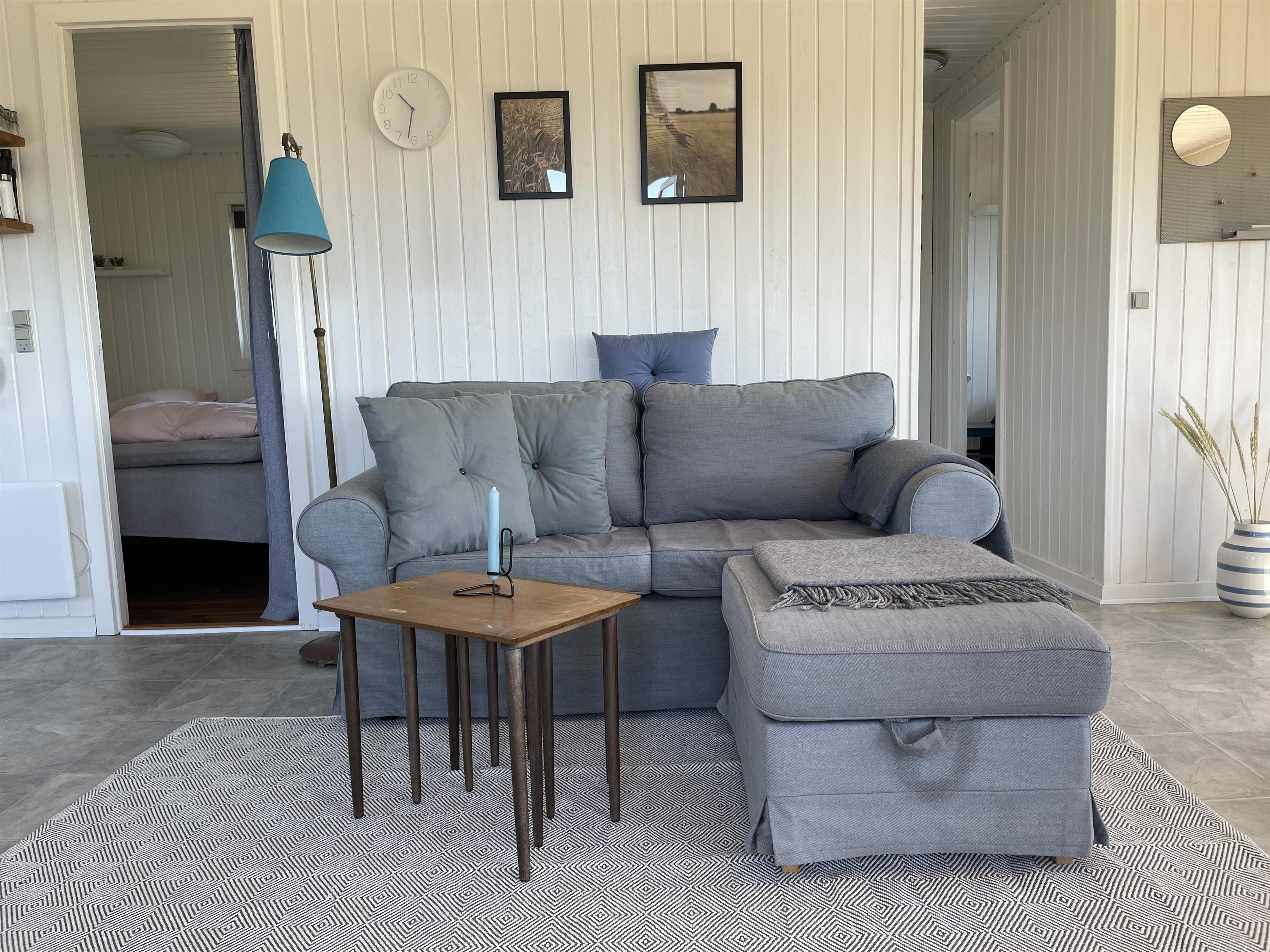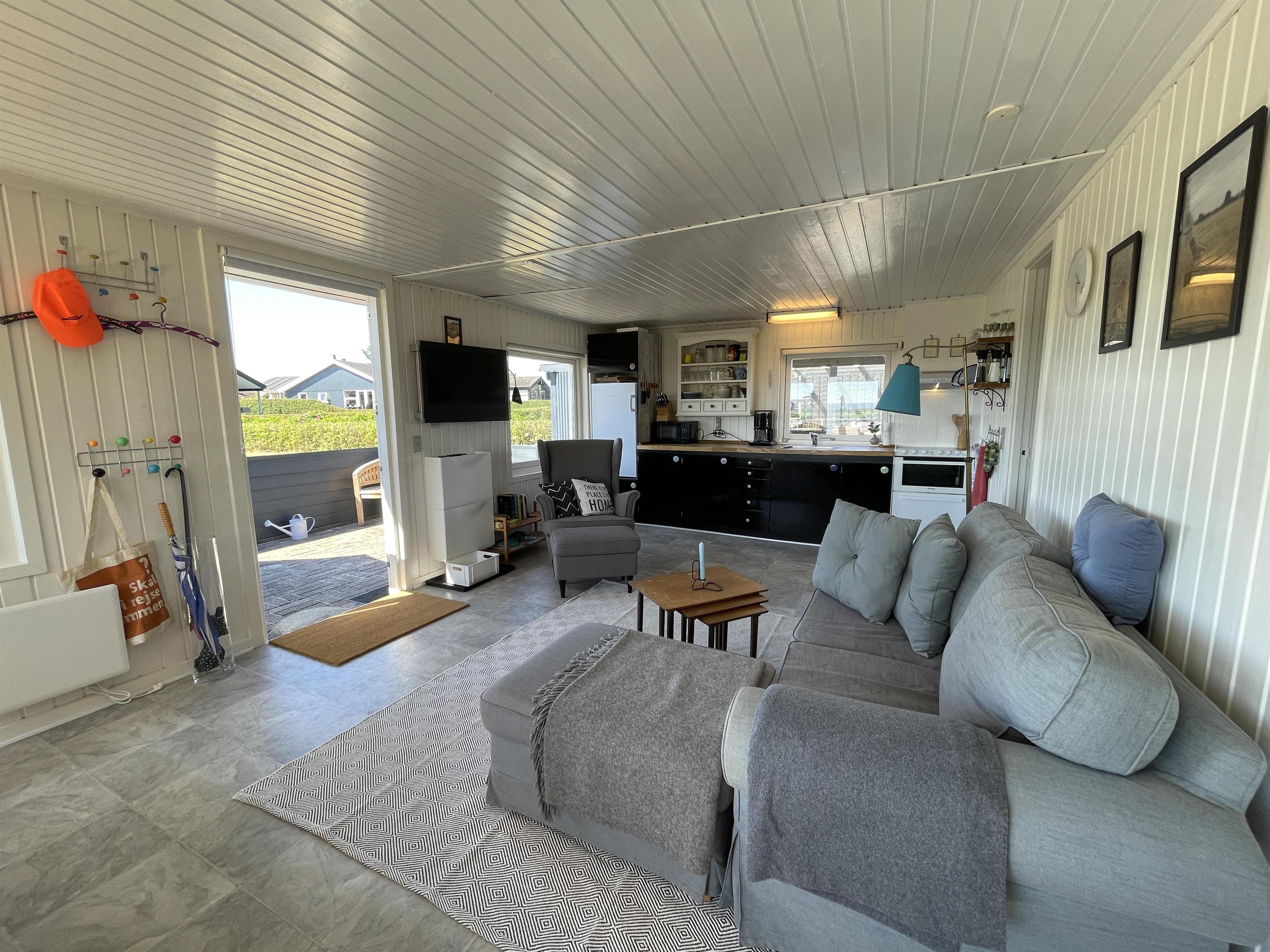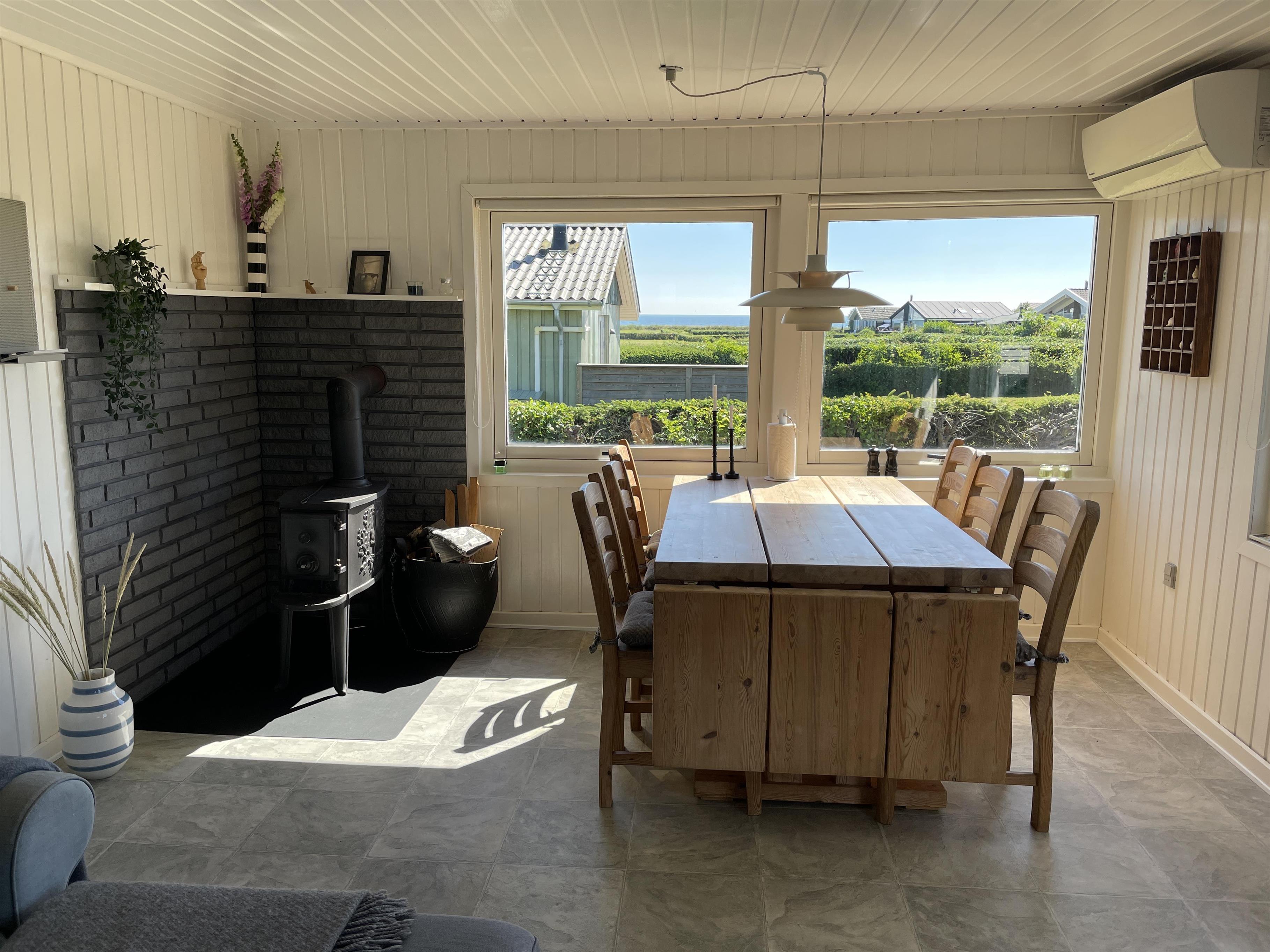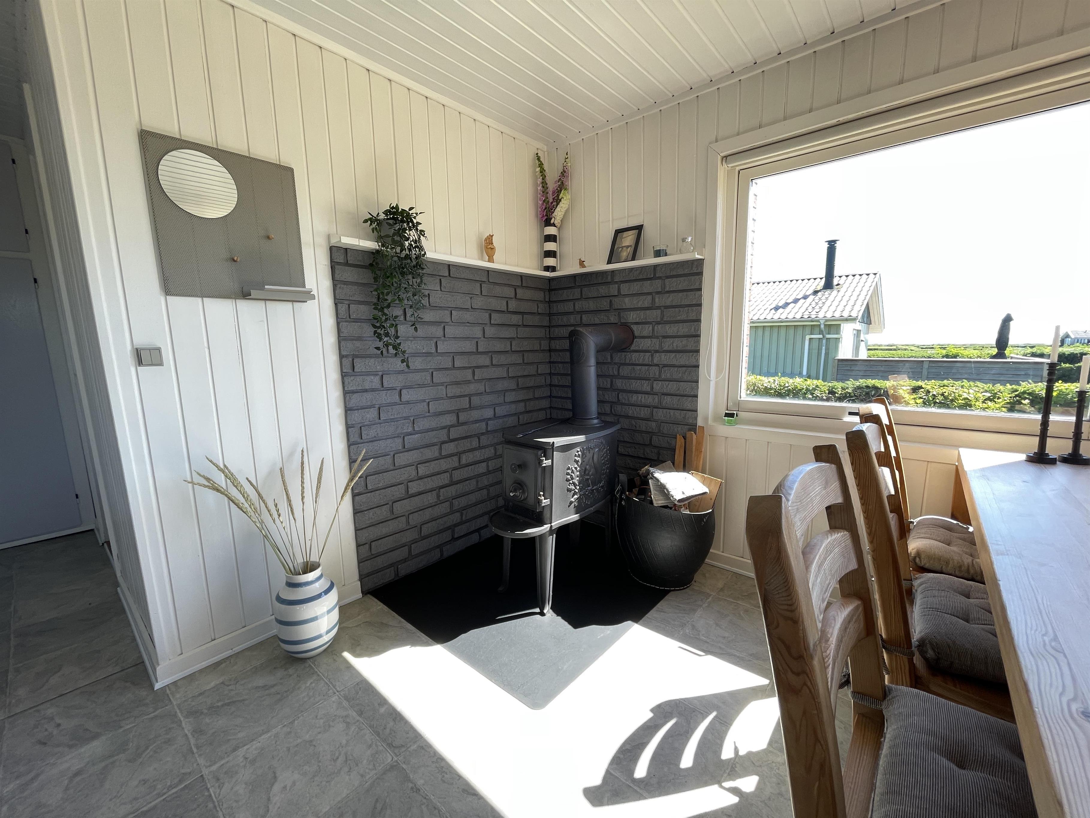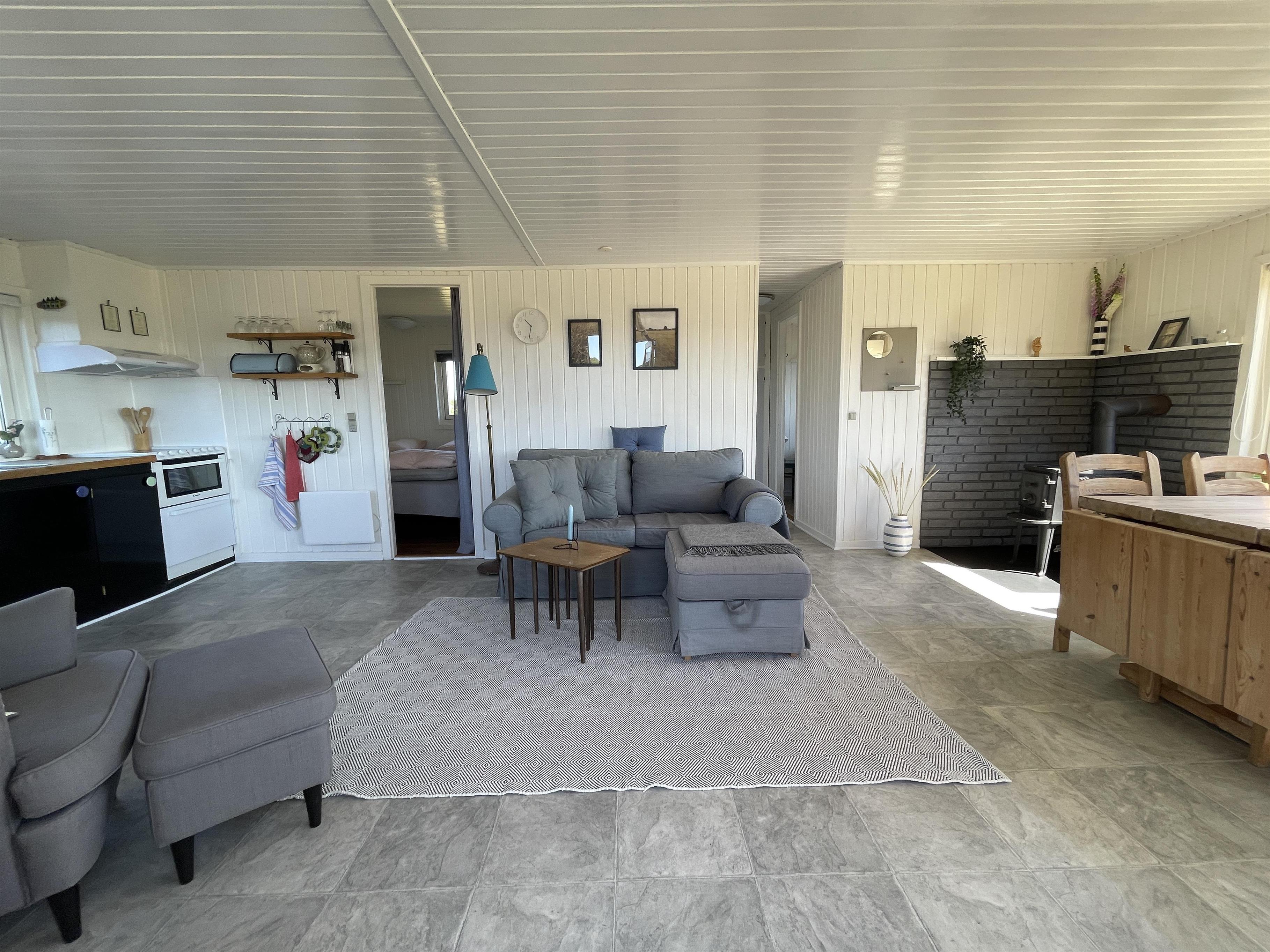 Es gibt 2 Schlafzimmer, jeweils an einem Ende des Hauses, mit Platz für insgesamt 4 Personen. Die Küche ist schön und es gibt alles, was man braucht, um Sommeressen zuzubereiten und anzurichten. Küche, Wohnzimmer und Esstisch sind in einem großen und hellen Raum gut miteinander verbunden, mit einem Kamin in einer Ecke. Es gibt ein bequemes Sofa und einen guten Sessel im Wohnzimmer sowie einen schönen Holzesstisch mit einem wirklich guten Blick auf das Meer und die berühmte schöne Strandpromenade, die zum Hafen in Sæby führt.