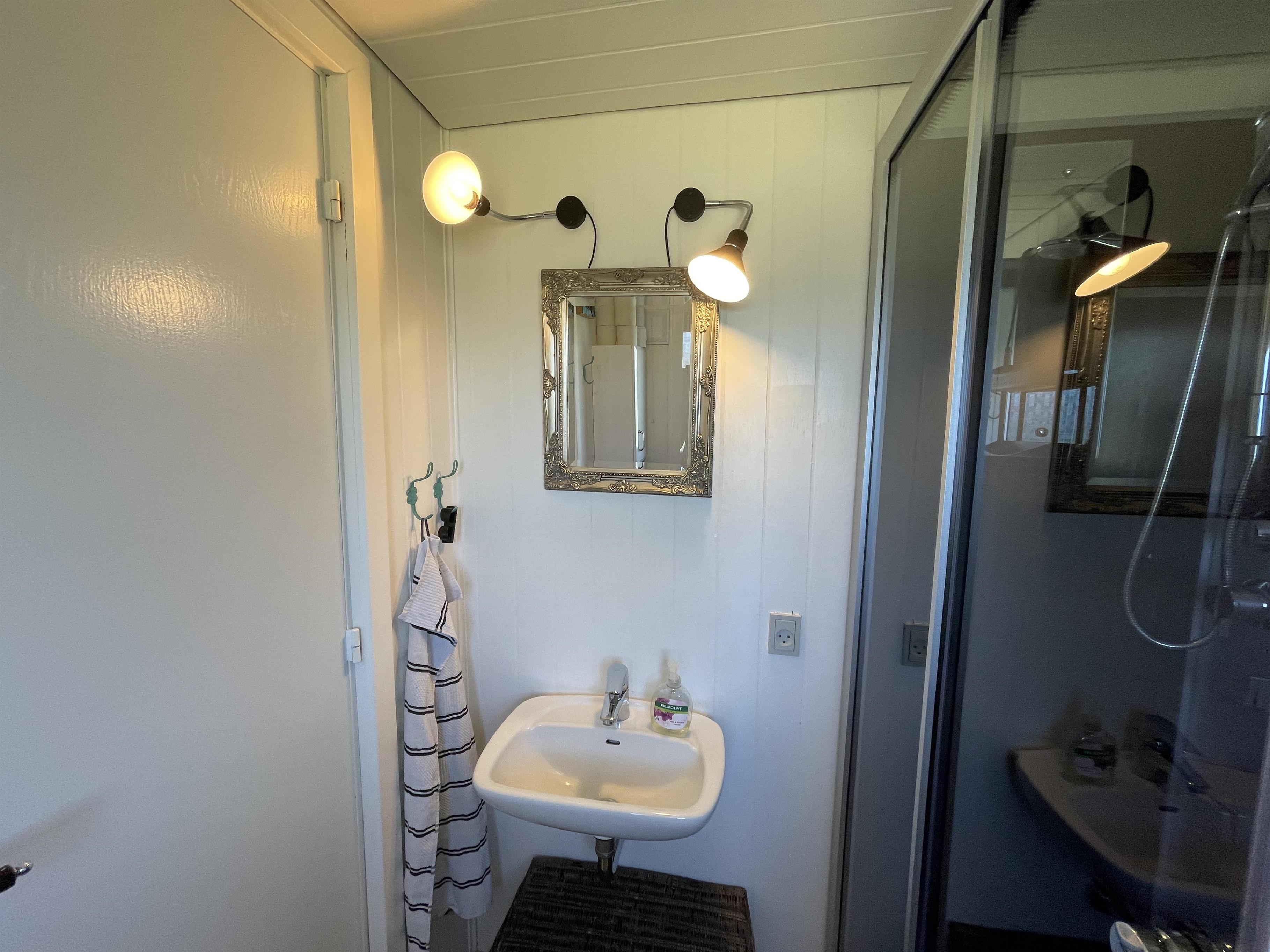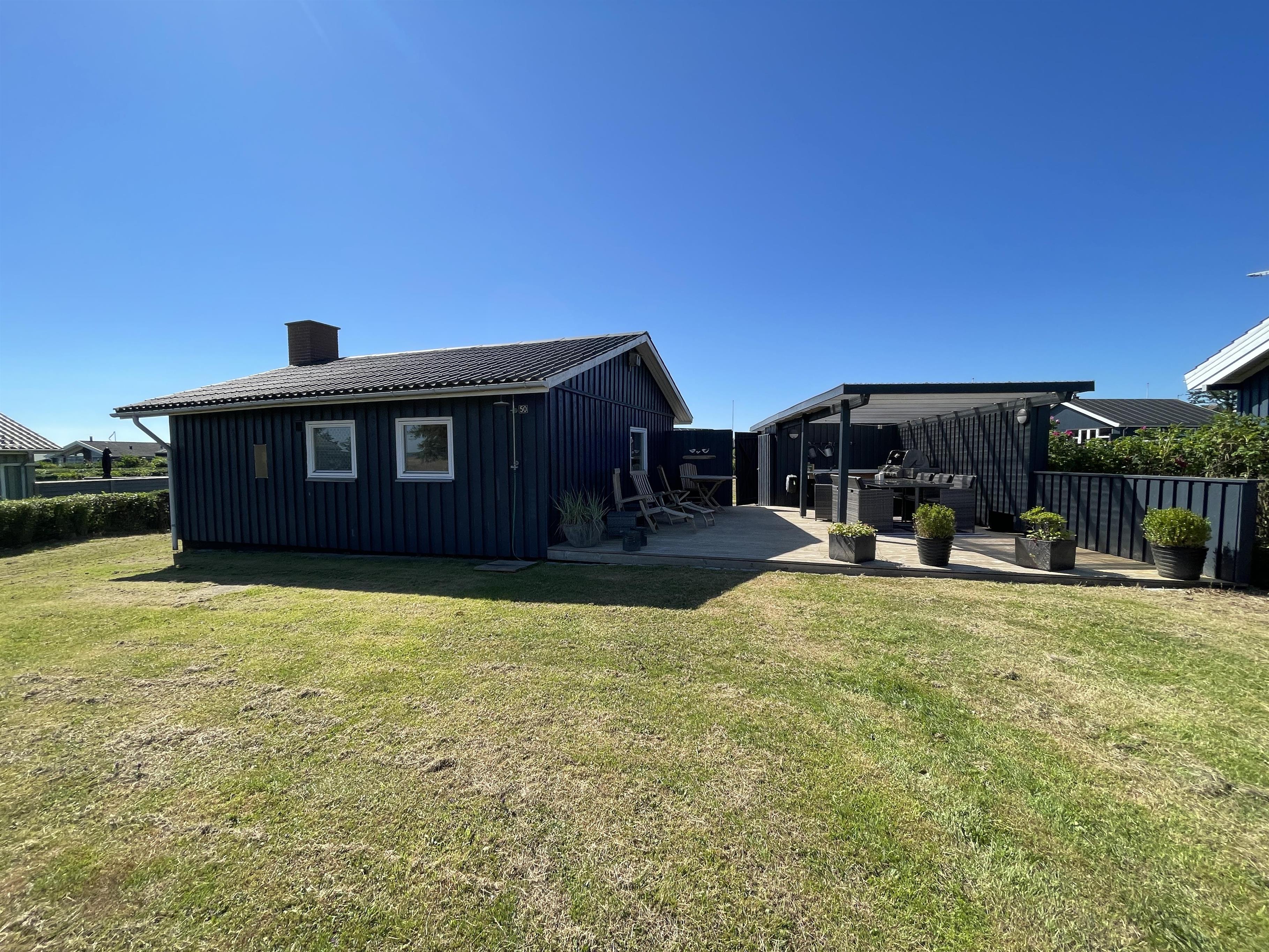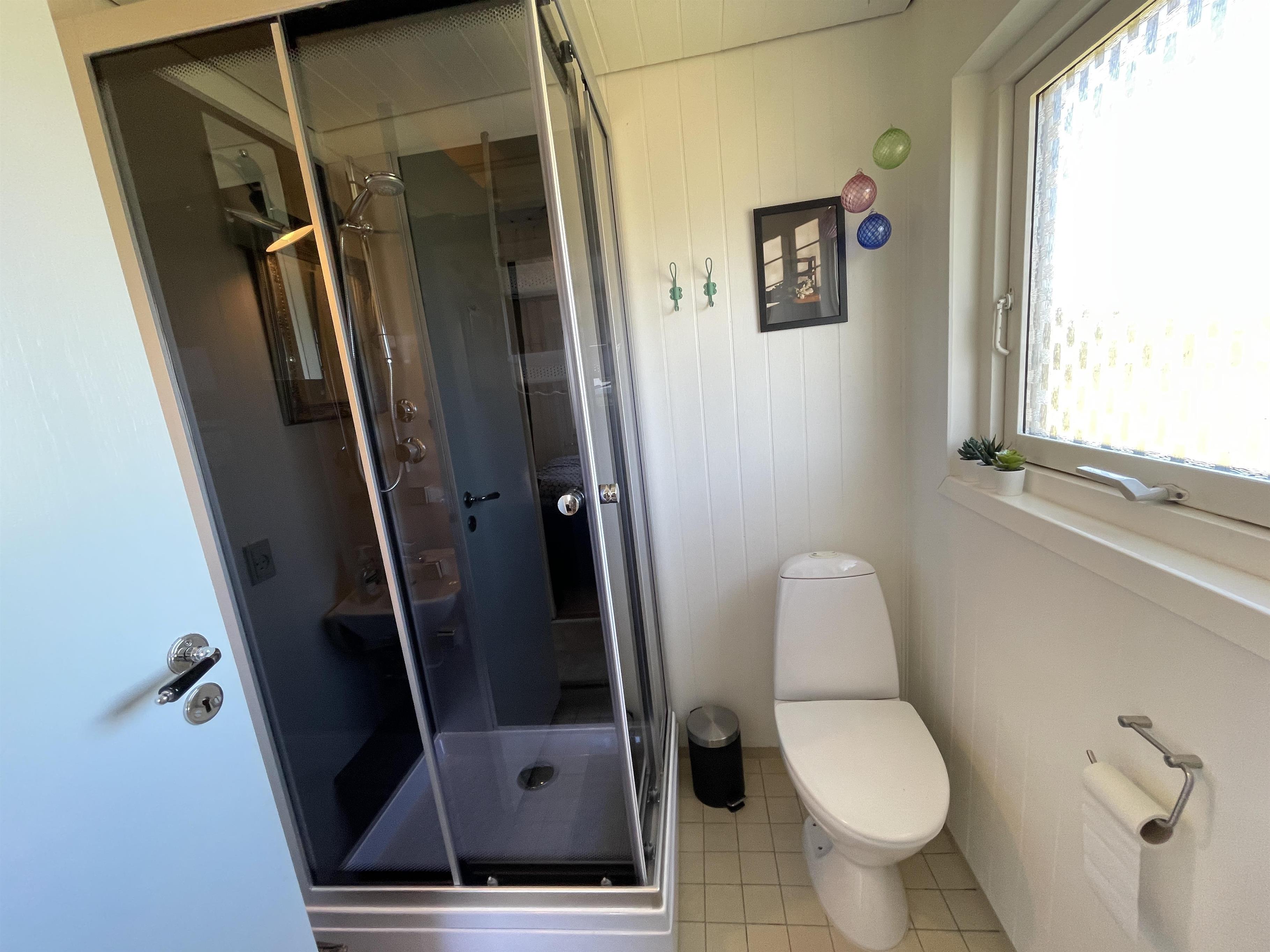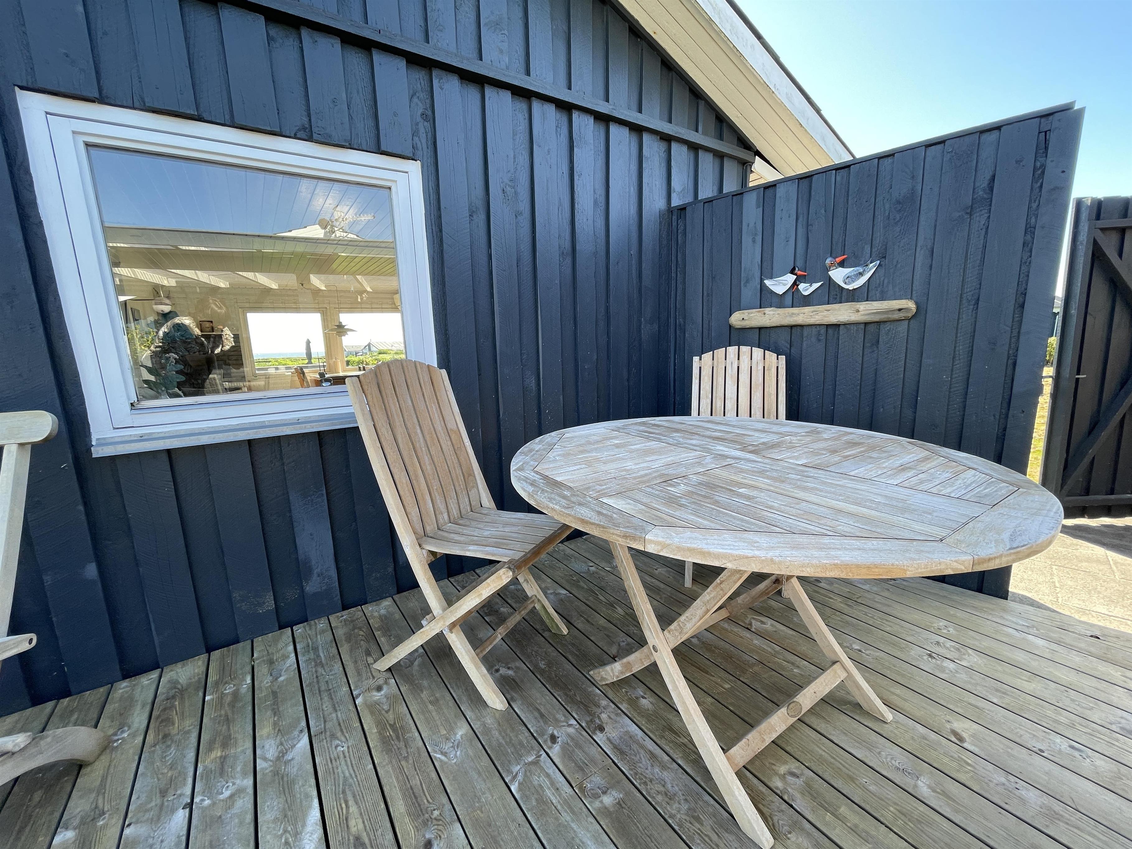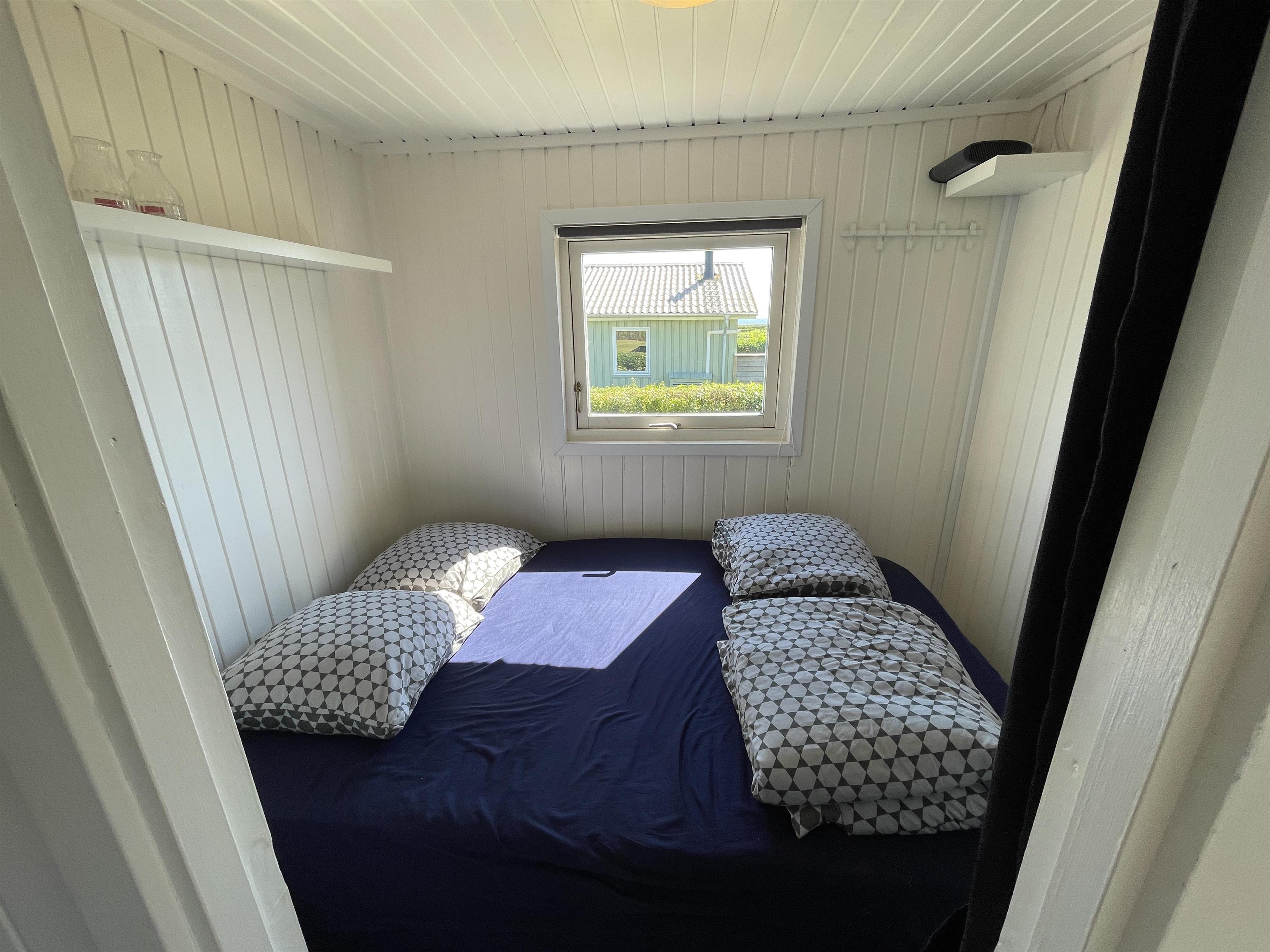 Es gibt 2 Schlafzimmer, jeweils an einem Ende des Hauses, mit Platz für insgesamt 4 Personen. Die Küche ist schön und es gibt alles, was man braucht, um Sommeressen zuzubereiten und anzurichten. Küche, Wohnzimmer und Esstisch sind in einem großen und hellen Raum gut miteinander verbunden, mit einem Kamin in einer Ecke. Es gibt ein bequemes Sofa und einen guten Sessel im Wohnzimmer sowie einen schönen Holzesstisch mit einem wirklich guten Blick auf das Meer und die berühmte schöne Strandpromenade, die zum Hafen in Sæby führt.