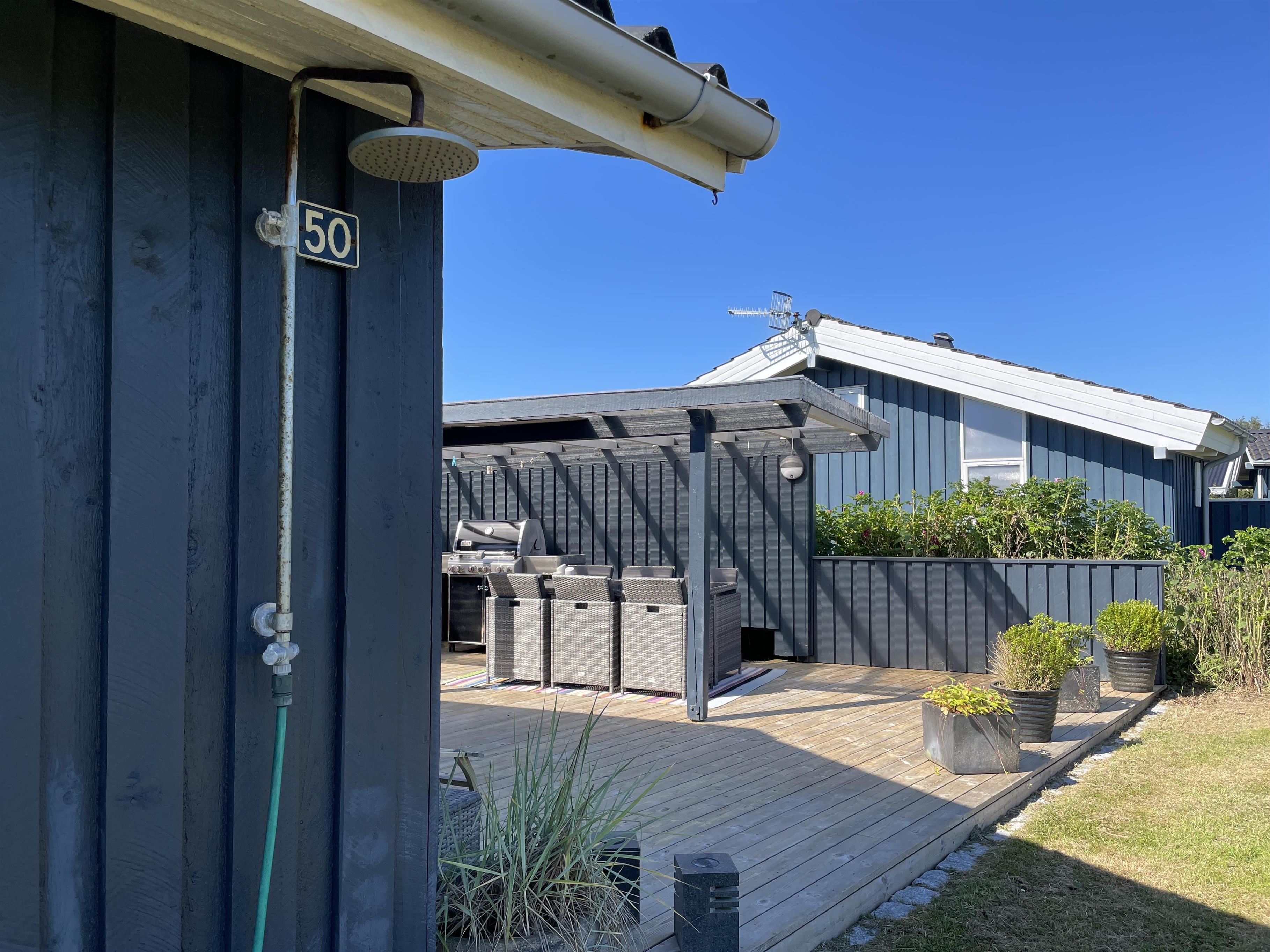 Es gibt eine Außendusche und eine Außenküche mit Wasseranschluss in Verbindung mit der Abendterrasse.