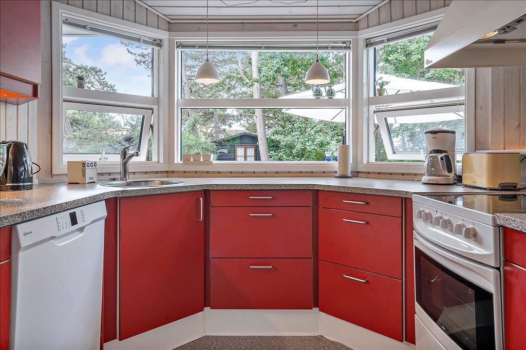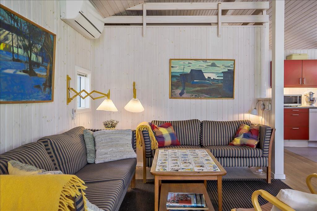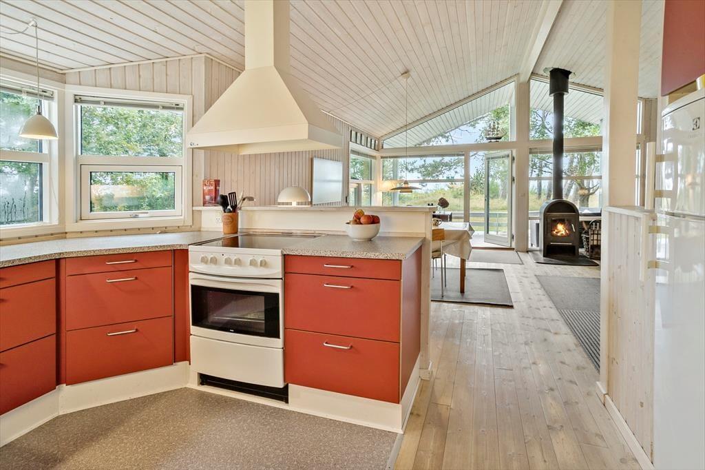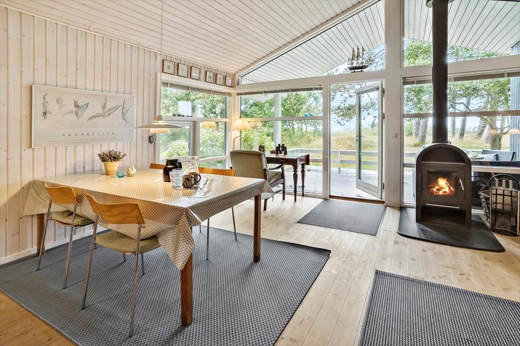 Bei deinem Urlaubsdomizil handelt es sich um ein klassisches, helles Ferienhaus, dessen große Fenster eine schöne Verbindung zur Natur schaffen und zugleich einen schönen Tageslichteinfall gewährleisten. Viele gesellige und erholsame Stunden verbringst du mit deinen Lieben im Aufenthaltsraum, der die Küche, den Essplatz und den Wohnraum offen in sich vereint. Die Küche ist lediglich durch eine halbhohe Mauer vom Rest des Raumes getrennt, sodass du selbst bei der Zubereitung der Mahlzeiten die Nähe und Gesellschaft deiner Familie genießt. Die große Fensterpartie mit einer Terrassentür an der Giebelseite deines Hauses untermalt eure gemeinsamen Essen am Esstisch mit einer hübschen Aussicht in Richtung Wasser. In der gemütlichen Polstersitzgruppe kannst du dich nach einem erlebnisreichen Urlaubstag entspannen und mit deinen Mitreisenden einen unterhaltsamen Filmabend genießen. An kühlen Tagen sorgt der im Aufenthaltsraum platzierte Kaminofen für behagliche Wärme und für ein Maximum an echter dänischer Ferienhausstimmung.