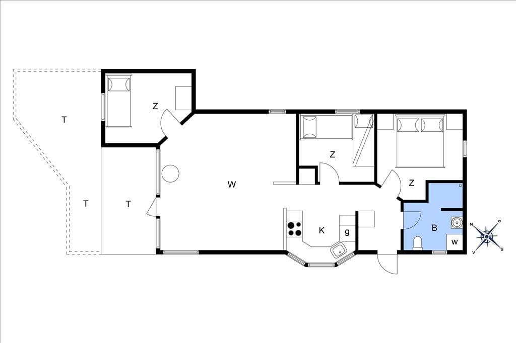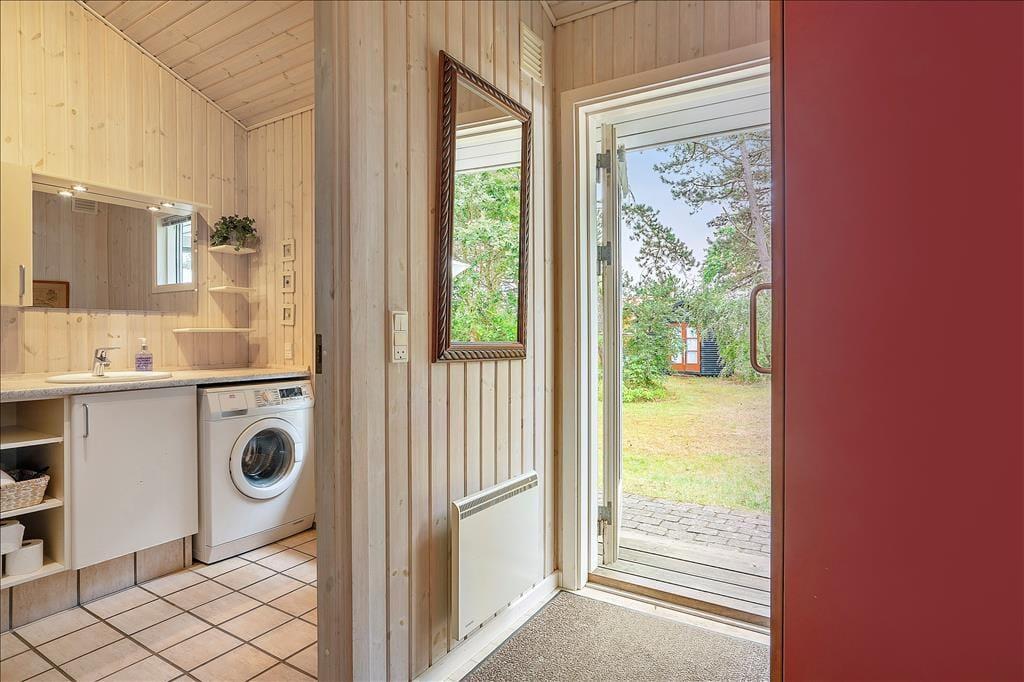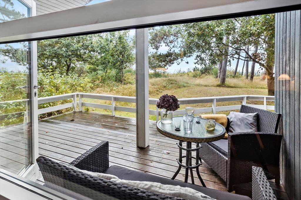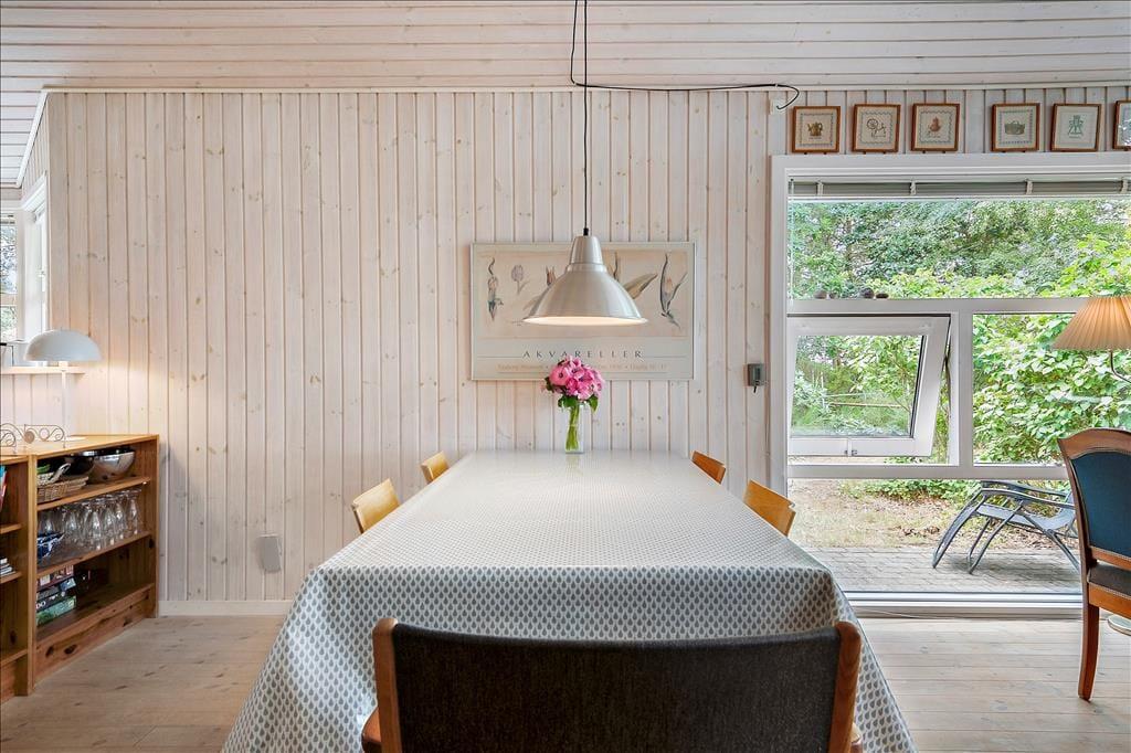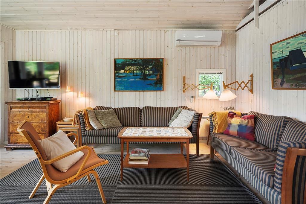 Bei deinem Urlaubsdomizil handelt es sich um ein klassisches, helles Ferienhaus, dessen große Fenster eine schöne Verbindung zur Natur schaffen und zugleich einen schönen Tageslichteinfall gewährleisten. Viele gesellige und erholsame Stunden verbringst du mit deinen Lieben im Aufenthaltsraum, der die Küche, den Essplatz und den Wohnraum offen in sich vereint. Die Küche ist lediglich durch eine halbhohe Mauer vom Rest des Raumes getrennt, sodass du selbst bei der Zubereitung der Mahlzeiten die Nähe und Gesellschaft deiner Familie genießt. Die große Fensterpartie mit einer Terrassentür an der Giebelseite deines Hauses untermalt eure gemeinsamen Essen am Esstisch mit einer hübschen Aussicht in Richtung Wasser. In der gemütlichen Polstersitzgruppe kannst du dich nach einem erlebnisreichen Urlaubstag entspannen und mit deinen Mitreisenden einen unterhaltsamen Filmabend genießen. An kühlen Tagen sorgt der im Aufenthaltsraum platzierte Kaminofen für behagliche Wärme und für ein Maximum an echter dänischer Ferienhausstimmung.