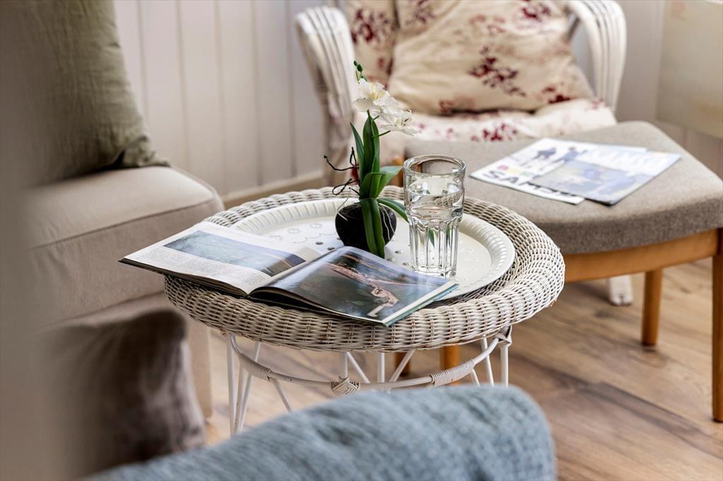 Von der Küche aus geht es ein paar Stufen hinauf ins Wohnzimmer, welches das Herzstück und der Treffpunkt des Hauses ist. Der Wintergarten hat Panoramafenster, die den Blick auf das Meer freigeben, was es nahezu unmöglich macht, sich von diesem überwältigenden Anblick loszureißen. Im Wintergarten steht der Esstisch mit Sitzgelegenheiten für alle, sodass du deine Mahlzeiten bei jedem Wetter mit fantastischer Aussicht als Hintergrund genießen kannst. Neben dem Esstisch gibt es eine kleine Sofaecke und einen Sessel. Hier könnt ihr euch mit einem guten Buch entspannen oder eine Tasse Kaffee am Nachmittag genießen. Außerdem könnt ihr hier viele Stunden zusammen verbringen und den Sonnenuntergang sowie den wunderschönen Meerblick genießen. Das Wohnzimmer ist gemütlich und einladend mit hellen Holzwänden und -decken. Es gibt ein bequemes Sofa und einen Sessel, von denen aus ihr fernsehen könnt, es sei denn, ihr seid eher in der Stimmung für ein unterhaltsames Gesellschaftsspiel oder ein anregendes Gespräch. Das Wohnzimmer verfügt auch über einen Kaminofen, sodass ihr es drinnen gemütlich habt, auch wenn es draußen kalt ist. Vom Wohnzimmer aus führt eine Treppe hinunter zu den beiden Schlafzimmern. In dem einen, das einen Blick auf das Meer bietet, steht ein Doppelbett. Im anderen Zimmer mit zwei Einzelbetten gibt das Fenster den Blick auf die grüne Umgebung frei.