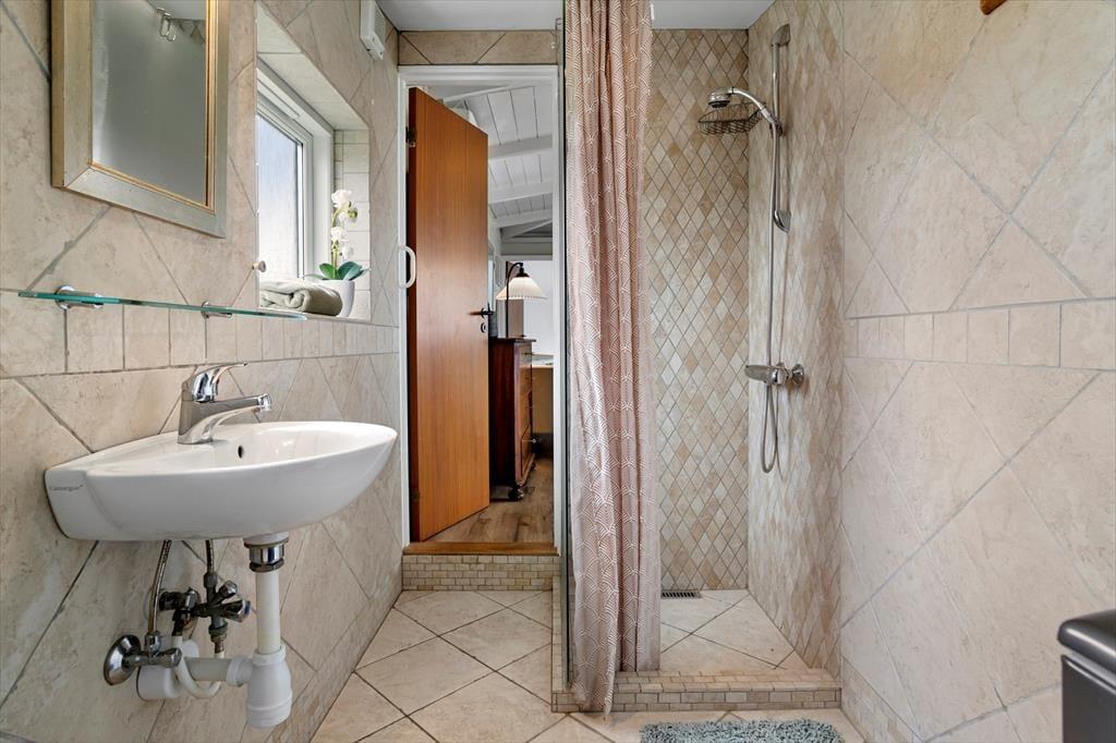 Das Badezimmer ist mit hellen Fliesen ausgestattet und verfügt über eine Dusche und eine Waschmaschine, sodass alle Voraussetzungen für einen tollen Urlaub in diesem schönen, hellen und charmanten Ferienhaus gegeben sind. Du kannst dich auf einen Urlaub in diesem Ferienhaus freuen, das durch seine Lage so nah am Meer und der Natur von Samsø einzigartig ist.