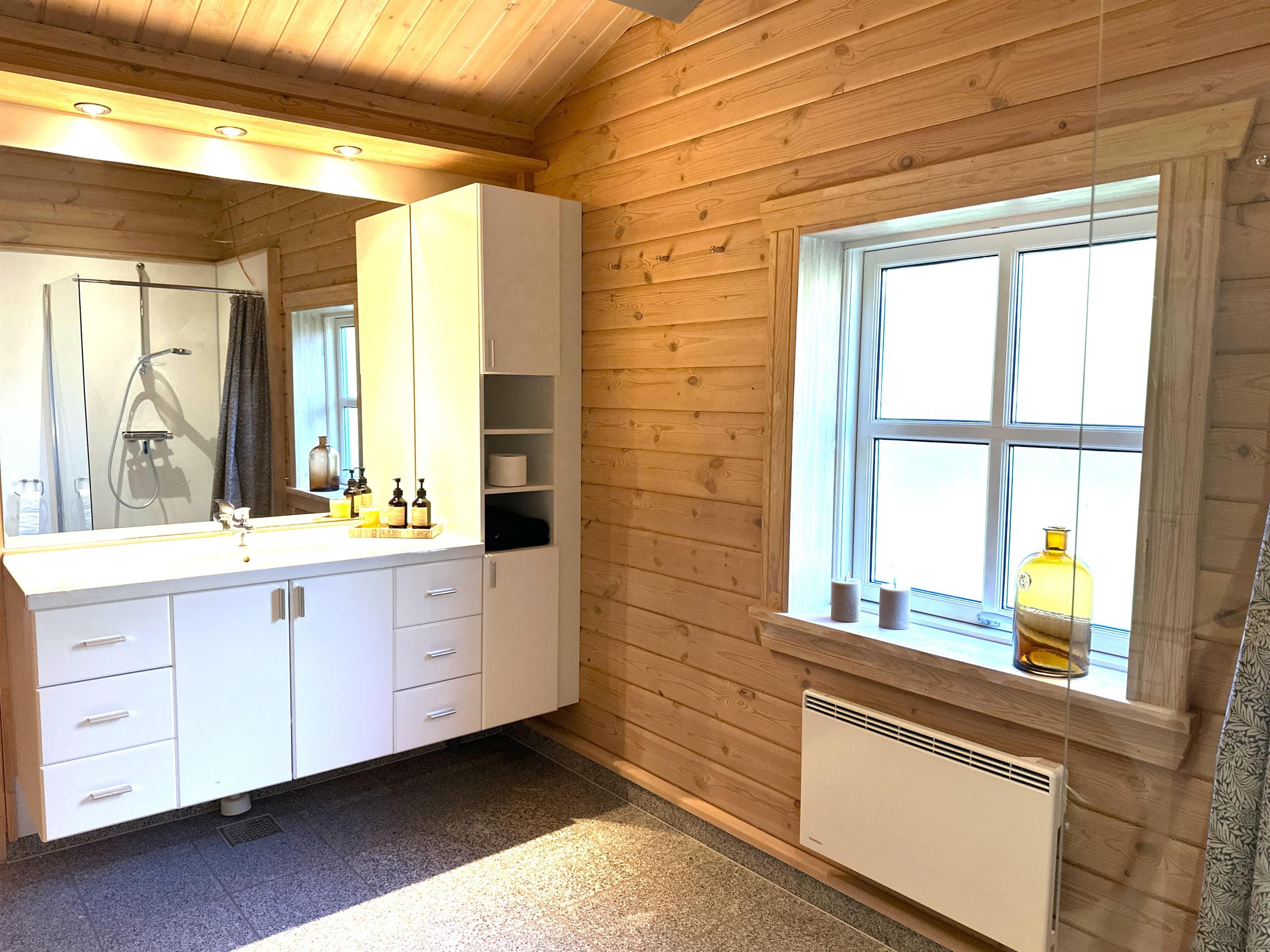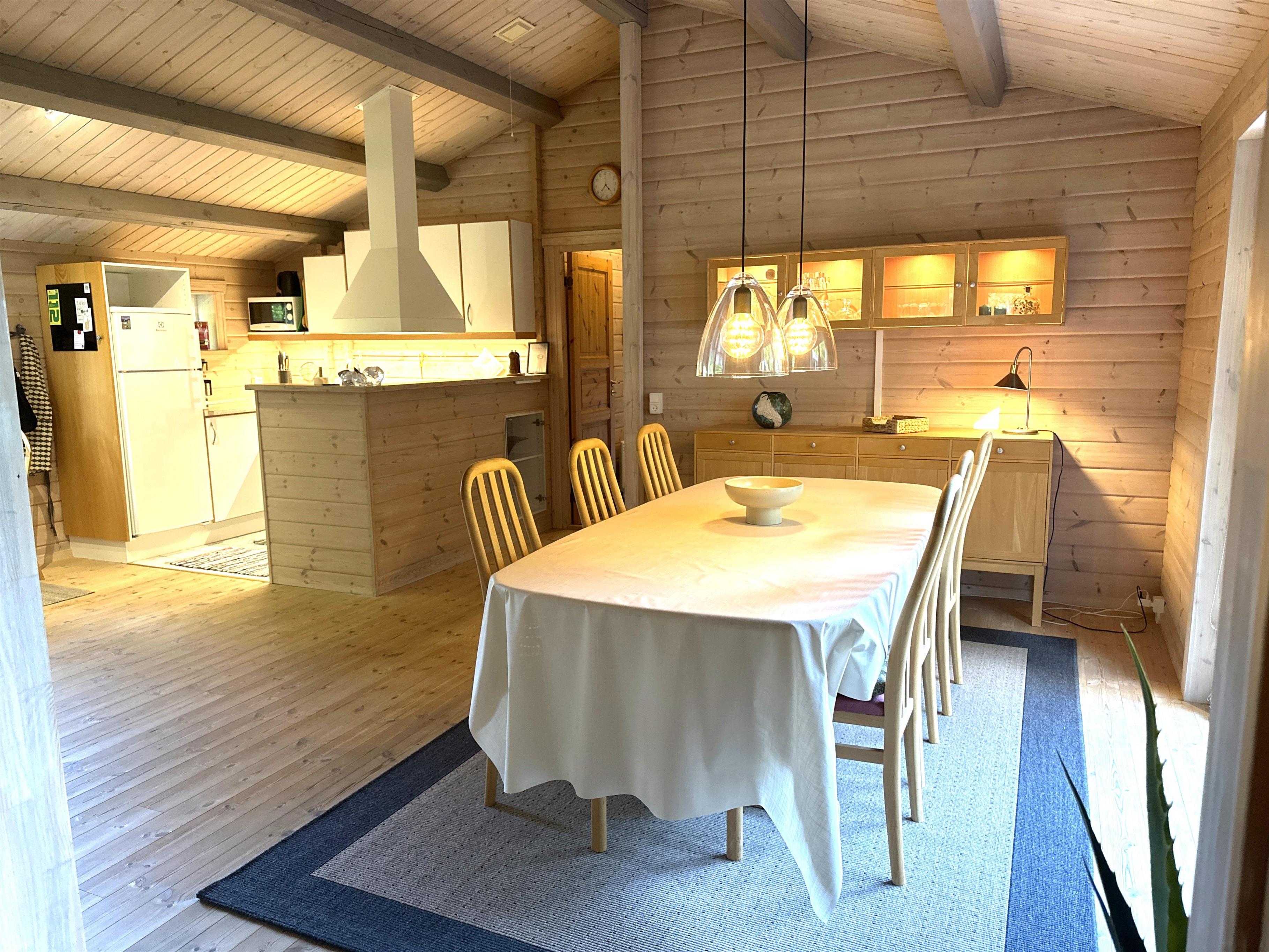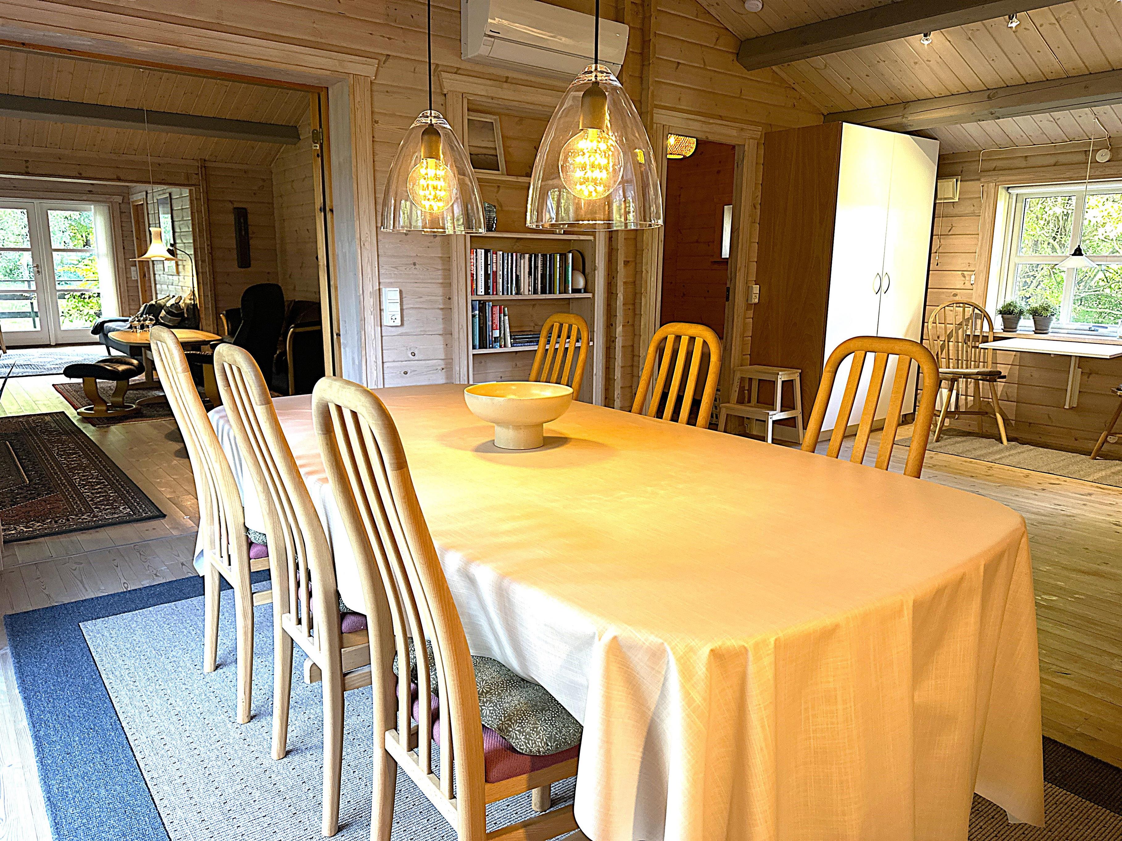 Wenn Sie das Ferienhaus betreten, werden Sie von einer hellen und einladenden Wohnküche mit großem Essbereich empfangen, in der sich die Familie zu gemütlichen Mahlzeiten versammeln kann. Die Küche ist komplett mit allem ausgestattet, was Sie zum Kochen benötigen – darunter Geschirrspüler, Backofen, Herd, Kaffeemaschine und reichlich Geschirr. Der Wohnbereich ist offen mit einem großen, gut ausgestatteten Wohnzimmer mit weichen Sofas, einem Holzofen und einem Flachbildfernseher verbunden. Die vielen Fenster und Terrassentüren lassen viel natürliches Licht herein und vermitteln das Gefühl, nah am Garten zu sein – auch wenn Sie sich im Haus aufhalten.