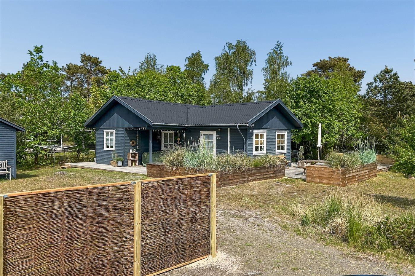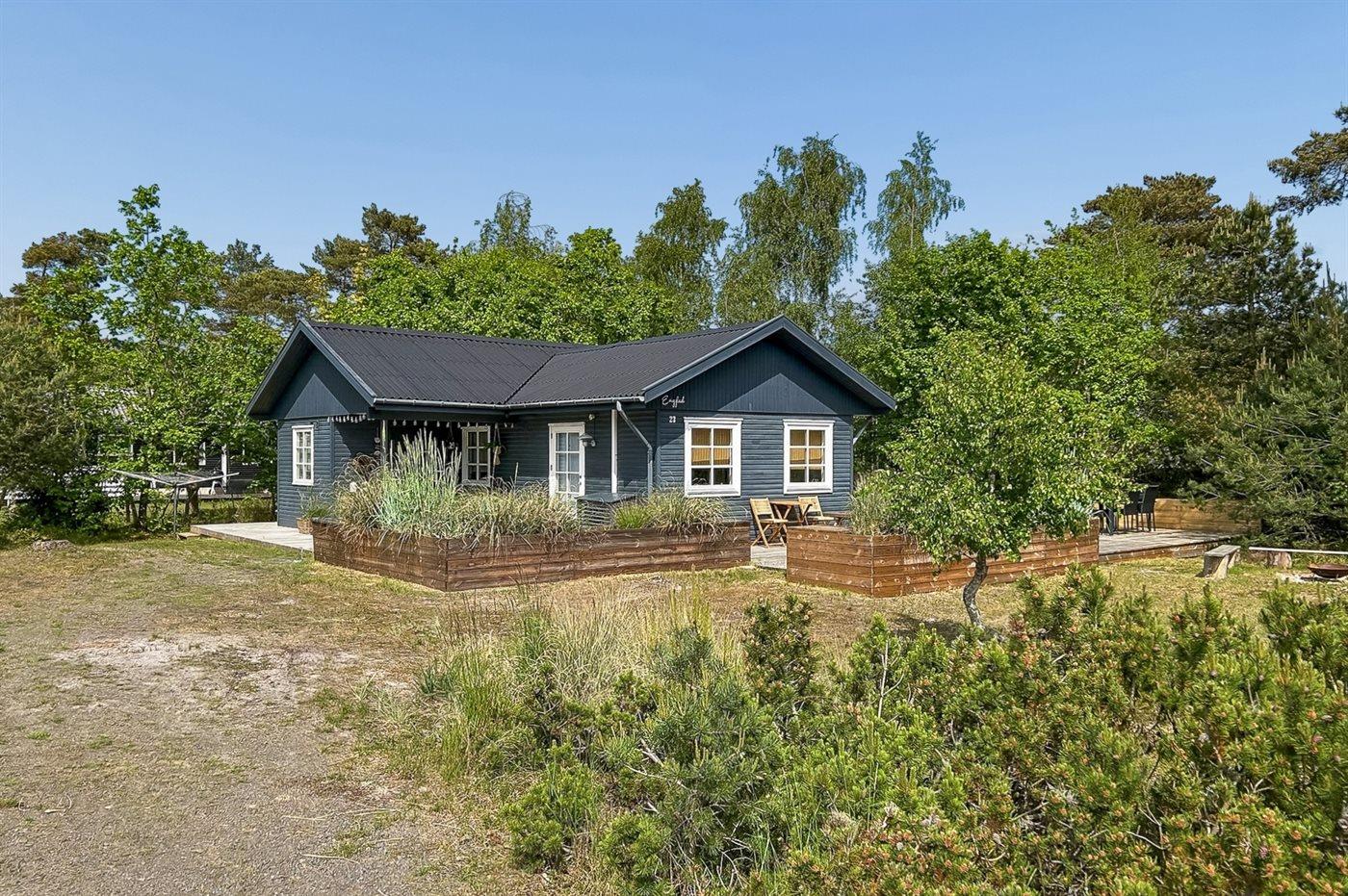 Ein schönes und gepflegtes Ferienhaus aus Holz auf einem Naturgrundstück mit Sand, Heidekraut und Kiefern sowie Lagerfeuerstelle gelegen. Große und teils überdachte Terrasse mit diversen Gartenmöbeln, Kugelgrill und Gasgrill.