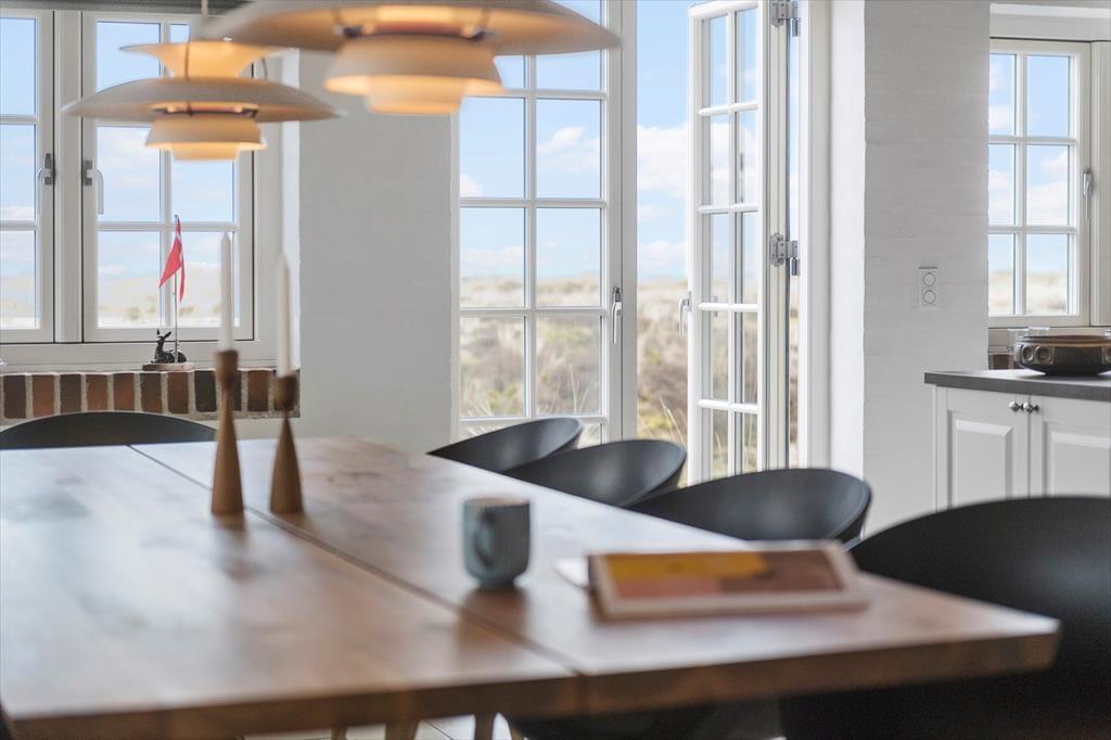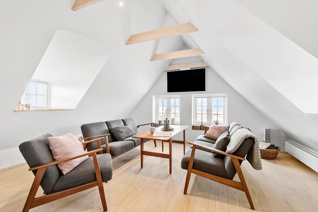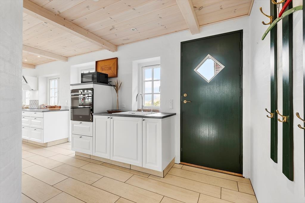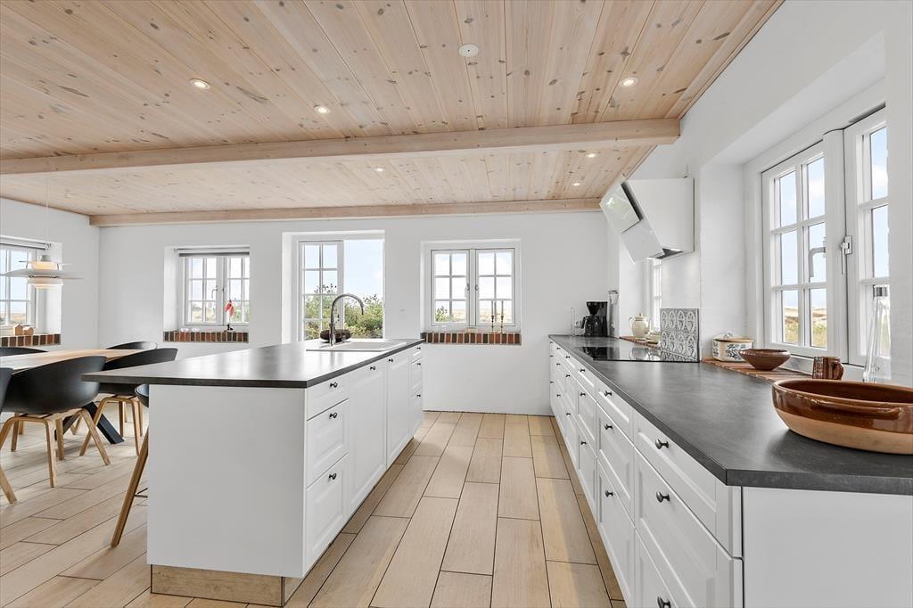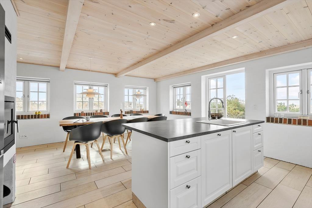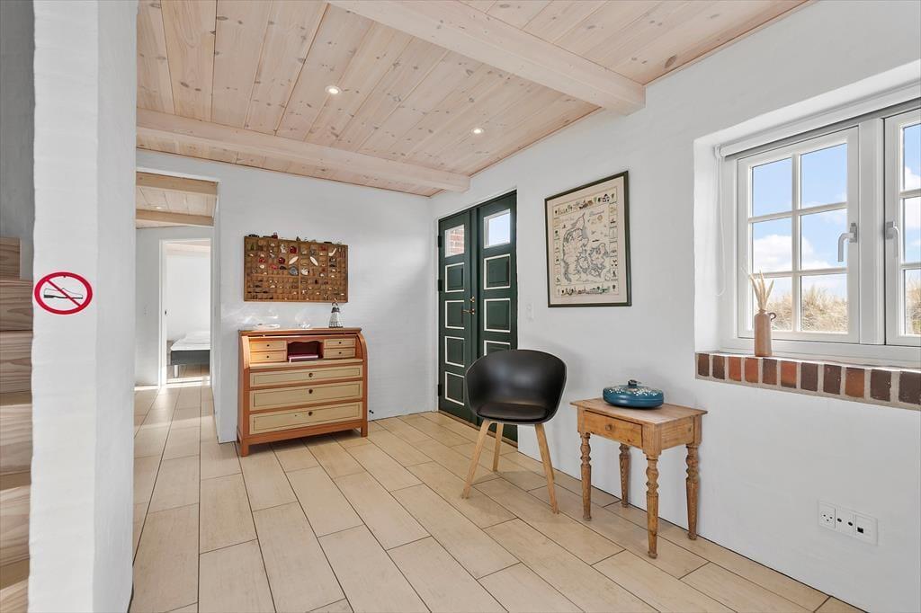 Die grüne Eingangstür, das Strohdach und die Sprossenfenster, leiten den Gedanken auf ein klassisches ”Fanøhaus” hin, es wurde jedoch erst 2021 gebaut. Mit der modernen Einrichtung und den schönen Details bietet es einen fantastischen Ausgangspunkt für einen erholsamen und genüsslichen Urlaub. Das eine Badezimmer hat eine Badewanne und eine Infrarotsauna, wenn Du ganz abschalten und die Wärme bis in die Zehenspitzen spüren möchtest. Die Küche wird von drei Himmelsrichtungen aus mit Sonne durchflutet und die freie Aussicht auf die Natur lässt sich sowohl von der Kücheninsel als auch bei einem Glas Wein auf dem Barhocker bei der Küche genießen. Es ist berauschend im Wohnzimmer im 1. Stock zu stehen, und auf die unendliche Weite des Meeres zu blicken. Im Wohnzimmer gibt es mehrere kuschelige Ecken, wo Du entspannt ein Buch lesen oder zum Hörbuch einen Mittagsschlaf machen kannst.