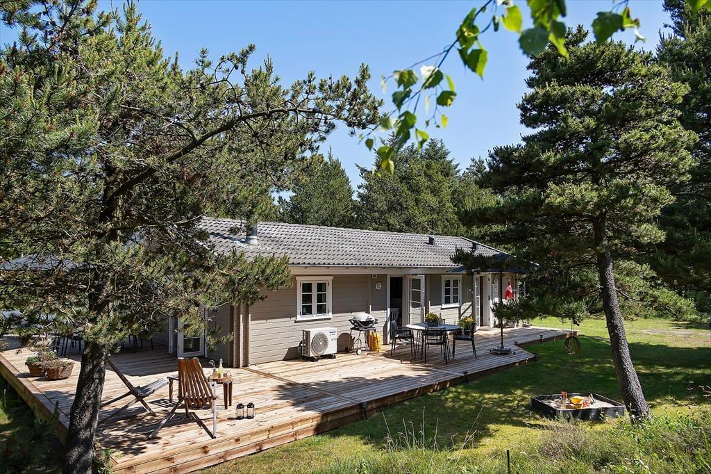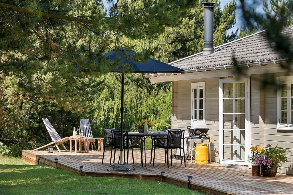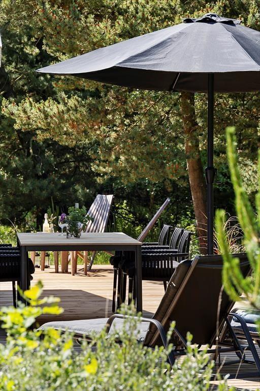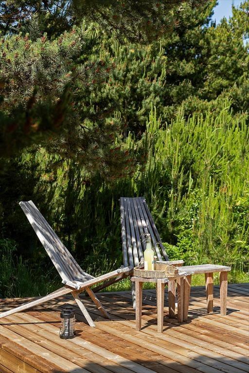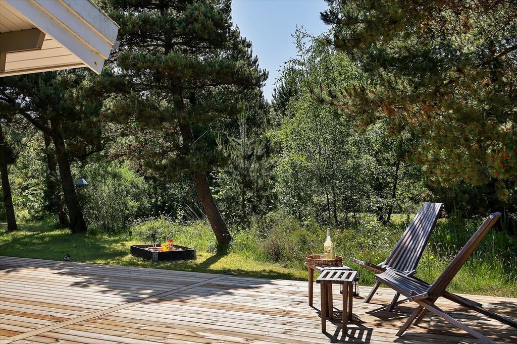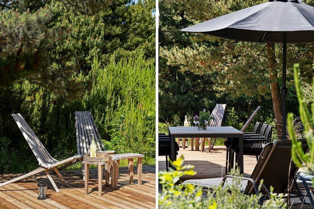 Das Naturgrundstück misst außerdem 2.800 m², sodass genügend Platz zum Spielen auf der Rasenfläche und zum Entspannen auf der großen Holzterrasse vorhanden ist, die sich um zwei Seiten des Ferienhauses schmiegt. Das Leben im Freien kann hier ungestört stattfinden, dank der Kiefern, die auch etwas Schutz bieten, falls es windig sein sollte. Auch das Auto hat gute Bedingungen, denn es kann im Carport geparkt werden.