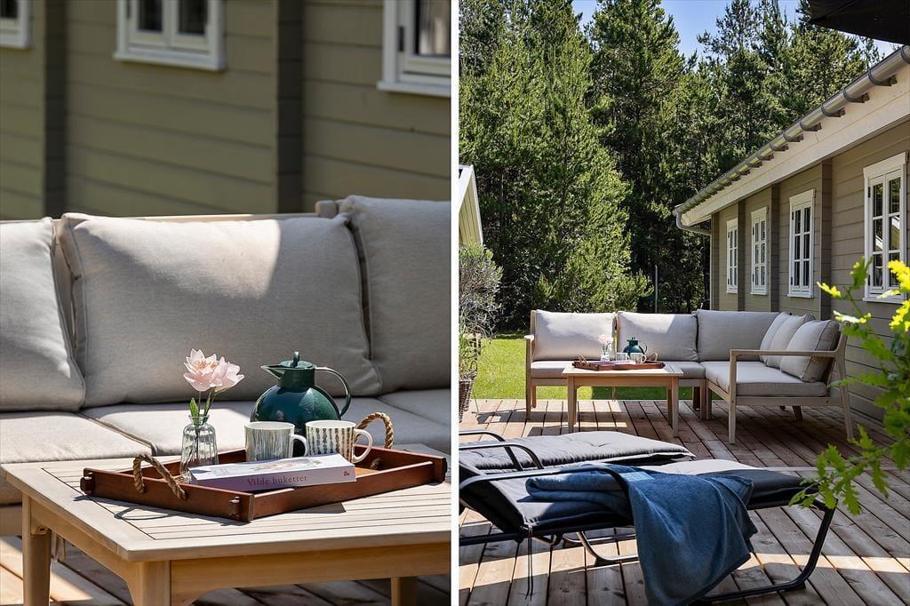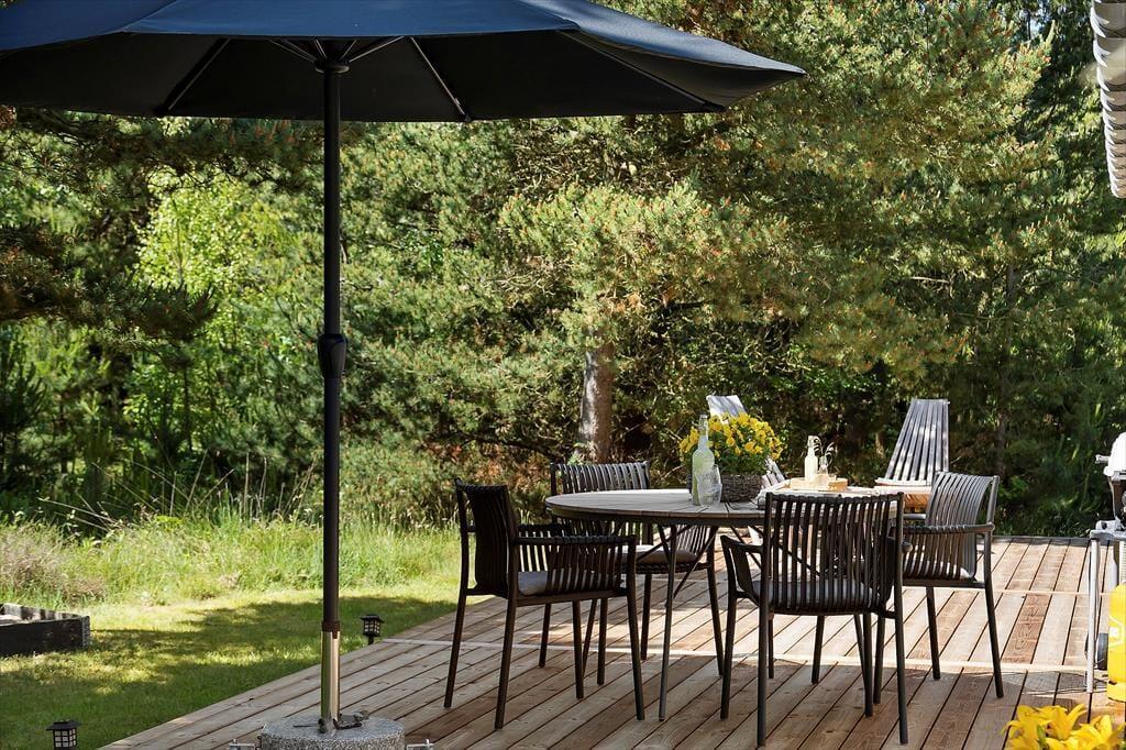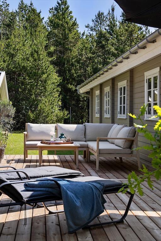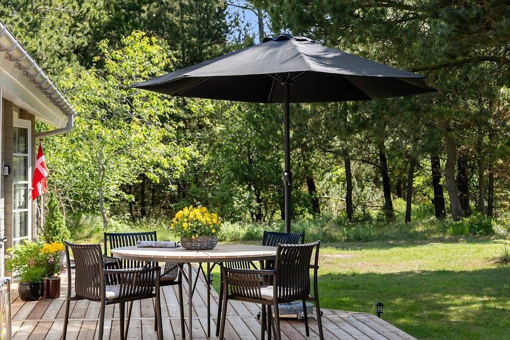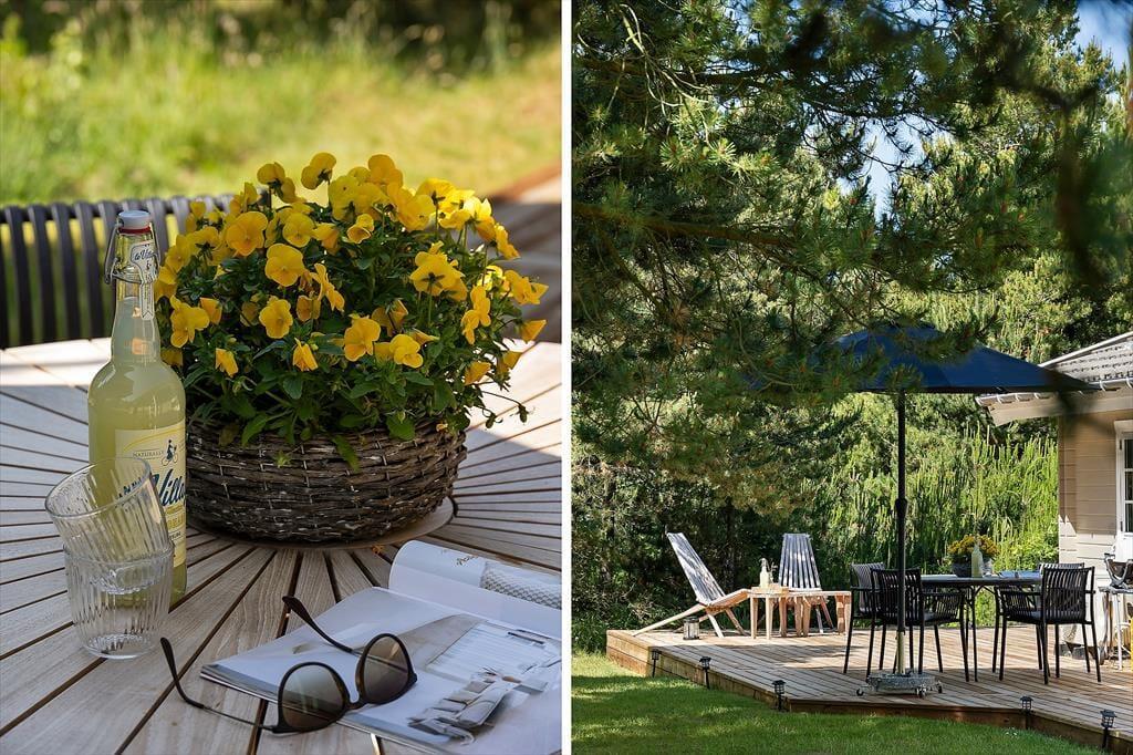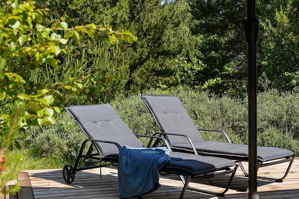 Das Naturgrundstück misst außerdem 2.800 m², sodass genügend Platz zum Spielen auf der Rasenfläche und zum Entspannen auf der großen Holzterrasse vorhanden ist, die sich um zwei Seiten des Ferienhauses schmiegt. Das Leben im Freien kann hier ungestört stattfinden, dank der Kiefern, die auch etwas Schutz bieten, falls es windig sein sollte. Auch das Auto hat gute Bedingungen, denn es kann im Carport geparkt werden.