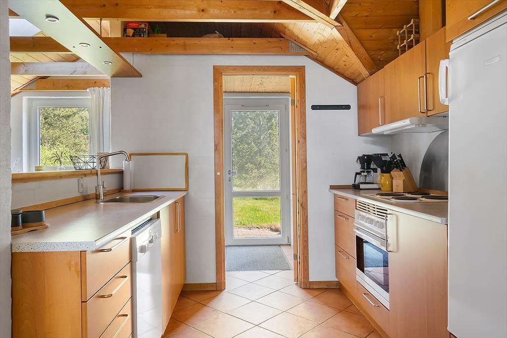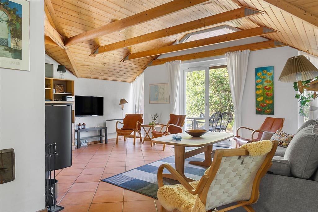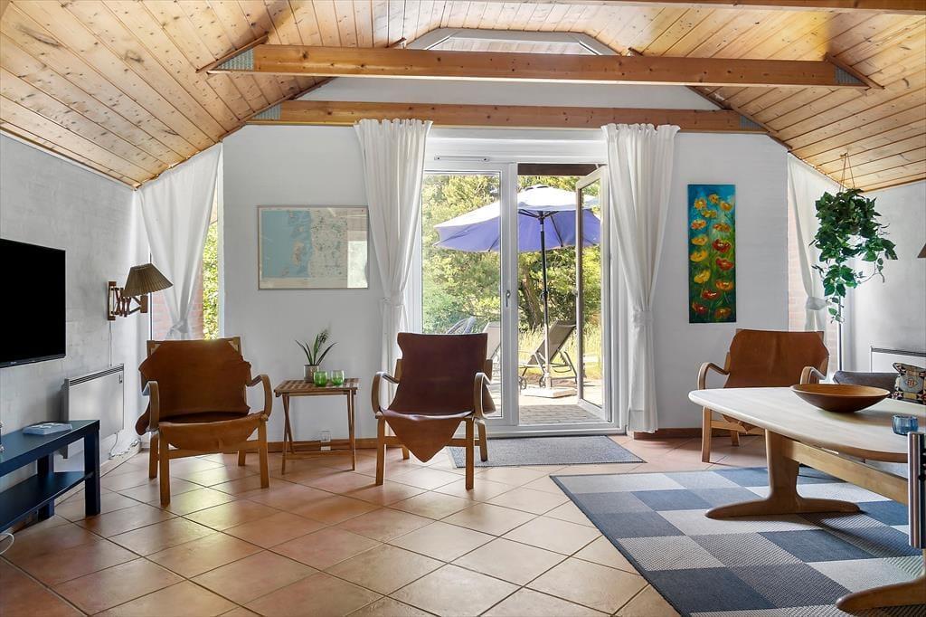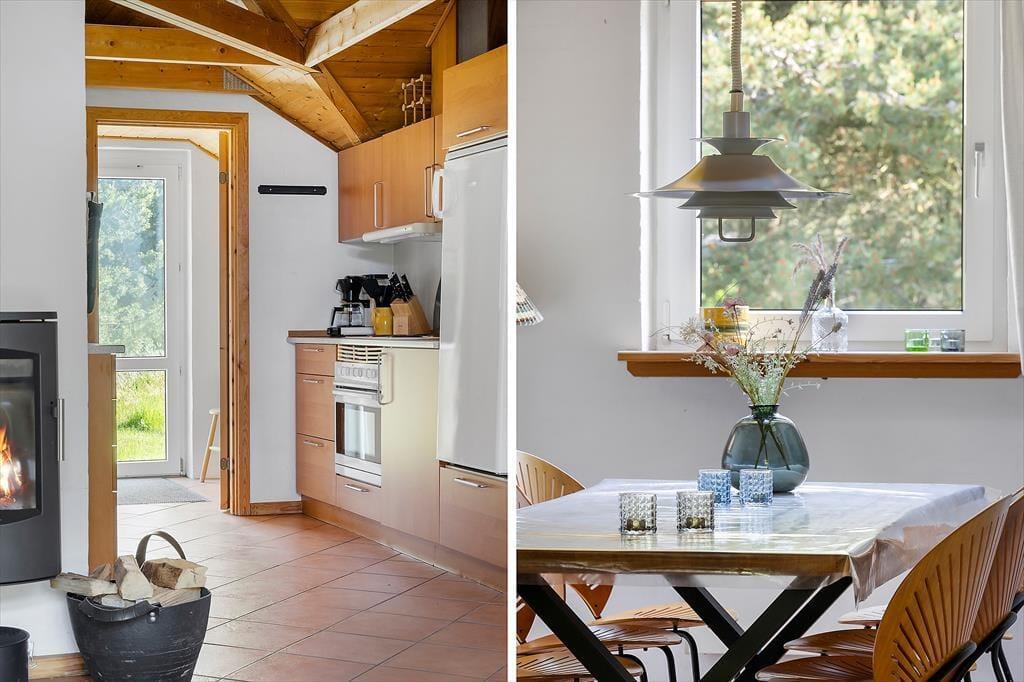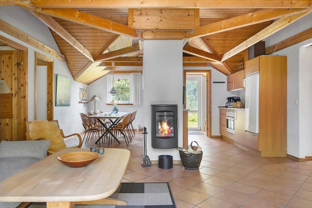 Es ist allerdings nicht nur die Umgebung, die Sie beeindrucken wird. Auch das Steinhaus selber wird Sie mit seinem ausgesprochen reizenden Erscheinungsbild und Einrichtungsstil schnell in den Bann ziehen. Freuen Sie sich im Wohnraum beispielsweise auf hohe Decken, eine ansprechende offene Balkenkonstruktion, schöne Fliesenböden und einen mittig platzierten Kaminofen, der an kühlen Abenden für behagliche Wärme und ein Maximum an echter dänischer Ferienhausgemütlichkeit sorgt. Die Möblierung fügt sich harmonisch in den Aufenthaltsbereich ein, der neben dem Wohnraum auch die offen integrierte und gut ausgestattete Küche beinhaltet, in der das Zubereiten der Mahlzeiten zum Vergnügen wird. Pure Erholung und Entspannung verspricht die vom Badezimmer aus zugängliche Sauna. Nach Ihrem Saunagang bieten sich die drei vorhandenen Schlafräume wunderbar für ein erholsames Nickerchen an.