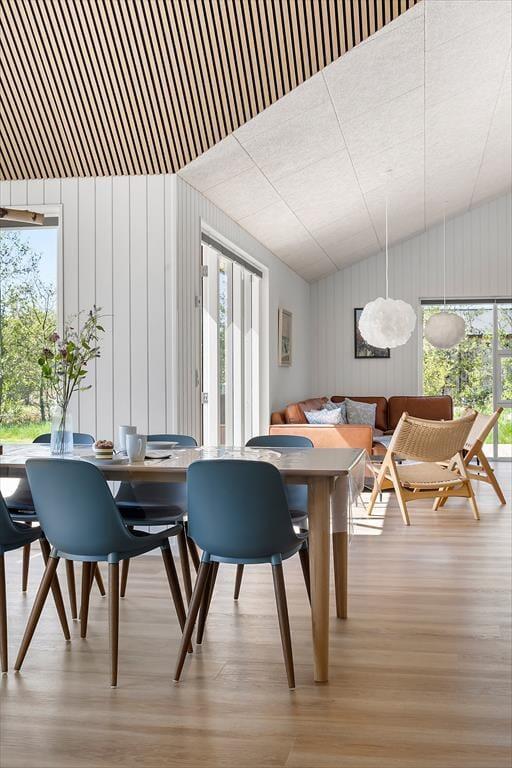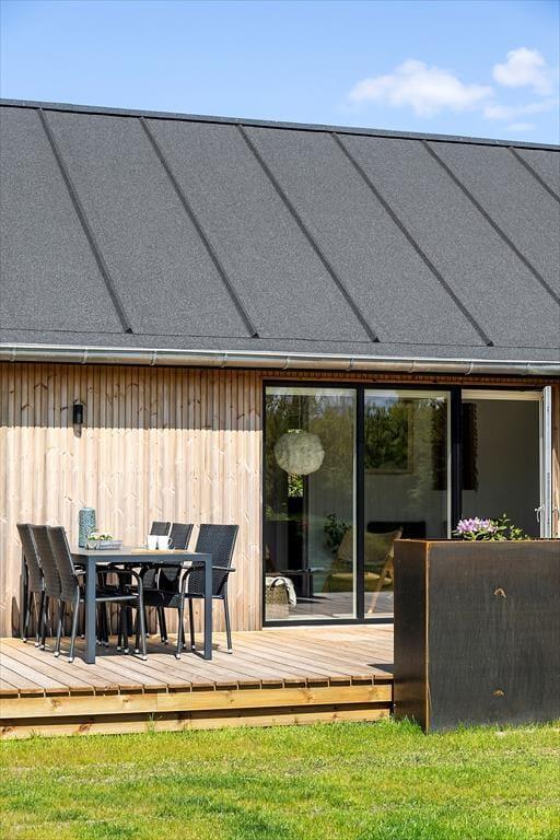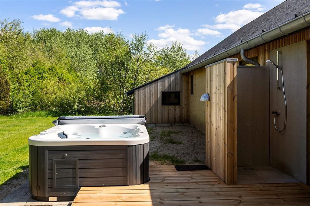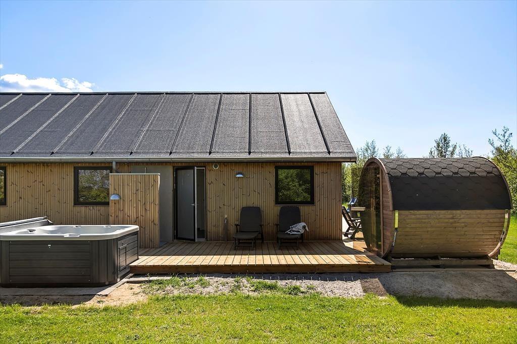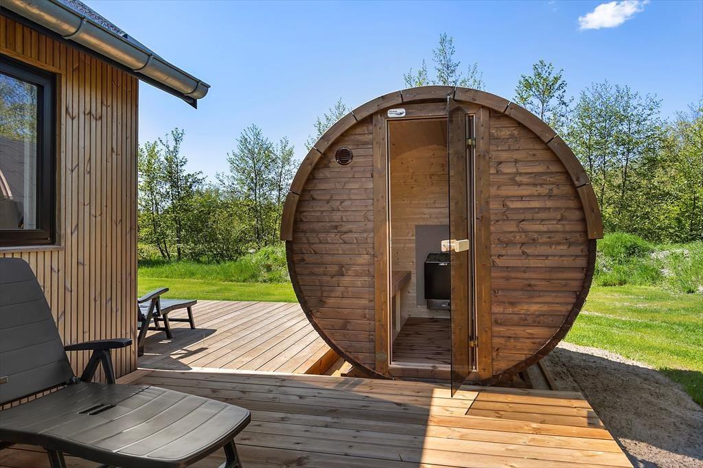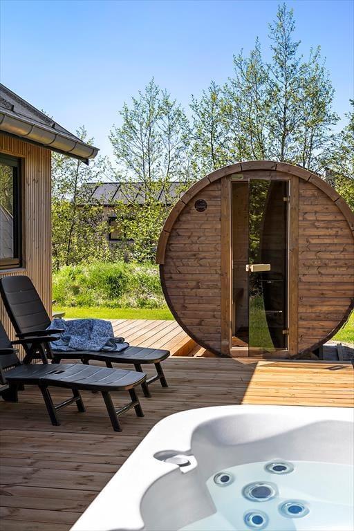 Die herrliche Terrasse des Ferienhauses schmiegt sich elegant um das Gebäude und bietet viele gemütliche Ecken – mal sonnig, mal windgeschützt. Hier kannst du den Tag mit einem Kaffee unter freiem Himmel beginnen, abends beim Sonnenuntergang eine Mahlzeit genießen oder dich nach einem Ausflug in dem warmen Außenwhirlpool entspannen. Die runde Saunatonne und die Außendusche vervollständigen das Wellnesserlebnis – und schöner kann man den Tag kaum ausklingen lassen, als im warmen Wasser unter dem Sternenhimmel. Die große Rasenfläche lädt zu Spiel und Spaß ein, und für Kinder gibt es sowohl eine Schaukel als auch eine Rutsche – perfekte Bedingungen für erlebnisreiche Stunden im Freien.