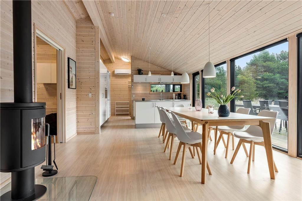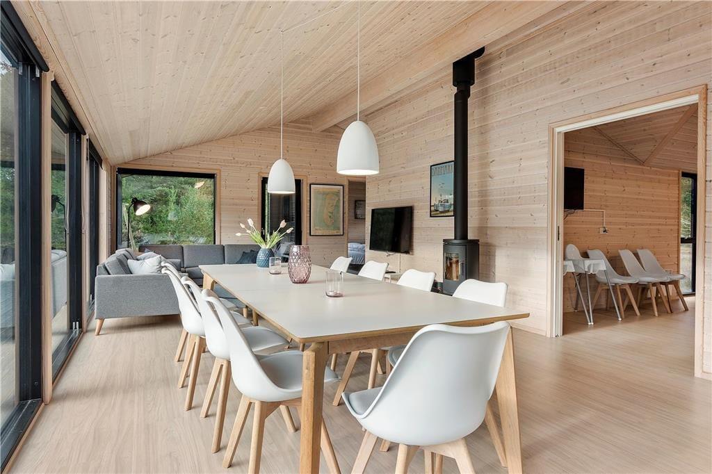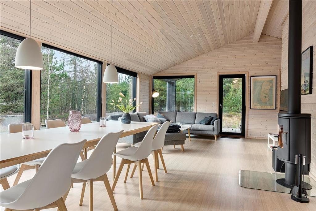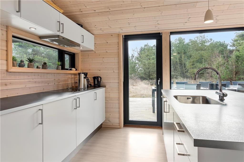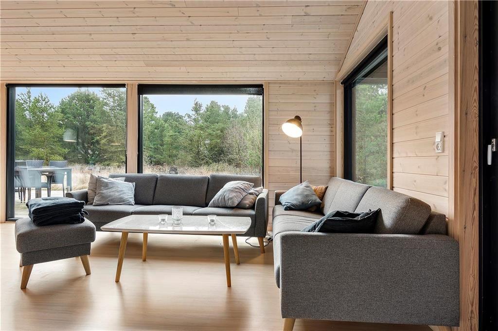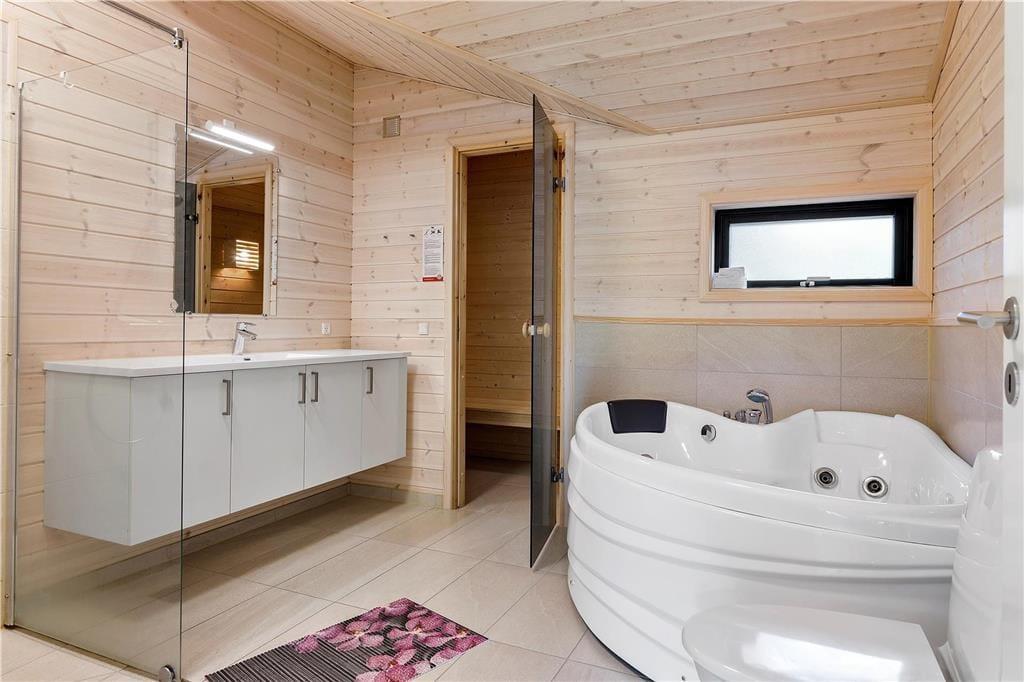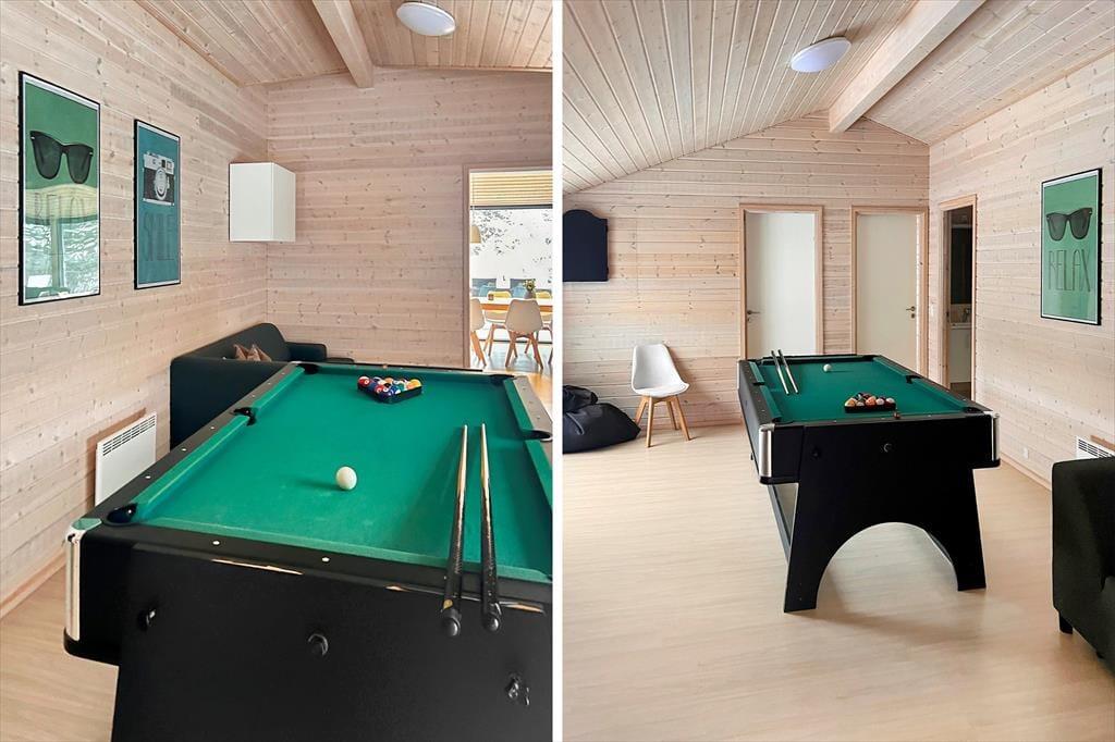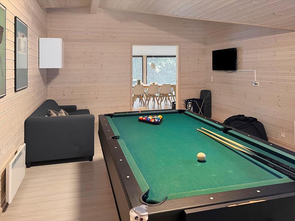 Komfort und Qualität sind die Schlüsselwörter zu diesem prachtvollen, in 2018 errichteten Ferienhaus, das dir mit seiner Wohnfläche von 150 m² viel Bewegungsfreiheit bietet. Freu dich auf eine stilvolle Einrichtung und eine wunderbar einladende Wohnatmosphäre. Aufgrund der großen Fensterpartien genießt du das herrliche Gefühl, selbst im Innenbereich des Hauses mitten in der Natur zu wohnen. Die ansprechende Aussicht eröffnet sich dir unter anderem im Wohnraum, in dem du es dir in der Sofaabteilung nahe des Kaminofens gemütlich machen kannst oder gesellige Runden mit einem guten Essen und netten Gesprächen am langen Esstisch verleben kannst. Der Wohnraum bildet eine harmonische, offene Kombination mit der tollen Küche, in der du gemeinsam die Mahlzeiten zubereiten kannst und dabei jedoch stets im Familienleben im Wohnraum integriert bleibst. Vollständige Entspannung und Erholung versprechen der Whirlpool und die Sauna, die in einem der beiden Badezimmer platziert sind. Für viel Spaß und Abwechslung sorgt hingegen der Aktivitätsraum, in dem du bereits von einer Dartscheibe und einem Billardtisch erwartet wirst. Allabendlich legst du dich in den komfortablen Doppelbetten der insgesamt fünf vorhandenen Schlafräume schlafen und stehst so am Morgen wunderbar erholt und gut gelaunt auf.