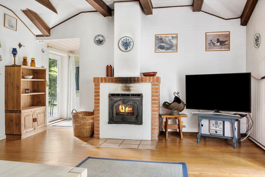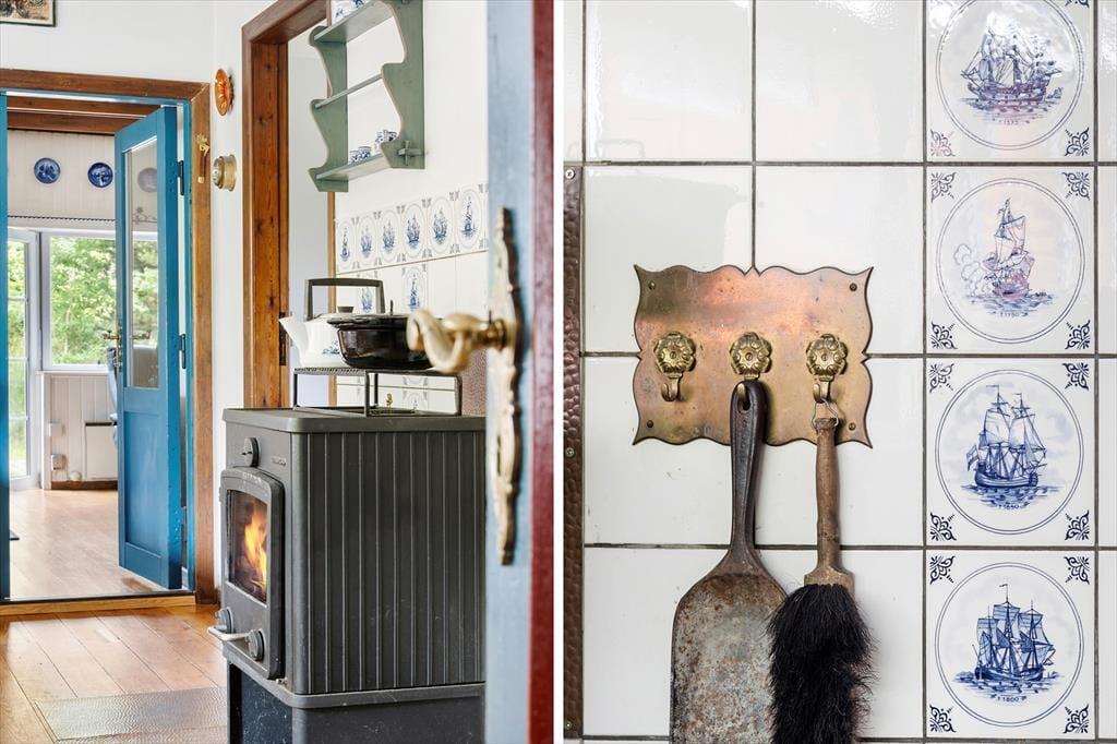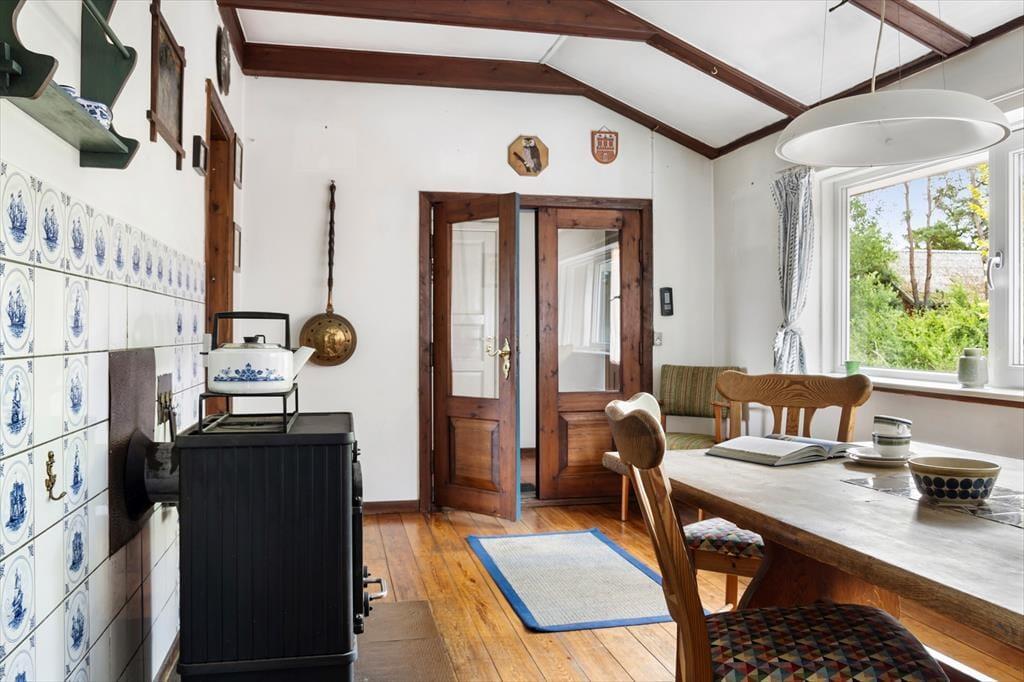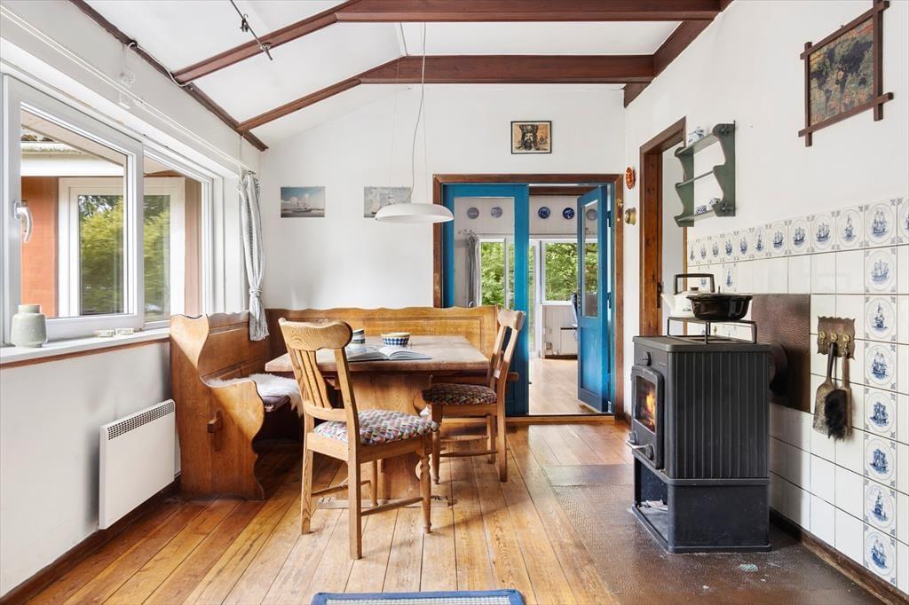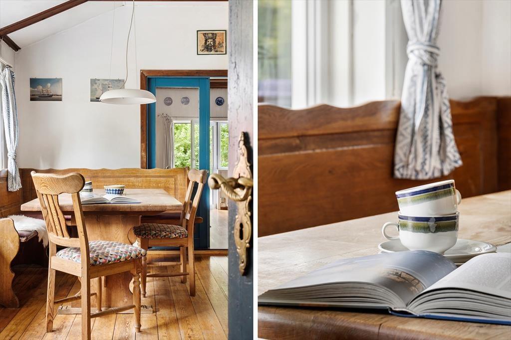 Im Inneren spürst du sofort den einfachen Charme und die warme Atmosphäre. Das solide, rote Backsteinhaus wirkt luftig und einladend mit großen Fenstern, die viel natürliches Licht hereinlassen. Die Wand hinter dem Kamin ist sorgfältig mit alten Fliesen verkleidet, und ein paar rustikale, alte Dielenboden sorgen für einen schönen Kontrast und eine gemütliche, ländliche Stimmung. Der offene Wohnbereich lädt zum Entspannen ein, wo du vor dem eingebauten Kamin sitzen, eine Tasse heißen Tee trinken und ein gutes Buch lesen kannst. Die stilvolle, schlichte Küche bietet die perfekte Umgebung zum Kochen, während die feinen, handgefertigten Details aus Holz und Keramik dem Zuhause eine persönliche Note verleihen. Das Haus bietet bequem Platz für sechs Personen und es