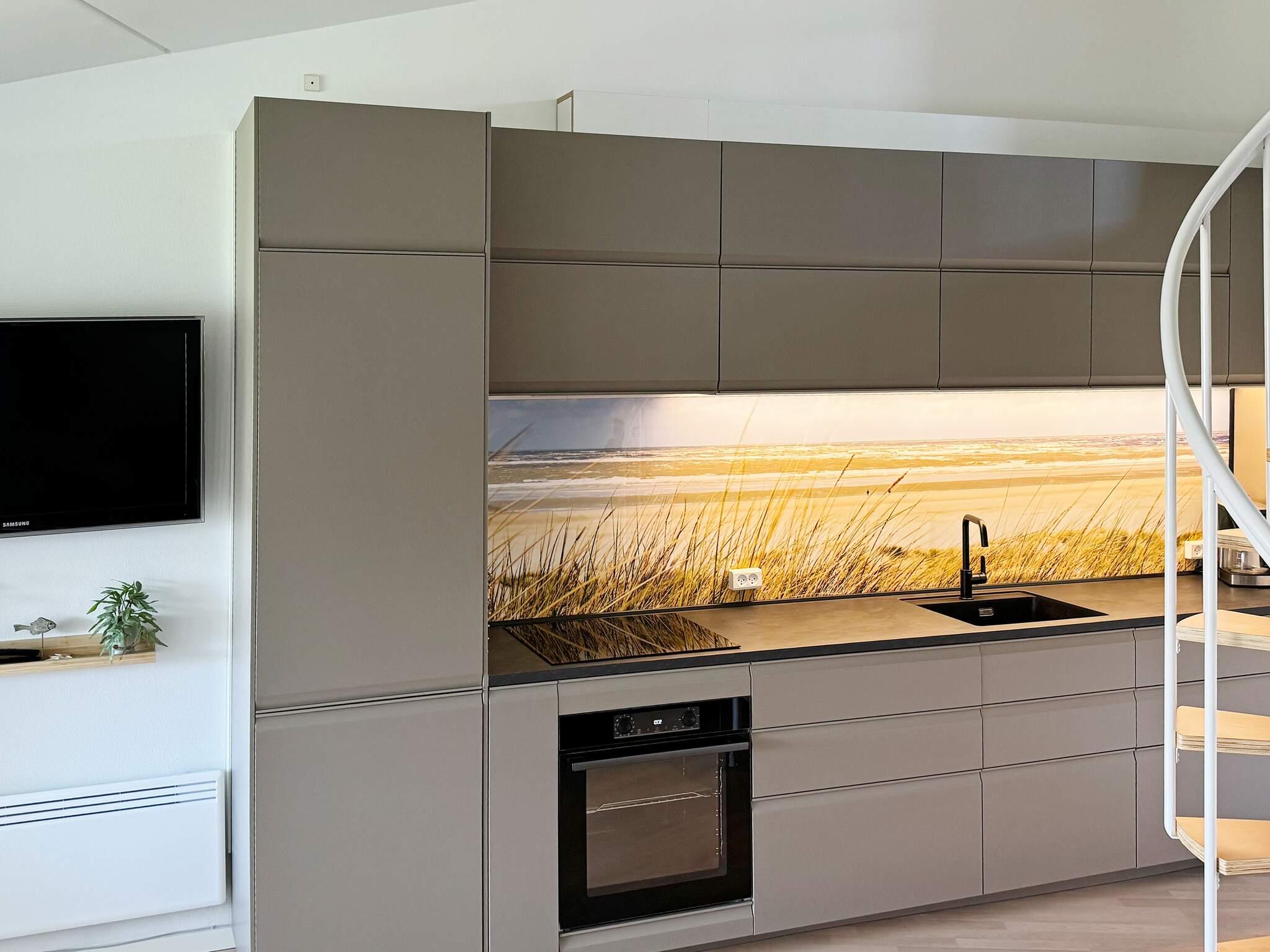 Von der privaten Terrasse aus haben Sie einen Blick auf die lebhafte Umgebung mit einem Café und einem großen Schachbrett im Freien, die den Urlaubscharme unterstreichen. Die Terrasse selbst ist ein angenehmer Ort für den Morgenkaffee, gemütliche Mahlzeiten oder einfach zum Genießen der frischen Küstenluft.