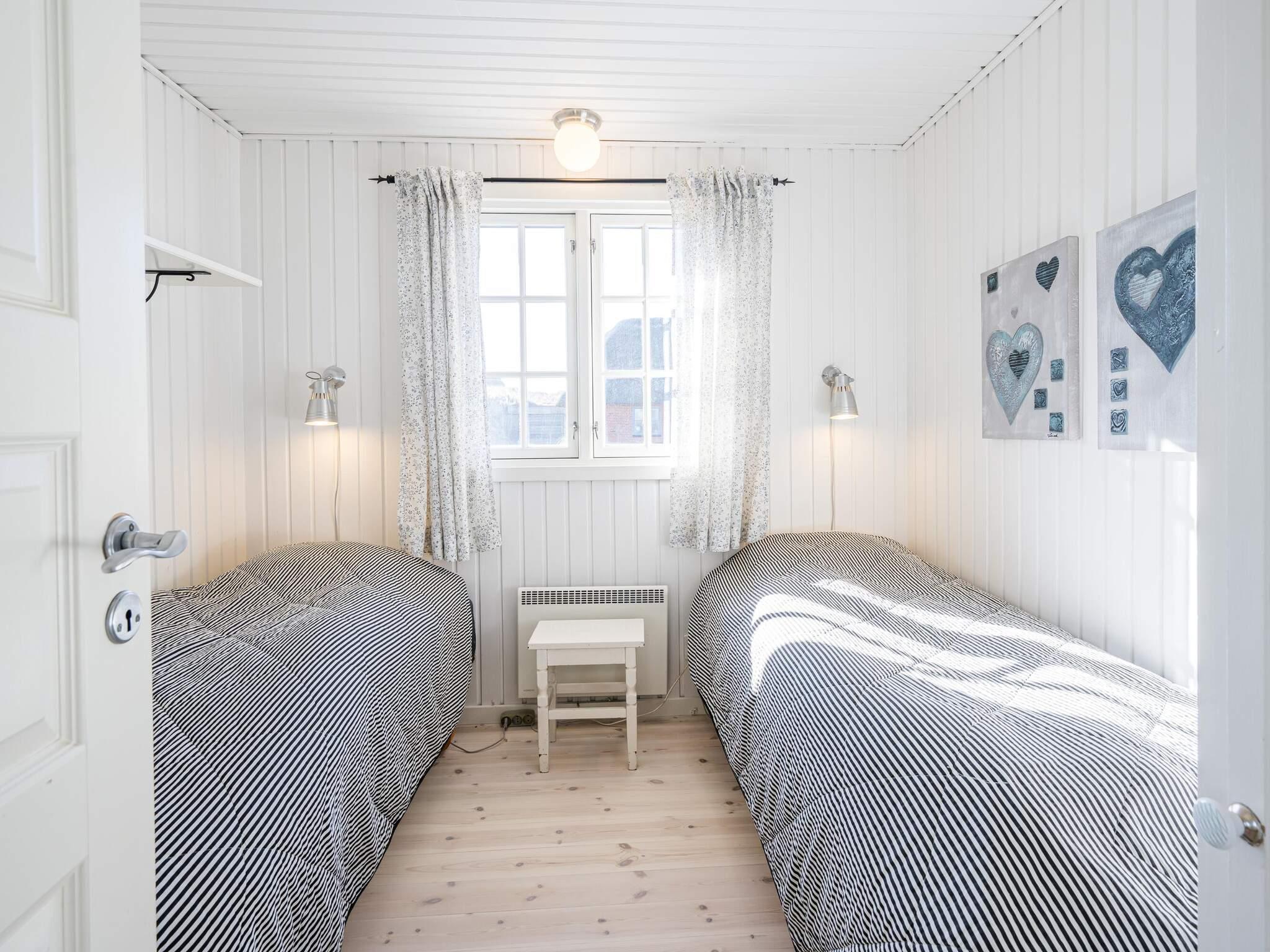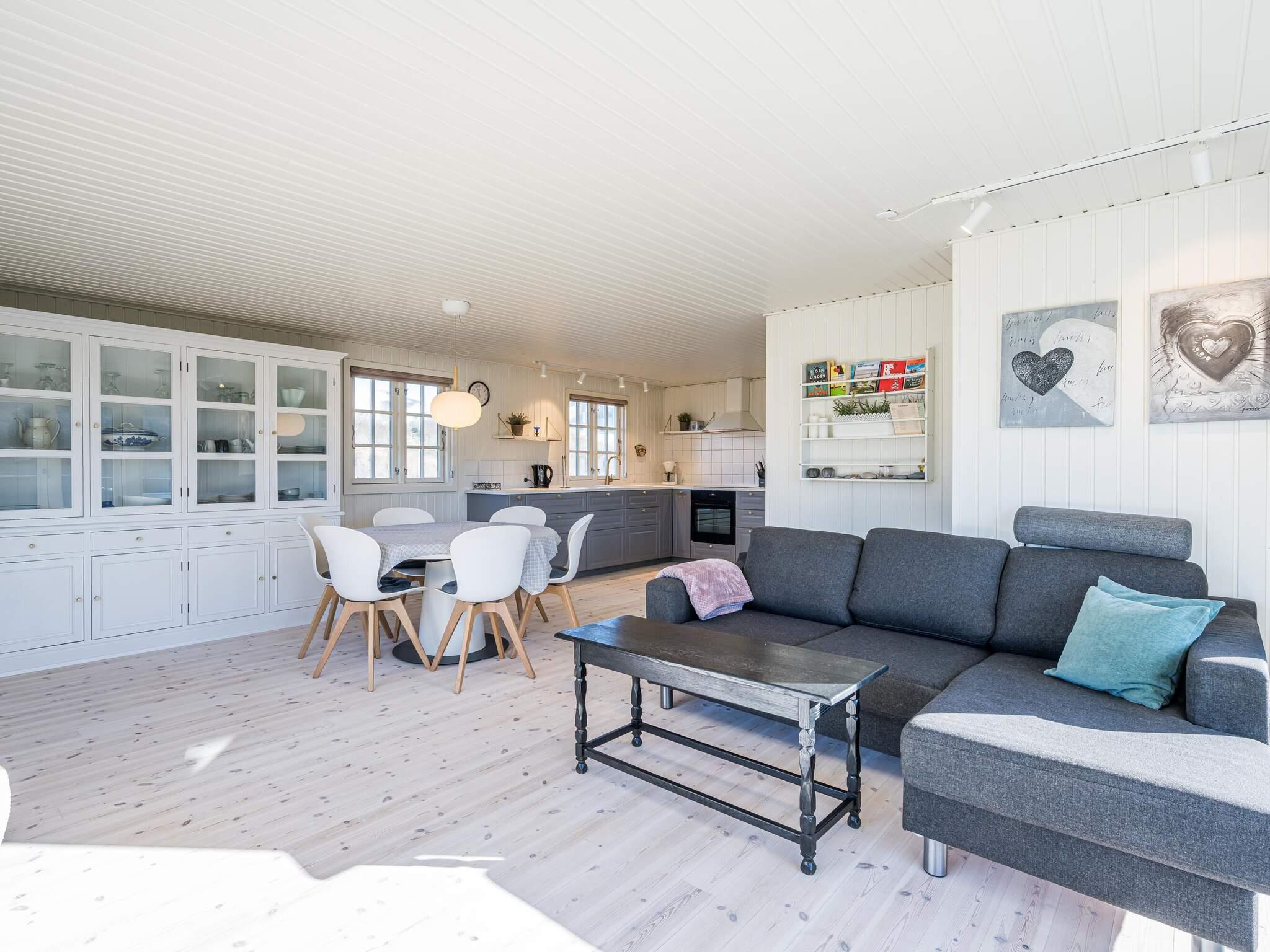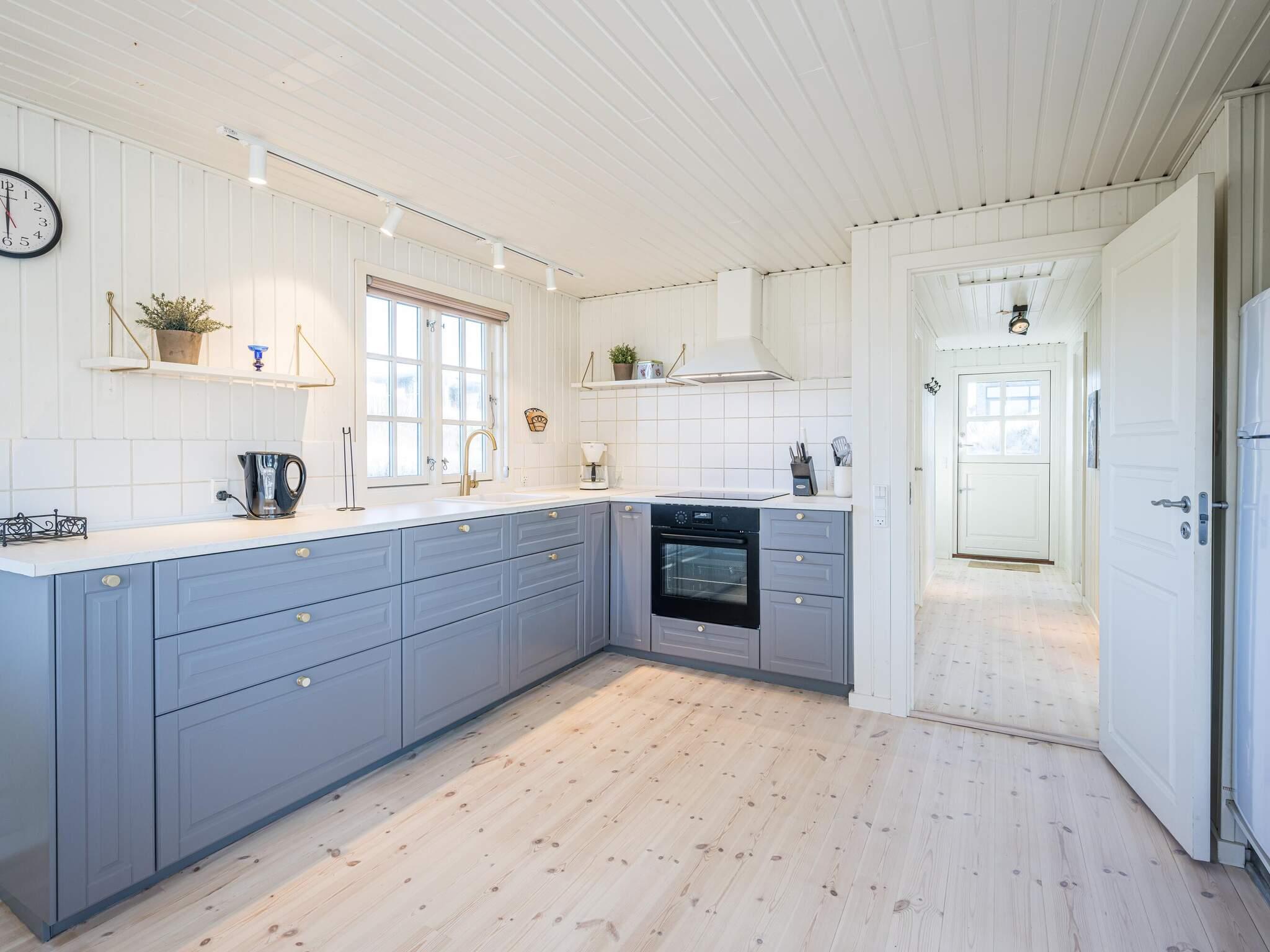 Im Inneren besticht das Haus durch eine helle und freundliche Atmosphäre mit durchgehenden hellen Holzböden und weißen Holzverkleidungen, die eine klassische und einladende Ferienhausstimmung schaffen. Die Küche ist offen zum Wohnbereich hin gestaltet, in dem der originale gemauerte Kamin für Wärme und Gemütlichkeit sorgt – perfekt für gemütliche Abende nach einem langen Tag in der Natur.