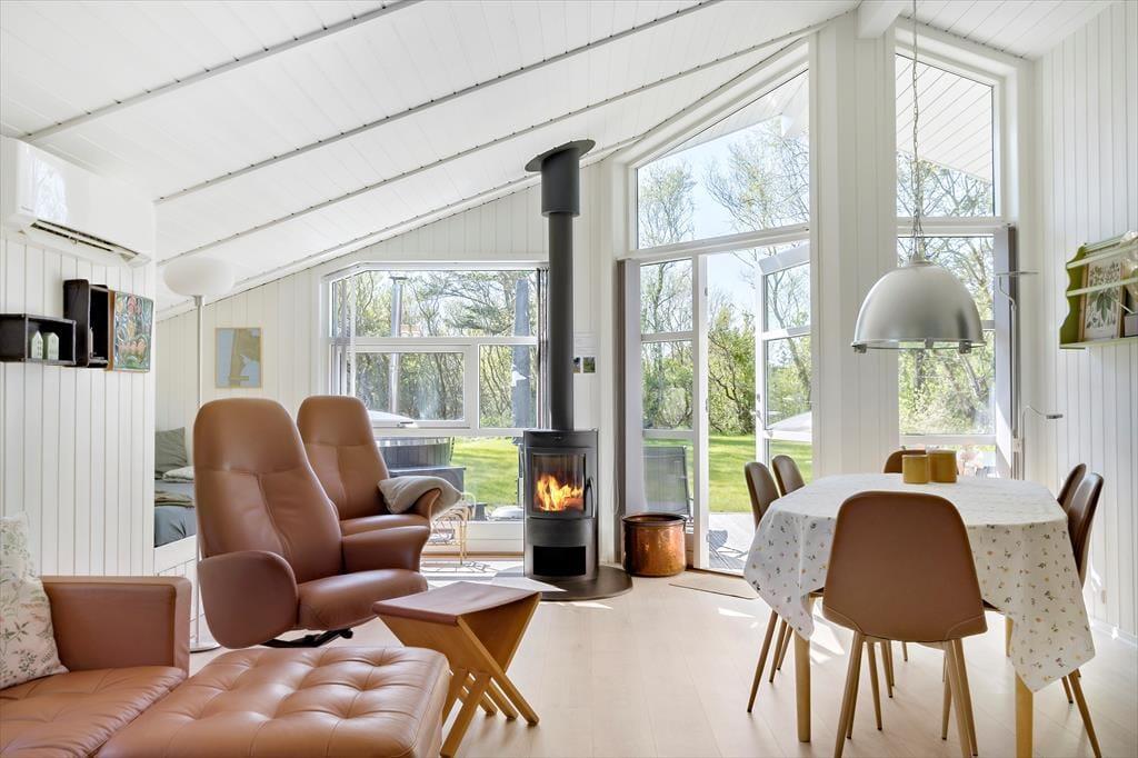 Im Inneren haben Sie reichlich Gelegenheit, das Faulenzerleben in der hellen und einladenden Umgebung des Sommerhauses zu genießen. An den Tagen, an denen Sie vor allem entspannen und neue Energie tanken möchten, können Sie sich im Whirlpool des Badezimmers zurücklehnen. Schön ist es auch, im Wohnzimmer zusammen zu sein, wo man den Holzofen anzünden kann, bevor man sich an den Esstisch oder auf das Sofa setzt und gute Bücher liest oder einen Film auf dem Flachbildschirm anschaut. Auch ein Mittagsschläfchen im Alkoven kommt durchaus in Frage, und nachts können Sie sich auf einen gemütlichen Schlaf in den drei Schlafzimmern des Hauses freuen.