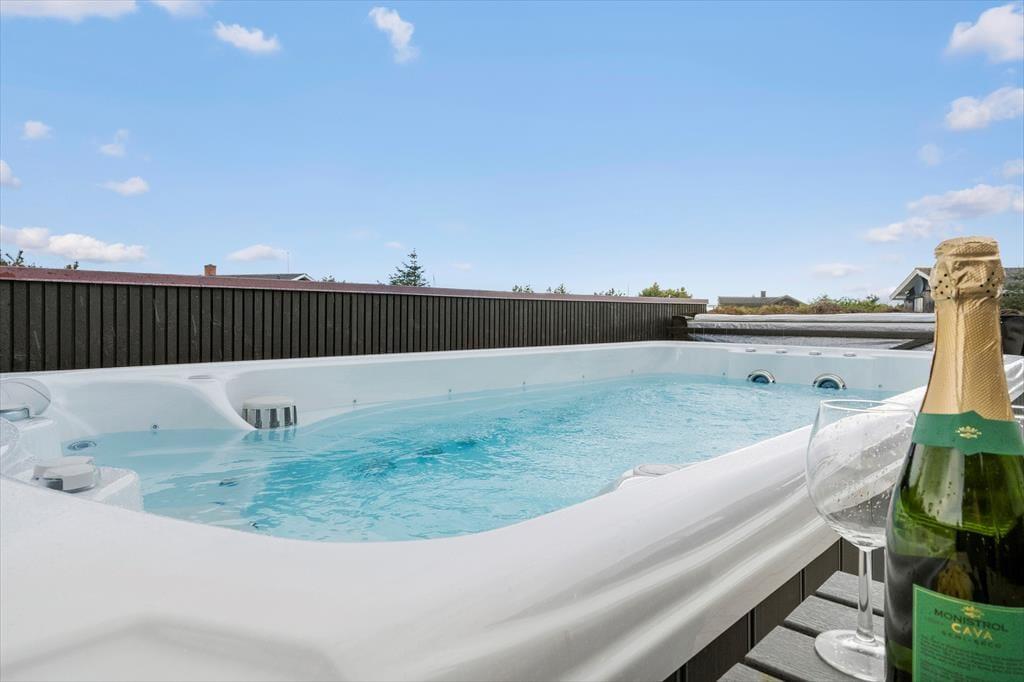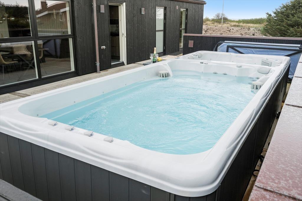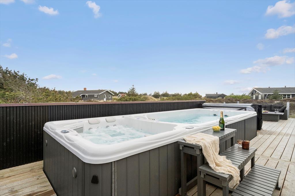 Vom Wohnzimmer aus haben Sie direkten Zugang zu einer großen Terrassenumgebung, die im Westen einen überdachten Bereich und im Süden einen offenen Bereich aufweist. Unter freiem Himmel befindet sich der große Whirlpool, in dem Sie bis zu sechs Personen sein können, wenn sie ein wenig Entspannung und Wellness brauchen.