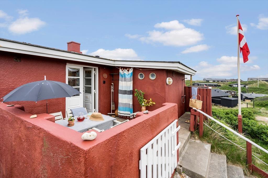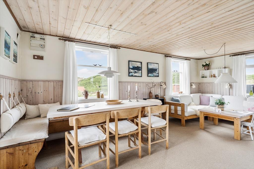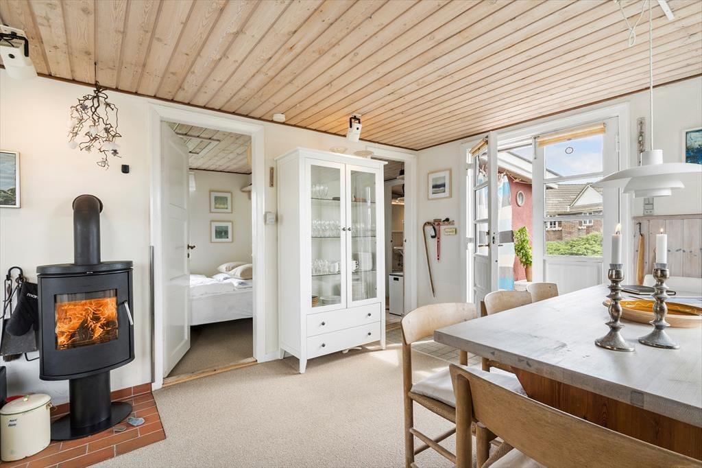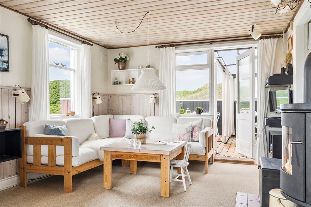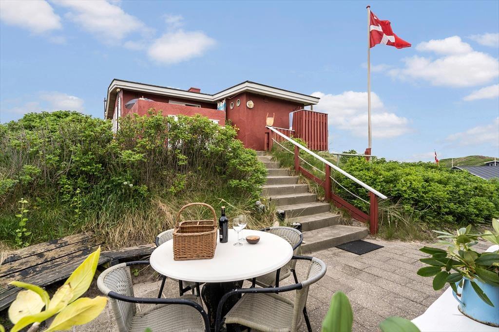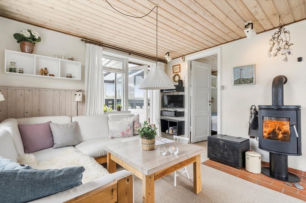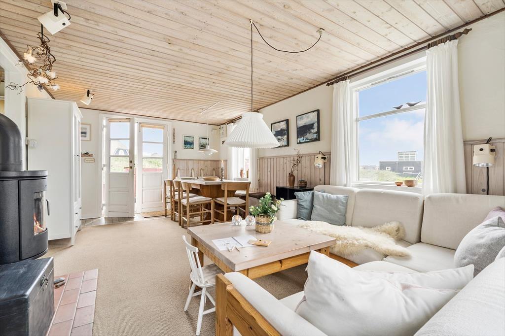 Seit 1949 steht hier auf der hohen Dünenkuppe das Sommerhaus, welches trotz kontinuierlicher Modernisierung glücklicherweise seinen authentischen Charme bewahrt hat – Schauen Sie sich nur das klassische Äußere des Hauses an: die dunkelrote Fassade mit weißen Fensterläden und Herzdekorationen. Mit seinen 49 m² gehört das Sommerhaus zu den Kleineren auf der Objektskala, doch für den Urlaub zu Zweit oder mit kleiner Familie reichts, um auch drinnen eine großartige Zeit zu verbringen. Wer braucht schon viel Platz, wenn man den Tag mit Kartenspielen, Bücherlesen und gemütlicher Runde am Holzofen verbringen möchte? Vom Wohnzimmer aus haben Sie Zugang zu einer kleinen Küche. Ebenfalls befinden sich zwei Schlafzimmer und ein Badezimmer im Haus. Und schließlich ist da noch der Wintergarten, der mit seiner schönen Aussicht und angenehmem Lichteinfall schnell zu einem Ihrer Lieblingsplätze werden kann.