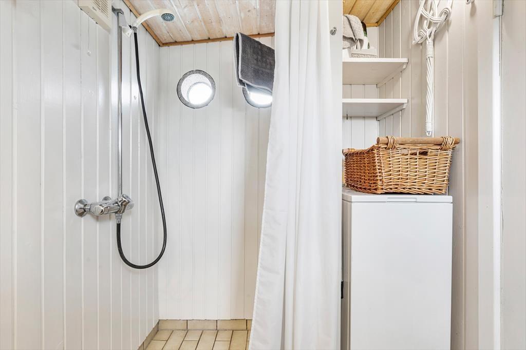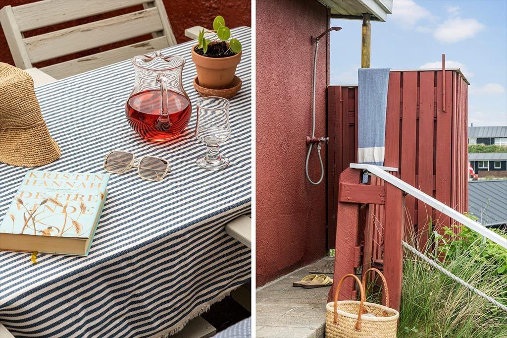 Rundum des Sommerhauses und des Nebengebäudes wurden schöne Terrassen angelegt, sodass Sie je nach Sonne und Wind immer ein geeignetes Sitzeckchen finden. Hecken und Rosensträucher schirmen die Freiluftbereiche, doch sollten Sie ab und zu doch mal die Sonnenbrille absetzen und über die Reling gucken, denn dank der hohen Lage können Sie weit über das schöne Ferienhausgebiet hinausblicken. Selbst unter der Außendusche werden Ihre Sinne von der malerischen Umgebung umspült – Starten Sie den Tag mit einem Brausebad unter freiem Himmel und Sie sind frisch und vorbereitet - auf alle die tollen Erlebnisse, die Ihnen der Ferientag bringen wird.