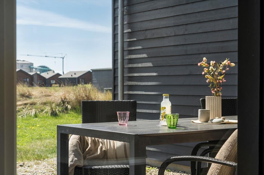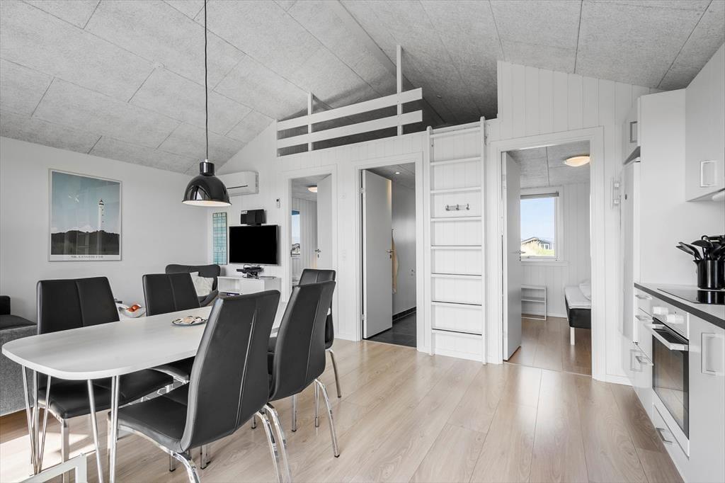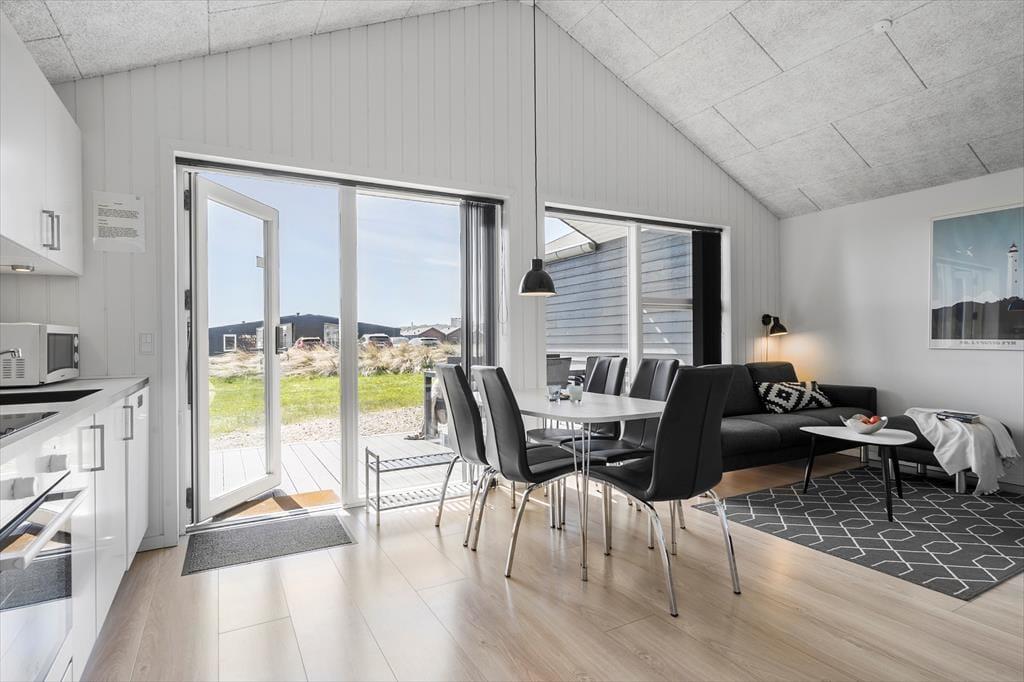 Dieses helles und stilvolles Ferienhaus empfängt dich mit viel Platz für Gemütlichkeit und geselligem Beisammensein. Die offene Raumaufteilung sorgt für Luft und Licht und die großen Fenster ziehen regelrecht das Tageslicht ins Innere herein. Im Wohnzimmer kannst du es dir auf dem verführenden Sofa mit einem Kaffee gemütlich machen, die Aussicht genießen oder dem Wind lauschen, der sanft durch das Dünengras streift. Nach einem langen Tag am Meer ist es wohlverdient, mit Familie und Freunden am Esstisch ein köstliches Abendessen zu genießen und die gut ausgestattete Küche hilft beim Zubereiten. Die Schlafräume sind mit bequemen Betten eingerichtet - du wachst erholt auf mit frischen Energien für einen neuen Urlaubstag. Das Badezimmer verfügt über eine schöne Dusche, unter der du nach einem Strandspaziergang Sand und Salz abspülen und deinen Körper relaxen lassen kannst.