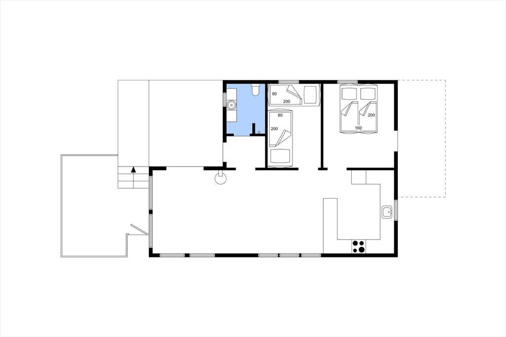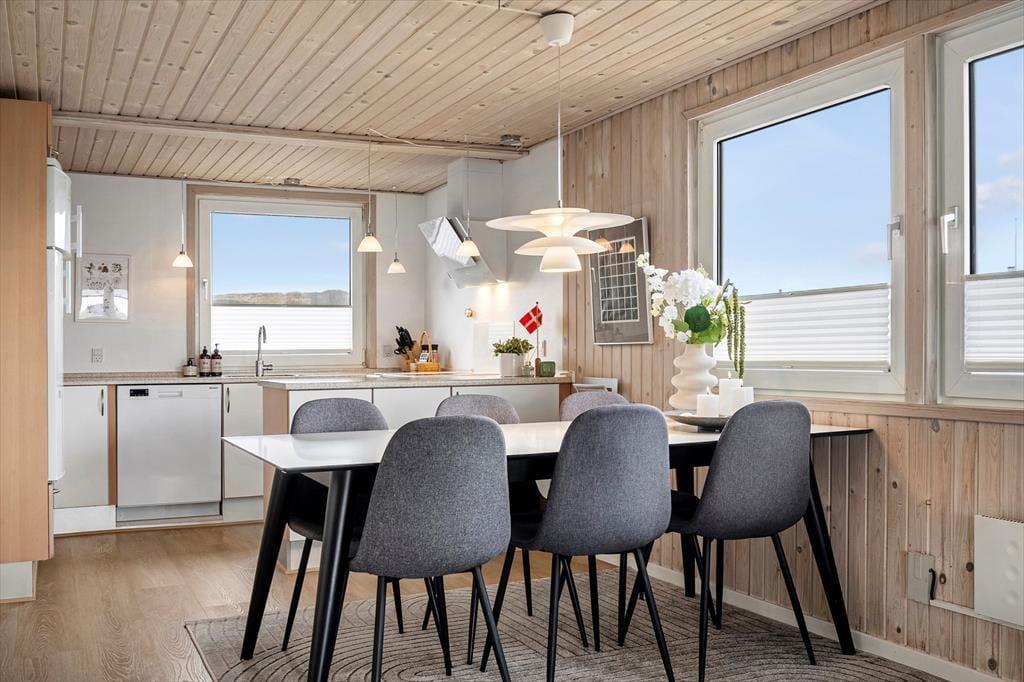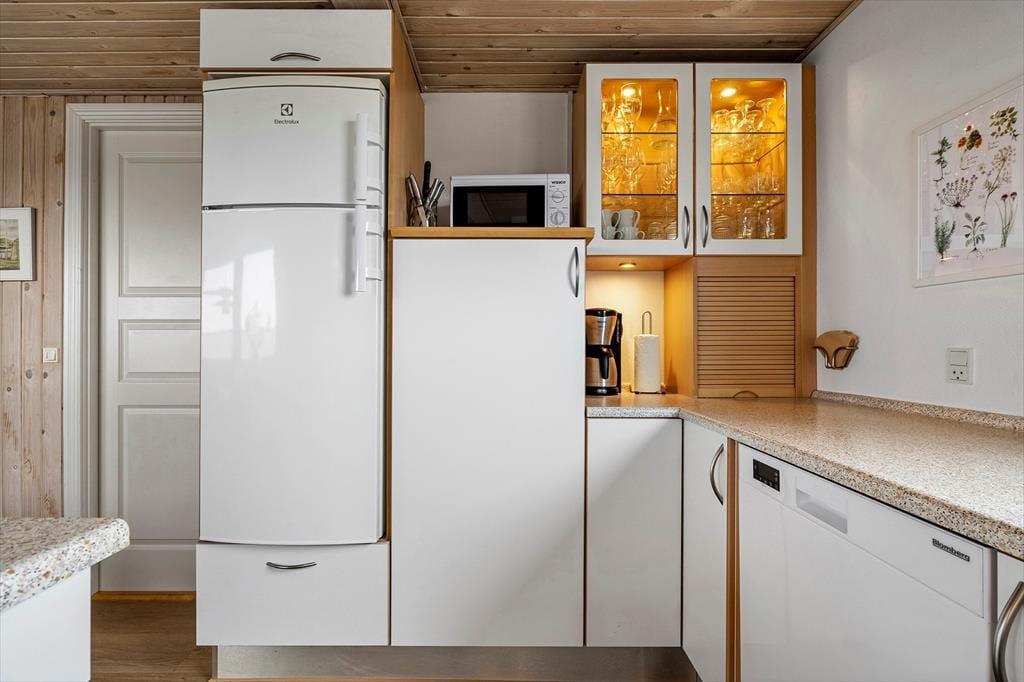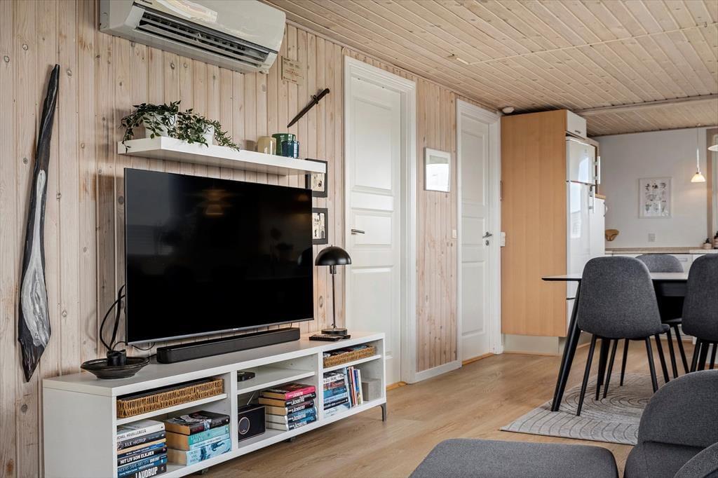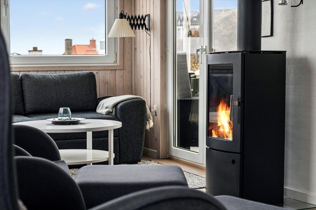 Die Aussicht zieht sich bis ins Wohnzimmer und trägt dazu bei, Ihr Urlaubserlebnis besonders schön zu machen. Sowohl der Esstisch als auch die Sofaecke stehen an den großen Fenstern, während die Sessel des Hauses beim Flachbildschirm platziert sind, sodass Sie beim Fernsehen bequem sitzen können. Das Wohnzimmer verfügt sowohl über einen Kaminofen als auch über eine Wärmepumpe mit Kühlfunktion. An dem einen Ende des Hauses befindet sich die Küche, die mit einem Cerankochfeld, einem Umluftofen, einer Spülmaschine und vielem mehr ausgestattet ist. Die Geschwindigkeit der Wi-Fi-Verbindung ist ein Genuss für alle, die gerne bis spät abends online unterwegs sind oder Filme streamen, dennoch empfiehlt es sich, rechtzeitig ins Bett zu gehen - denn was gibt es Schöneres, als in den Ferien nach einem langen und erholsamen Schlaf ausgeruht zu erwachen? Es gibt zwei Schlafzimmer, von denen eines mit einem Fernseher ausgestattet ist. Auch das Badezimmer ist wie die anderen Räume des Haus geschmackvoll und hell eingerichtet.