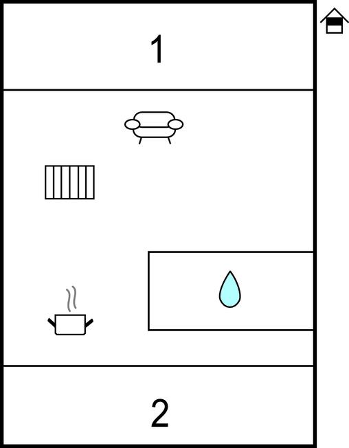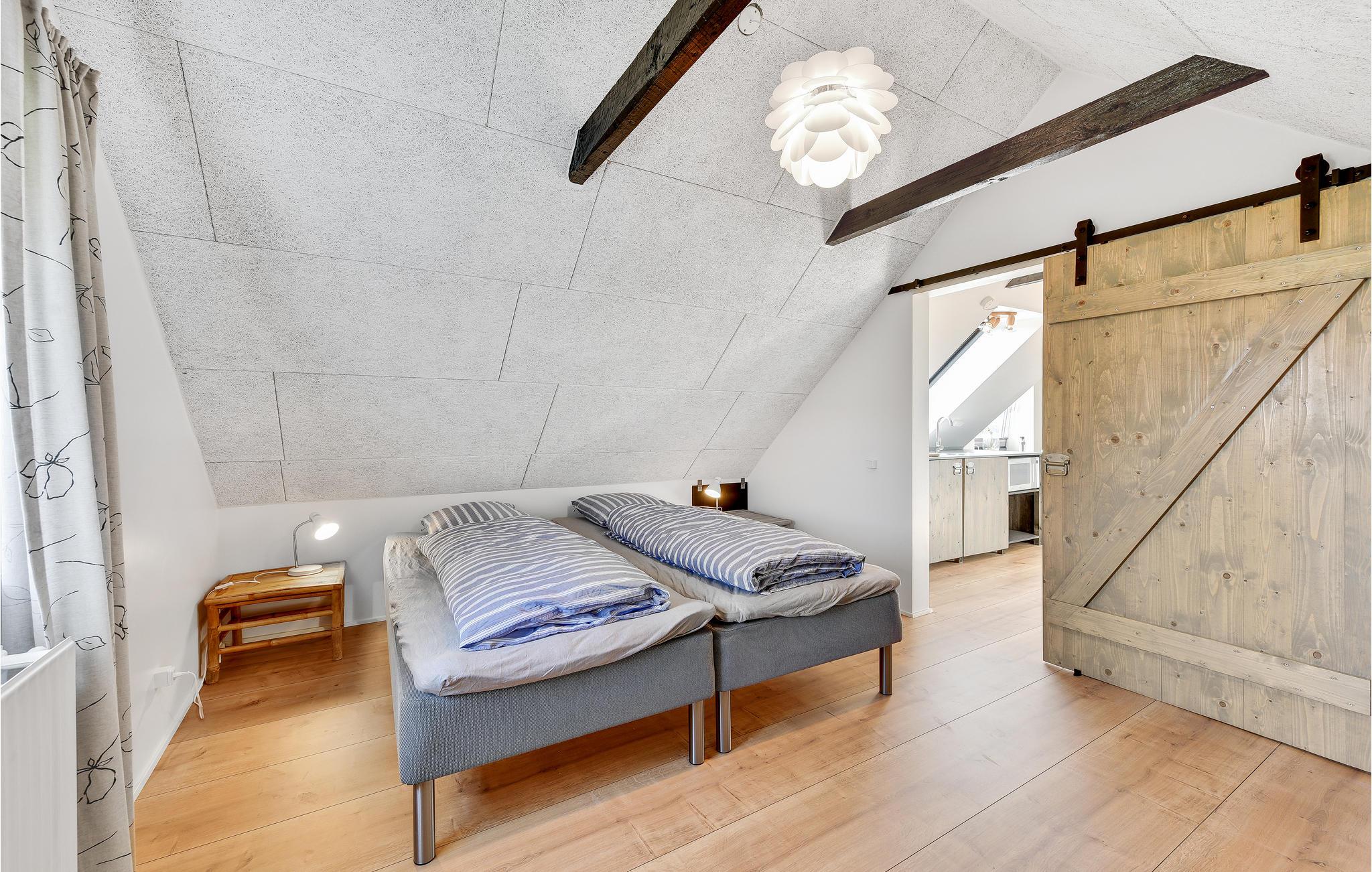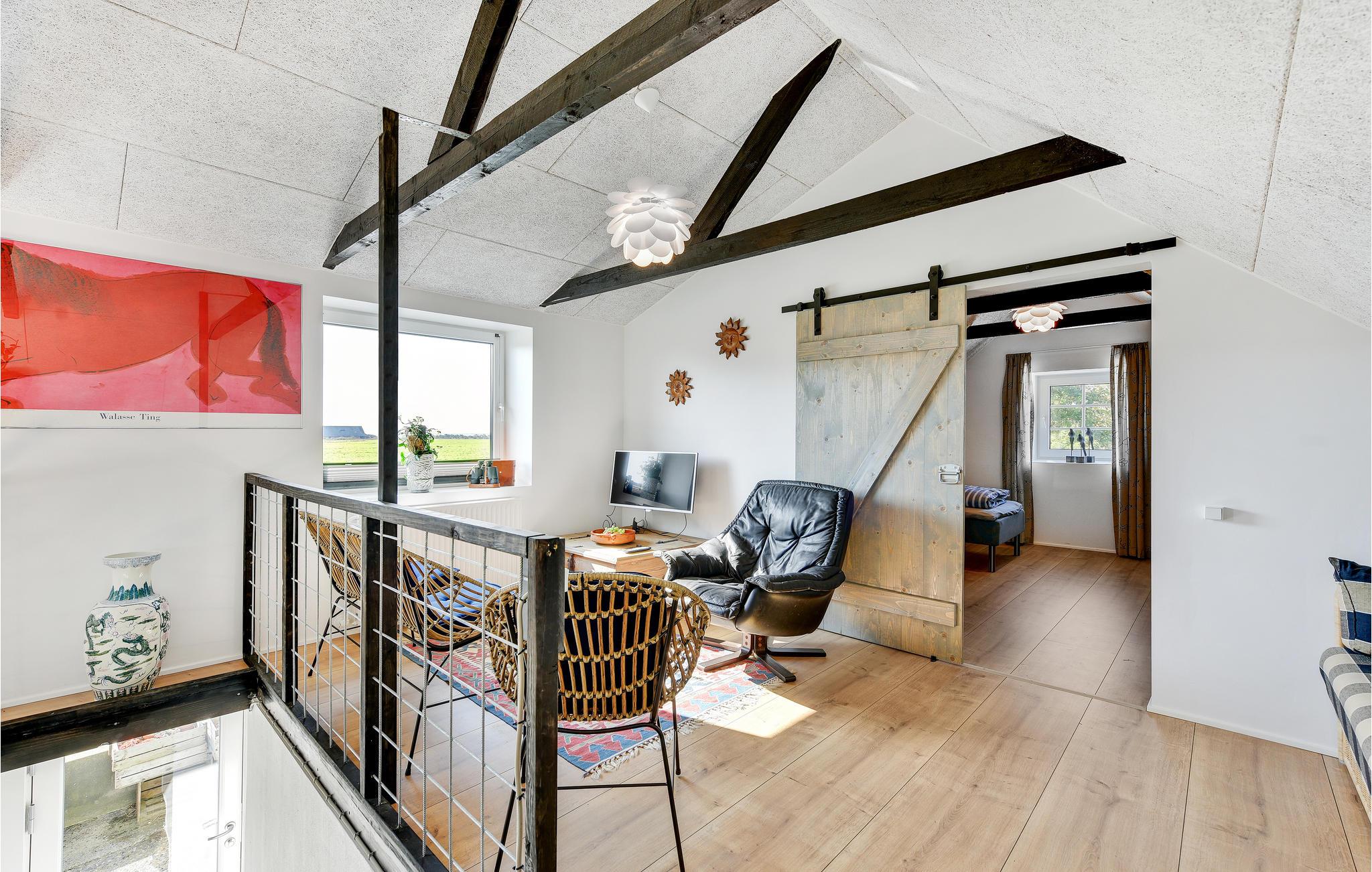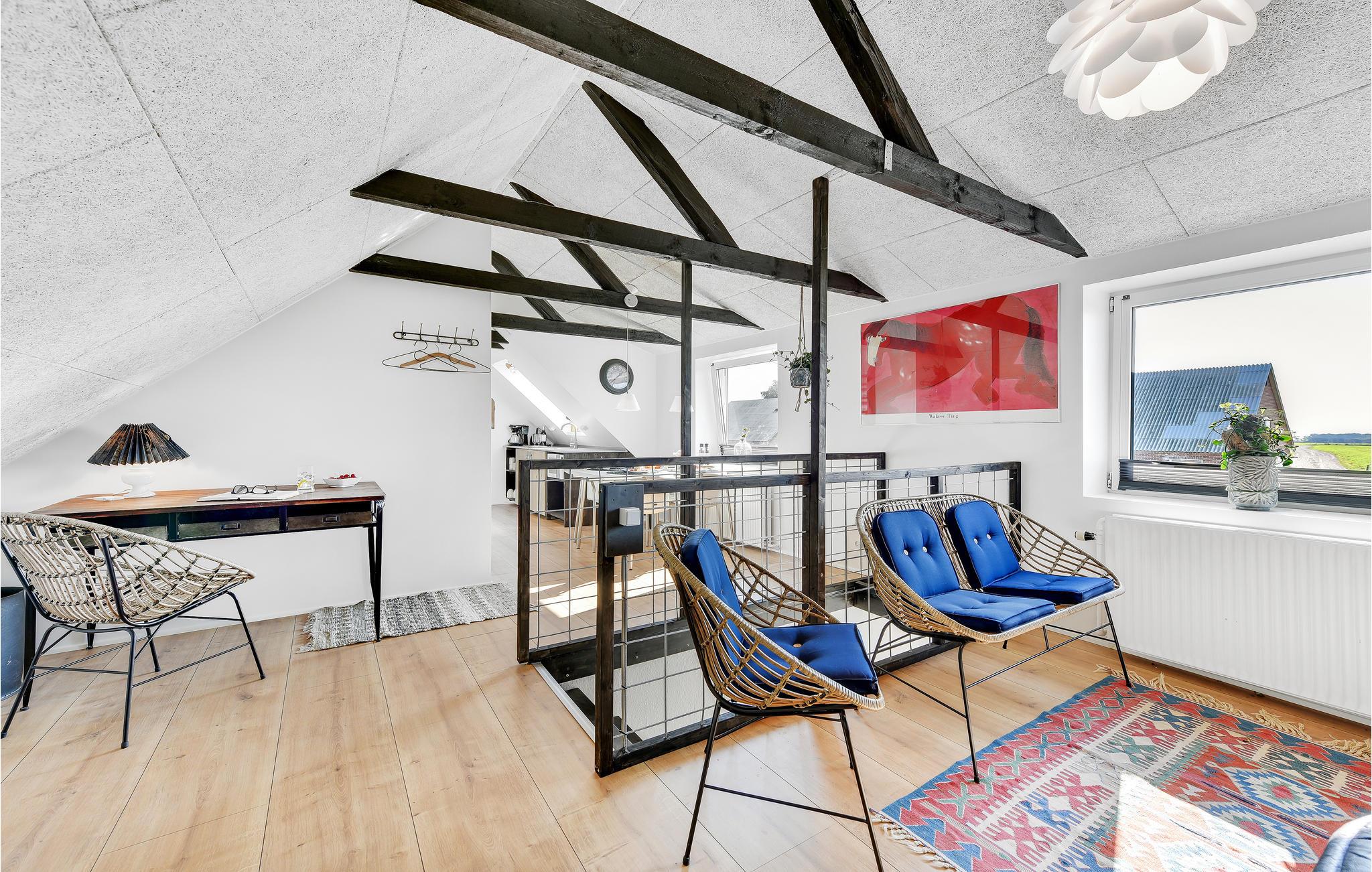 Die Wohnung ist mit 2 Schlafzimmern ausgestattet, Wohnzimmer in offener Verbindung mit Küchenzeile, die einen Mini-Ofen, Waschbecken und 1 Kochfeld hat. Darüber hinaus gibt es ein Badezimmer mit Dusche. Vom Wohnzimmer und der Küche hat man einen fantastischen Blick über die Felder zum Ringkøbing-Fjord und zum Surferparadies am Bagger-Damm. Die Wohnung befindet sich im 1. Stock und ist daher nicht für Menschen mit Gehbehinderung geeignet.
