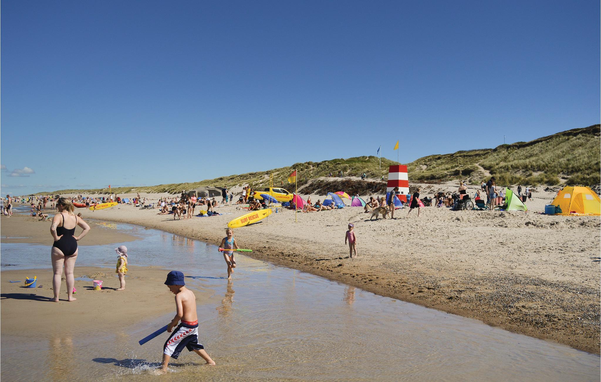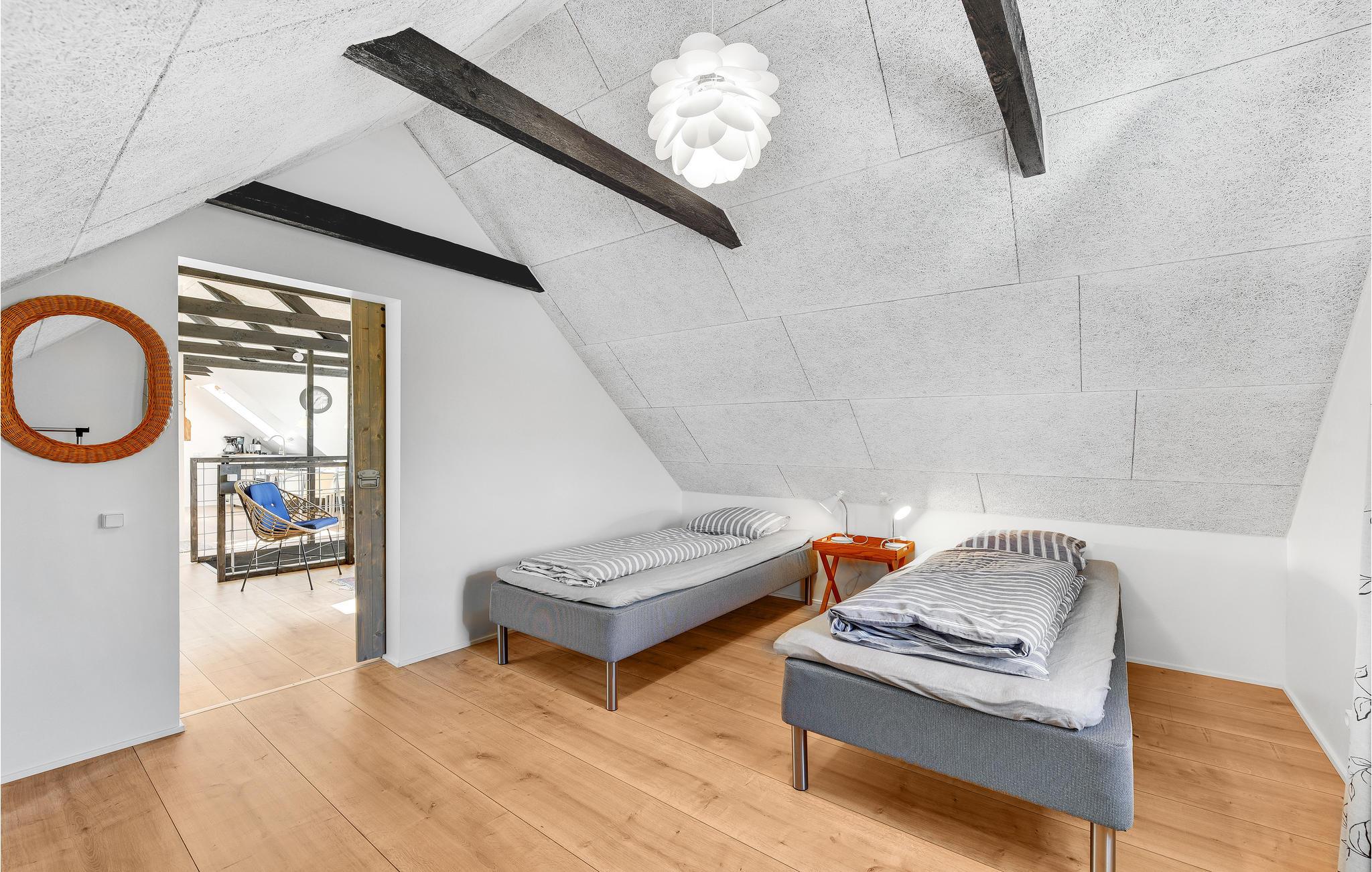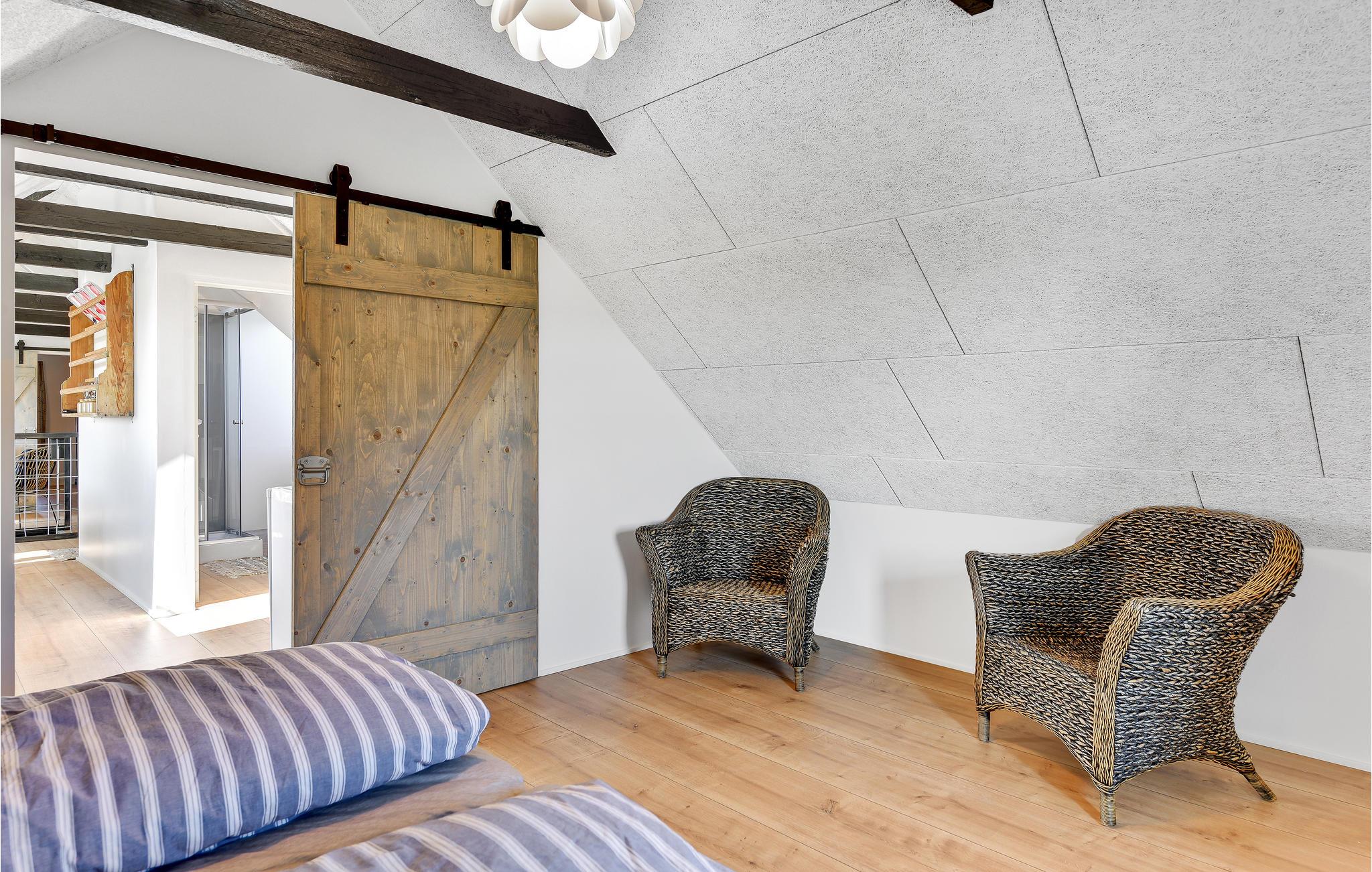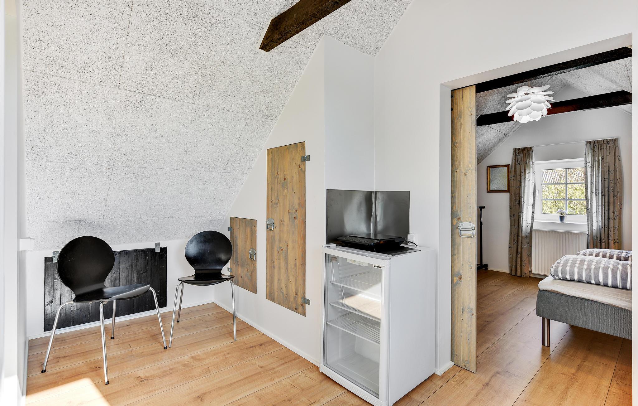 Die Wohnung ist mit 2 Schlafzimmern ausgestattet, Wohnzimmer in offener Verbindung mit Küchenzeile, die einen Mini-Ofen, Waschbecken und 1 Kochfeld hat. Darüber hinaus gibt es ein Badezimmer mit Dusche. Vom Wohnzimmer und der Küche hat man einen fantastischen Blick über die Felder zum Ringkøbing-Fjord und zum Surferparadies am Bagger-Damm. Die Wohnung befindet sich im 1. Stock und ist daher nicht für Menschen mit Gehbehinderung geeignet.