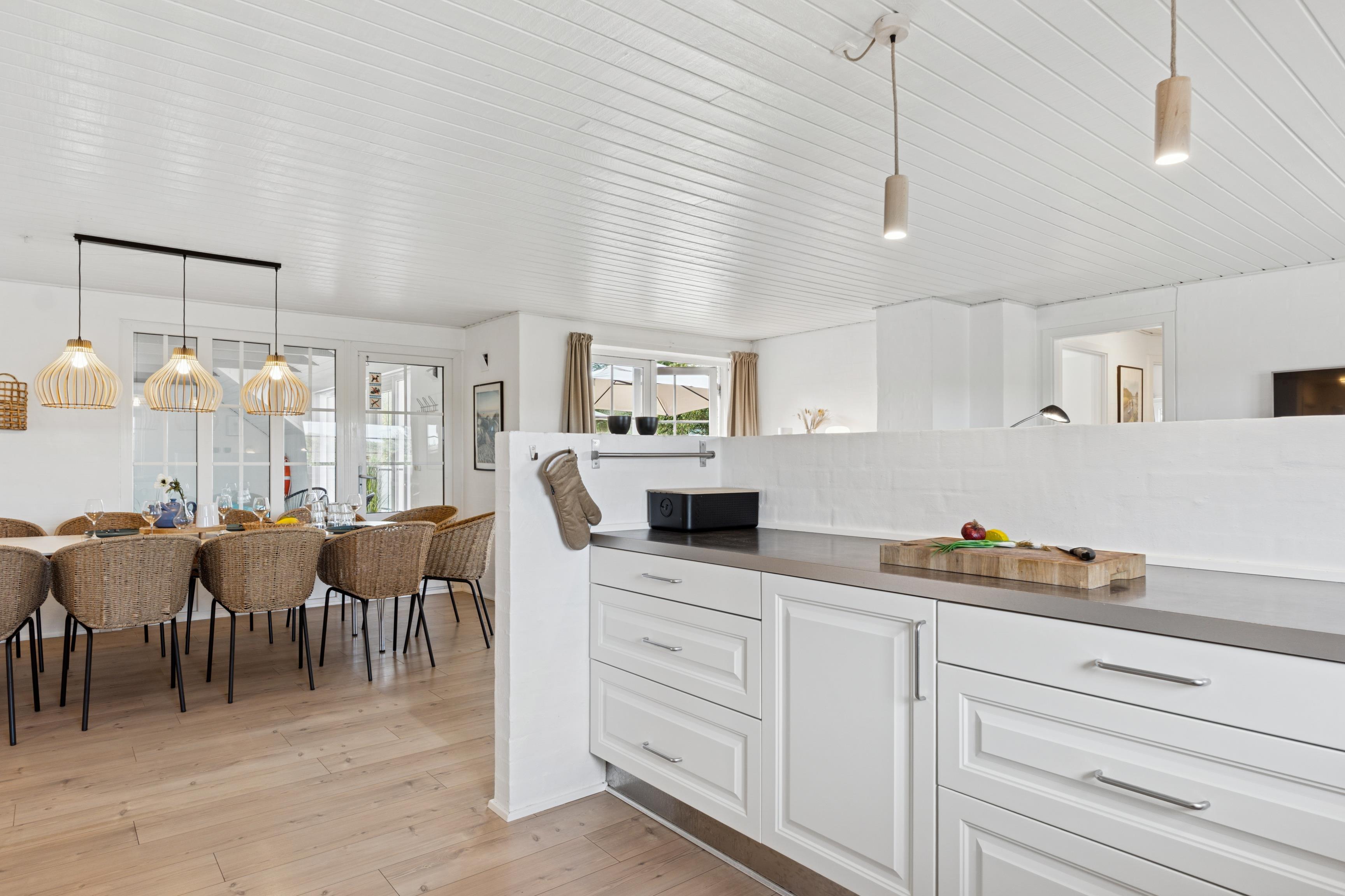 Das Ferienhaus ist mit Blick auf Gemeinschaft und Komfort eingerichtet. Im Herzen des Hauses befindet sich ein großzügiges Wohnzimmer mit offener Küche, das viel Platz für gemeinsame Stunden, gemütliche Mahlzeiten und Entspannung am Kaminofen bietet. Das Wohnzimmer ist mit Flachbild-TV, Satellitenempfang und Playstation ausgestattet, und die großen Fensterfronten führen direkt auf die Terrasse und den Poolbereich. Die Küche ist modern und funktional eingerichtet und verfügt über alles, was Sie brauchen – darunter Geschirrspüler, Mikrowelle und großer Gefrierschrank – damit die Ferienmahlzeiten mühelos zubereitet werden können.