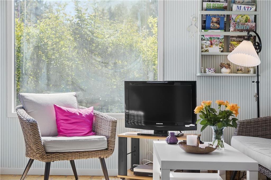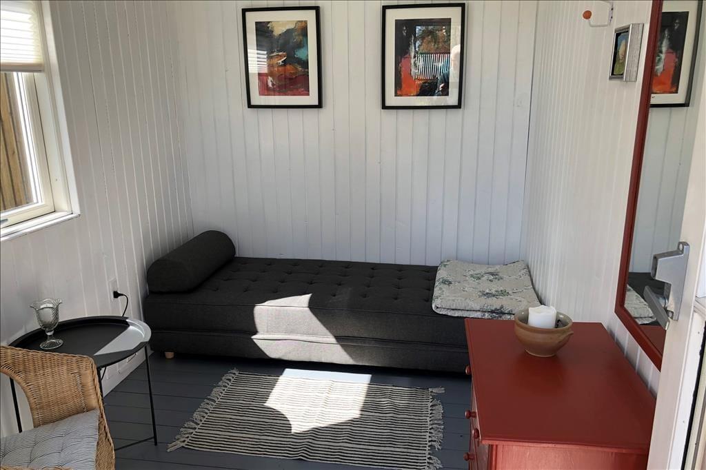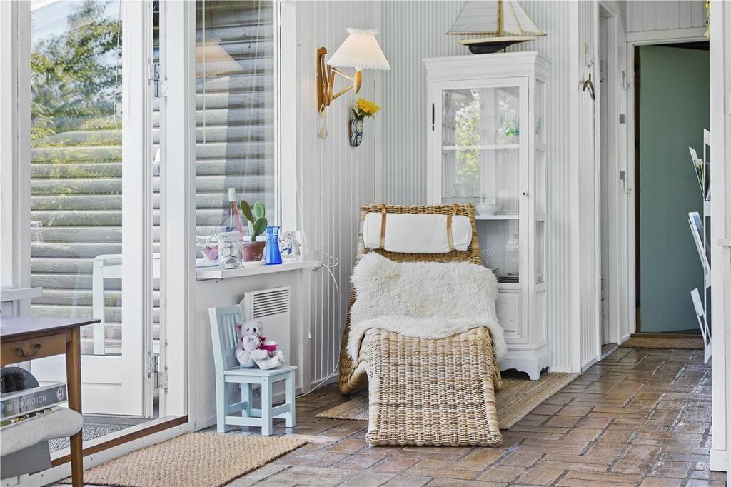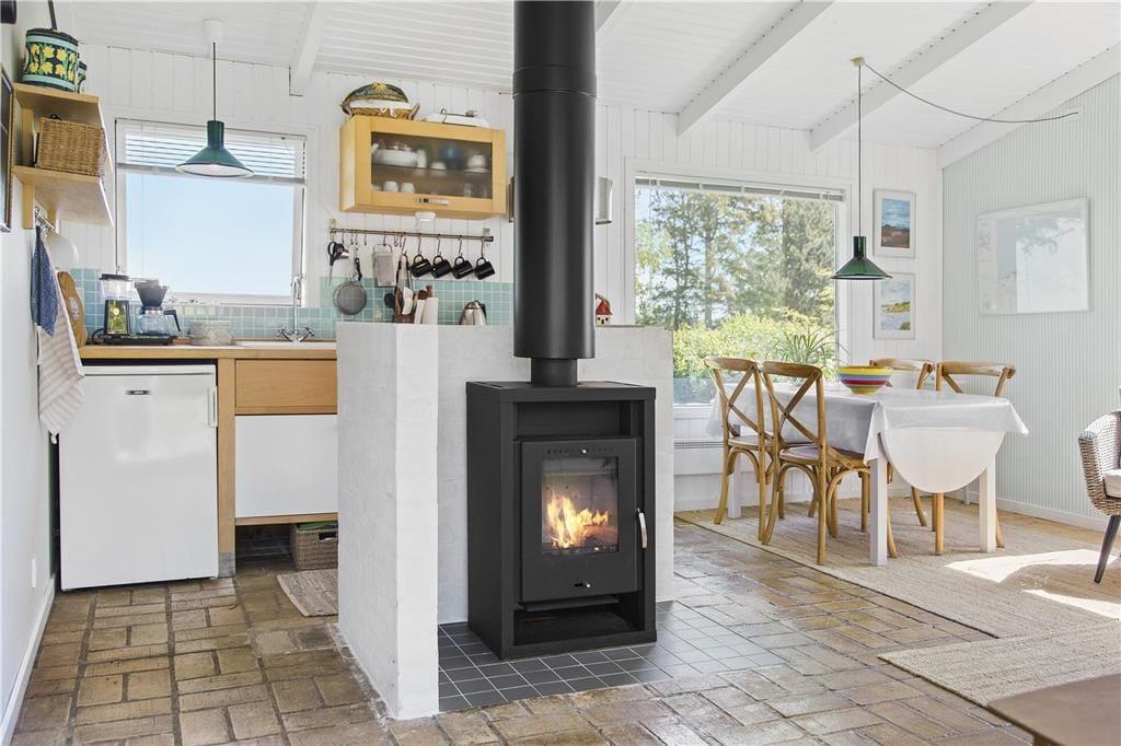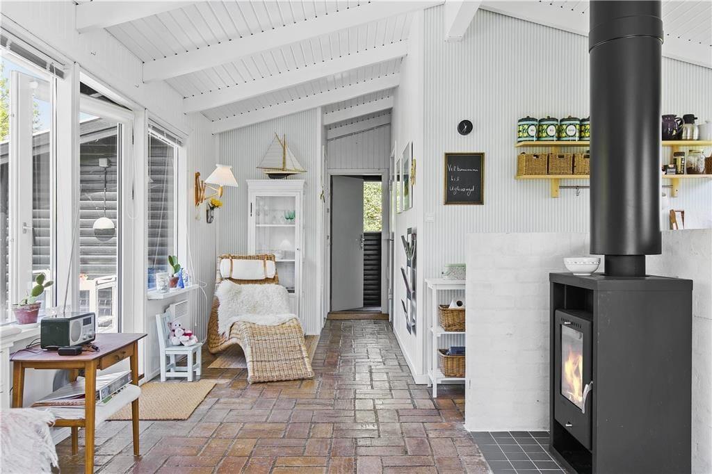 Die offene Küche ist mit dem Wohnzimmer kombiniert und mit Glaskeramikherd, und Kühlschrank mit Gefrierfach ausgestattet. Geschmackvoll eingerichtetes Wohnzimmer mit Essecke, Sofa und Korbmöbeln, Holzofen und Flachbildschirm mit Parabol (dän. und dt. Kanäle). Ausgang auf die Terrasse. Ein Schlafzimmer mit 2 Einzelbetten, und ein gemütlicher Anbau mit einem Einzelbett.