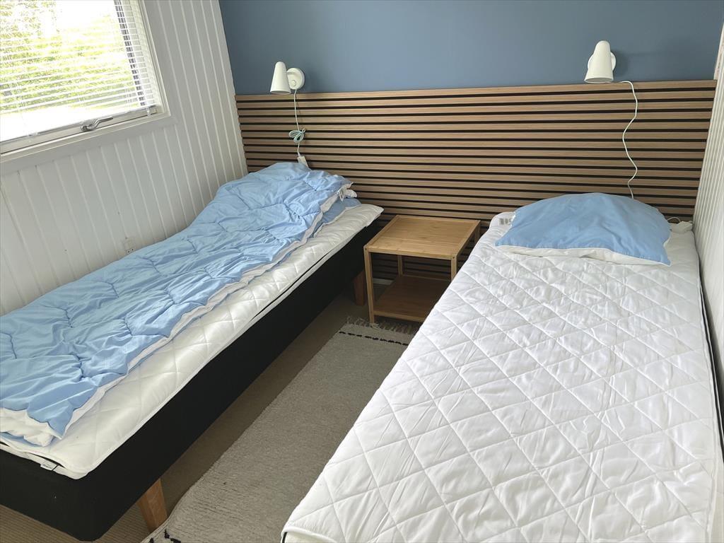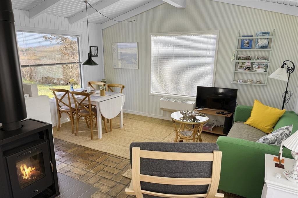 Willkommen in deinem Ferienhaus: Das Ferienhaus verfügt über eine offene Küche und ein Wohnzimmer in einem Raum. Die Küche ist mit einem Keramikkochfeld und einem Kühlschrank mit Gefrierfach ausgestattet. Das geschmackvoll eingerichtete Wohnzimmer bietet Zugang zur Terrasse, einen Essbereich, Kaminofen und TV mit Waoo TV-Paket. Das Badezimmer verfügt über Dusche, Waschmaschine und Fußbodenheizung. Es gibt ein Schlafzimmer mit zwei Einzelbetten sowie einen Anbau mit Schlafsofa. Beheizt wird das Haus über Wärmepumpe, Kaminofen und Elektroheizung.