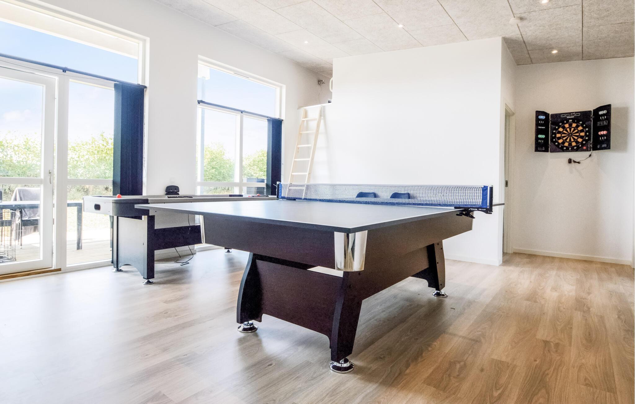 Geräumiges Ferienhaus mit vielen Aktivitätsmöglichkeiten. Hier gibt es einen Aktivitätsraum, wo Sie Ihr Können im Tischtennis, Billard und Kicker unter Beweis stellen können. Danach können Sie im herrlichen Whirlpool für zwei Personen entspannen oder die Wärme in der Sauna genießen. Die Schlafzimmer befinden sich auf zwei Seiten des Hauses, so dass Sie nicht nebeneinander liegen, damit eignet sich das Haus für mehrere Familien. Das Haus verfügt über eine große Küche, die zum Wohnzimmer hin offen ist, hier gibt es große Fenster mit einem schönen Lichteinfall. Auf der Terrasse können Sie den Urlaub genießen und entspannen, während die Kinder im Garten spielen. Der nahegelegene Sandstrand kann das ganze Jahr über genutzt werden.